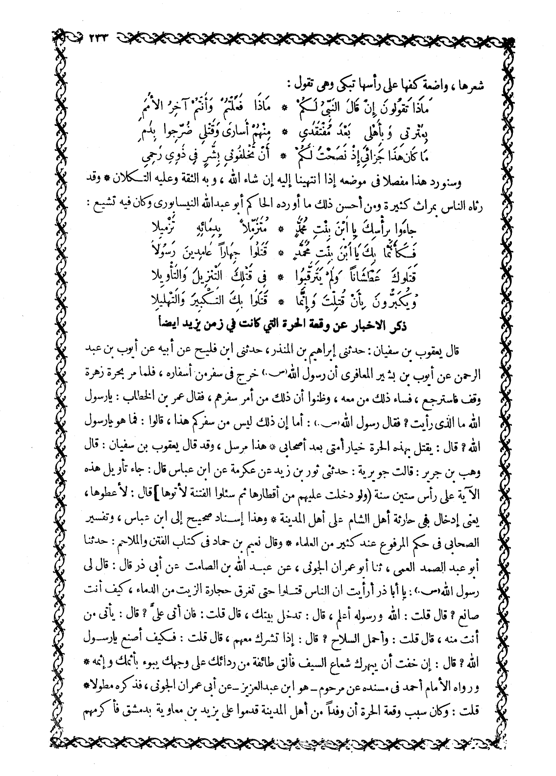 قَالَ يَعْقُوبُ بْنُ سُفْيَانَ: حَدَّثَنِي إِبْرَاهِيمُ بْنُ الْمُنْذِرِ، حَدَّثَنِي ابْنُ فُلَيْحٍ عَنْ أَبِيهِ عَنْ أَيُّوبَ بْنِ عَبْدِ الرحمن عن أيوب بن بشير المعافري أَنَّ رَسُولَ اللَّهِ صَلَّى اللَّهُ عَلَيْهِ وَسَلَّمَ خَرَجَ فِي سَفَرٍ مِنْ أَسْفَارِهِ، فَلَمَّا مَرَّ بِحَرَّةِ زُهْرَةَ وَقَفَ فَاسْتَرْجَعَ، فَسَاءَ ذَلِكَ مَنْ مَعَهُ، وَظَنُّوا أَنَّ ذَلِكَ مِنْ أَمْرِ سَفَرِهِمْ، فَقَالَ عُمَرُ بْنُ الْخَطَّابِ: يَا رَسُولَ اللَّهِ مَا الَّذِي رَأَيْتُ؟ فَقَالَ رَسُولُ اللَّهِ صَلَّى اللَّهُ عَلَيْهِ وَسَلَّمَ: أَمَا إِنَّ ذَلِكَ لَيْسَ مِنْ سَفَرِكُمْ هَذَا، قَالُوا: فَمَا هُوَ يَا رَسُولَ اللَّهِ؟ قَالَ: يُقْتَلُ بِهَذِهِ الْحَرَّةِ خِيَارُ أُمَّتِي بَعْدَ أَصْحَابِي هَذَا مُرْسَلٌ، وَقَدْ قَالَ يَعْقُوبُ بْنُ سُفْيَانَ: قَالَ وَهْبُ بْنُ جَرِيرٍ: قَالَتْ جُوَيْرِيَةُ: حَدَّثَنِي ثَوْرُ بْنُ زَيْدٍ عَنْ عِكْرِمَةَ عَنِ ابْنِ عَبَّاسٍ قَالَ: جَاءَ تَأْوِيلُ هَذِهِ الْآيَةِ عَلَى رَأْسِ سِتِّينَ سَنَةً وَلَوْ دُخِلَتْ عَلَيْهِمْ مِنْ أَقْطارِها ثُمَّ سُئِلُوا الْفِتْنَةَ لَآتَوْها 33: 14 قَالَ: لَأَعْطَوْهَا، يَعْنِي إِدْخَالَ بَنِي حَارِثَةَ أَهْلَ الشَّامِ عَلَى أَهْلِ الْمَدِينَةِ وَهَذَا إِسْنَادٌ صَحِيحٌ إِلَى ابْنِ عَبَّاسٍ، وَتَفْسِيرُ الصَّحَابِيِّ فِي حُكْمِ الْمَرْفُوعِ عِنْدَ كَثِيرٍ مِنَ الْعُلَمَاءِ وَقَالَ نُعَيْمُ بْنُ حَمَّادٍ فِي كِتَابِ الْفِتَنِ وَالْمَلَاحِمِ: حَدَّثَنَا أَبُو عَبْدِ الصَّمَدِ الْعَمِّيُّ، ثَنَا أَبُو عِمْرَانَ الْجَوْنِيُّ، عَنْ عَبْدِ اللَّهِ بْنِ الصَّامِتِ عَنْ أَبِي ذَرٍّ قَالَ: قَالَ لِي رَسُولُ اللَّهِ صَلَّى اللَّهُ عَلَيْهِ وَسَلَّمَ: يَا أَبَا ذَرٍّ أَرَأَيْتَ إِنِ النَّاسُ قُتِلُوا حَتَّى تَغْرَقَ حِجَارَةُ الزَّيْتِ مِنَ الدِّمَاءِ، كَيْفَ أَنْتِ صَانِعٌ؟ قَالَ قُلْتُ: اللَّهُ وَرَسُولُهُ أَعْلَمُ، قَالَ: تَدْخُلُ بَيْتَكَ، قال قلت: فان أتى عليّ؟ قال: يأتى مَنْ أَنْتَ مِنْهُ، قَالَ قُلْتُ: وَأَحْمِلُ السِّلَاحَ؟ قَالَ: إِذًا تُشْرَكَ مَعَهُمْ، قَالَ قُلْتُ: فَكَيْفَ أَصْنَعُ يَا رَسُولَ اللَّهِ؟ قَالَ: إِنْ خِفْتَ أَنْ يَبْهَرَكَ شُعَاعُ السَّيْفِ فَأَلْقِ طَائِفَةً مِنْ رِدَائِكَ عَلَى وَجْهِكَ يَبُوءُ بِإِثْمِكَ وَإِثْمِهِ وَرَوَاهُ الْإِمَامُ أَحْمَدُ فِي مُسْنَدِهِ عَنْ مَرْحُومٍ- هُوَ ابْنُ عَبْدِ الْعَزِيزِ- عَنْ أَبِي عِمْرَانَ الْجَوْنِيِّ، فَذَكَرَهُ مُطَوَّلًا قُلْتُ: وَكَانَ سَبَبُ وَقْعَةِ الْحَرَّةِ أَنَّ وَفْدًا مِنْ أَهْلِ الْمَدِينَةِ قَدِمُوا عَلَى يَزِيدَ بْنِ مُعَاوِيَةَ بِدِمَشْقَ فَأَكْرَمَهُمْ