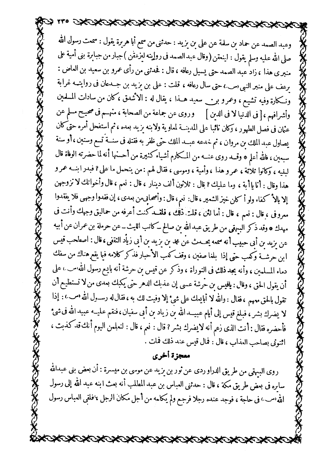 يرعف عَلَى مِنْبَرِ النَّبِيِّ صَلَّى اللَّهُ عَلَيْهِ وَسَلَّمَ حَتَّى سَالَ رُعَافُهُ، قلت: على بن يزيد بْنِ جُدْعَانَ فِي رِوَايَتِهِ غَرَابَةٌ وَنَكَارَةٌ وَفِيهِ تَشَيُّعٌ، وَعَمْرُو بْنُ سَعِيدٍ هَذَا، يُقَالُ لَهُ: الأشدق، كان من سادات المسلمين وأشرافهم، [في الدنيا لا في الدين] [1] وَرَوَى عَنْ جَمَاعَةٍ مِنَ الصَّحَابَةِ، مِنْهُمْ فِي صحيح مسلّم عن عثمان في فصل الطَّهُورِ، وَكَانَ نَائِبًا عَلَى الْمَدِينَةِ لِمُعَاوِيَةَ وَلِابْنِهِ يَزِيدَ بَعْدَهُ، ثُمَّ اسْتَفْحَلَ أَمْرُهُ حَتَّى كَانَ يُصَاوِلُ عَبْدَ الْمَلِكِ بْنَ مَرْوَانَ، ثُمَّ خَدَعَهُ عَبْدُ الْمَلِكِ حَتَّى ظَفِرَ بِهِ فَقَتَلَهُ فِي سَنَةِ تِسْعٍ وَسِتِّينَ، أَوْ سَنَةِ سَبْعِينَ، فاللَّه أَعْلَمُ وَقَدْ رُوِيَ عَنْهُ مِنَ الْمَكَارِمِ أَشْيَاءُ كثيرة من أحسنها أنه لما حضرته الوفاة قال لبنيه، وكانوا ثلاثة، عمر وهذا، وَأُمَيَّةُ، وَمُوسَى، فَقَالَ لَهُمْ: مَنْ يَتَحَمَّلُ مَا عَلَيَّ؟ فَبَدَرَ ابْنُهُ عَمْرٌو هَذَا وَقَالَ: أَنَا يَا أَبَهْ، وَمَا عَلَيْكَ؟ قَالَ: ثَلَاثُونَ أَلْفَ دِينَارٍ، قَالَ: نَعَمْ، قَالَ وَأَخَوَاتُكَ لَا تُزَوِّجْهُنَّ إِلَّا بِالْأَكْفَاءِ وَلَوْ أَكَلْنَ خُبْزَ الشَّعِيرِ، قَالَ: نَعَمْ، قَالَ: وَأَصْحَابِي مِنْ بَعْدِي، إِنْ فَقَدُوا وَجْهِي فَلَا يَفْقِدُوا مَعْرُوفِي، قَالَ: نَعَمْ، قَالَ: أَمَا لَئِنْ، قُلْتَ ذَلِكَ، فَلَقَدْ كُنْتُ أَعْرِفُهُ مِنْ حَمَالِيقِ وَجْهِكَ وَأَنْتَ فِي مَهْدِكَ وَقَدْ ذَكَرَ الْبَيْهَقِيُّ مِنْ طَرِيقِ عَبْدِ اللَّهِ بْنِ صَالِحٍ- كَاتِبِ اللَّيْثِ- عَنْ حَرْمَلَةَ بْنِ عِمْرَانَ عن أبيه عَنْ يَزِيدَ بْنِ أَبِي حَبِيبٍ أَنَّهُ سَمِعَهُ يُحَدِّثُ عَنْ مُحَمَّدِ بْنِ يَزِيدَ بْنِ أَبِي زِيَادٍ الثقفي، قال: اصطحب قيس ابن حرشة وَكَعْبٌ حَتَّى إِذَا بَلَغَا صِفِّينَ، وَقَفَ كَعْبُ الْأَحْبَارِ فَذَكَرَ كَلَامَهُ فِيمَا يَقَعُ هُنَاكَ مِنْ سَفْكِ دِمَاءِ الْمُسْلِمِينَ، وَأَنَّهُ يَجِدُ ذَلِكَ فِي التوراة، وذكر عن قيس بن حرشة أَنَّهُ بَايَعَ رَسُولَ اللَّهِ صَلَّى اللَّهُ عَلَيْهِ وَسَلَّمَ على أن يقول الحق، وقال: يا قيس بن حرشة عسى إن عذبك الدهر حتى يكبك بَعْدِي مَنْ لَا تَسْتَطِيعُ أَنْ تَقُولَ بِالْحَقِّ مَعَهُمْ، فَقَالَ: وَاللَّهِ لَا أُبَايِعُكَ عَلَى شَيْءٍ إِلَّا وَفَّيْتُ لَكَ بِهِ، فَقَالَ لَهُ رَسُولُ اللَّهِ صَلَّى اللَّهُ عَلَيْهِ وَسَلَّمَ: إِذَا لَا يَضُرُّكَ بَشَرٌ، فَبَلَغَ قَيْسٌ إِلَى أَيَّامِ عُبَيْدِ اللَّهِ بْنِ زِيَادِ بْنِ أَبِي سُفْيَانَ، فَنِقَمَ عَلَيْهِ عُبَيْدُ اللَّهِ فِي شَيْءٍ فَأَحْضَرَهُ فَقَالَ: أنت الّذي زعم أَنَّهُ لَا يَضُرُّكَ بَشَرٌ؟ قَالَ: نَعَمْ، قَالَ: لَتَعْلَمَنَّ الْيَوْمَ أَنَّكَ قَدْ كَذَبْتَ، ائْتُونِي بِصَاحِبِ الْعَذَابِ، قَالَ: فَمَالَ قَيْسٌ عِنْدَ ذَلِكَ فَمَاتَ.