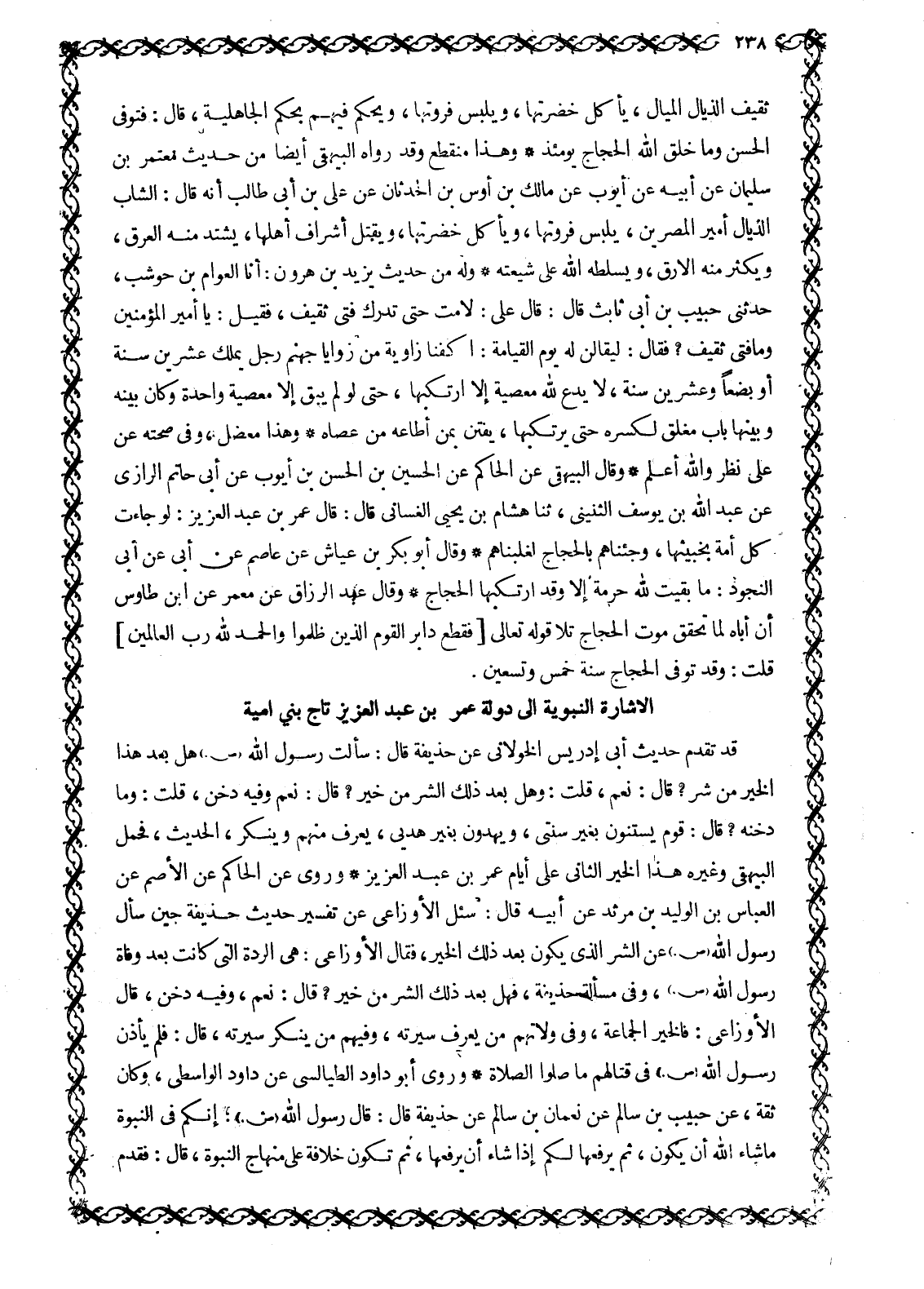 ذِكْرُ الْإِشَارَةِ النَّبَوِيَّةِ إِلَى دَوْلَةِ عُمَرَ بْنِ عَبْدِ الْعَزِيزِ، تَاجِ بَنِي أُمَيَّةَ