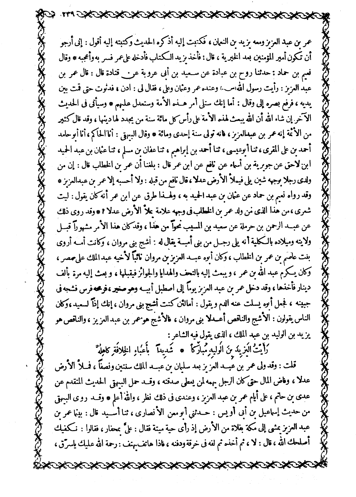 عُمَرُ بْنُ عَبْدِ الْعَزِيزِ وَمَعَهُ يَزِيدُ بْنُ النعمان، فكتبت إليه أذكره الحديث وكتبته إِلَيْهِ أَقُولُ: إِنِّي أَرْجُو أَنْ تَكُونَ أَمِيرَ المؤمنين بعد الخيرية، قَالَ: فَأَخَذَ يَزِيدُ الْكِتَابَ فَأَدْخَلَهُ عَلَى عُمَرَ فَسُرَّ بِهِ وَأَعْجَبَهُ وَقَالَ نُعَيْمُ بْنُ حَمَّادٍ: حَدَّثَنَا رَوْحُ بْنُ عُبَادَةَ عَنْ سَعِيدِ بْنِ أَبِي عَرُوبَةَ عَنْ قَتَادَةَ قَالَ: قَالَ عُمَرُ بْنُ عَبْدِ الْعَزِيزِ: رَأَيْتُ رَسُولَ اللَّهِ صَلَّى اللَّهُ عَلَيْهِ وَسَلَّمَ وعنده عمر وعثمان وعلى، فقال لي: ادن، فَدَنَوْتُ حَتَّى قُمْتُ بَيْنَ يَدَيْهِ، فَرَفَعَ بَصَرَهُ إِلَيَّ وَقَالَ: أَمَا إِنَّكَ سَتَلِي أَمْرَ هَذِهِ الْأُمَّةِ وَسَتَعْدِلُ عَلَيْهِمْ وَسَيَأْتِي فِي الْحَدِيثِ الْآخَرِ إِنْ شَاءَ اللَّهُ أَنَّ اللَّهَ يَبْعَثُ لِهَذِهِ الْأُمَّةِ عَلَى رَأْسِ كُلِّ مِائَةِ سَنَةٍ مَنْ يُجَدِّدُ لَهَا دِينَهَا، وَقَدْ قَالَ كَثِيرٌ مِنَ الْأَئِمَّةِ إِنَّهُ عُمَرُ بْنُ عَبْدِ الْعَزِيزِ، فَإِنَّهُ تولى سَنَةَ إِحْدَى وَمِائَةٍ وَقَالَ الْبَيْهَقِيُّ: أَنَا الْحَاكِمُ، أَنَا أَبُو حَامِدٍ أَحْمَدُ بْنُ عَلِيٍّ المقري، ثَنَا أَبُو عِيسَى، ثَنَا أَحْمَدُ بْنُ إِبْرَاهِيمَ، ثَنَا عَفَّانُ بْنُ مُسْلِمٍ، ثَنَا عُثْمَانُ بْنُ عبد الحميد ابن لَاحِقٍ عَنْ جُوَيْرِيَّةَ بْنِ أَسْمَاءَ عَنْ نَافِعٍ عن ابن عمر قَالَ: بَلَغَنَا أَنَّ عُمَرَ بْنَ الْخَطَّابِ قَالَ: إِنَّ مِنْ وَلَدِي رَجُلًا بِوَجْهِهِ شَيْنٌ يَلِي فَيَمْلَأُ الْأَرْضَ عَدْلًا، قَالَ نَافِعٌ مِنْ قِبَلِهِ: وَلَا أَحْسَبُهُ إِلَّا عُمَرَ بْنَ عَبْدِ الْعَزِيزِ وَقَدْ رَوَاهُ نُعَيْمُ بْنُ حَمَّادٍ عَنْ عُثْمَانَ بن عبد الحميد به، وَلِهَذَا طَرُقٌ عَنِ ابْنِ عُمَرَ أَنَّهُ كَانَ يَقُولُ: لَيْتَ شِعْرِي، مَنْ هَذَا الَّذِي مِنْ وَلَدِ عُمَرَ بْنِ الْخَطَّابِ فِي وَجْهِهِ عَلَامَةٌ يَمْلَأُ الْأَرْضَ عَدْلًا؟ وَقَدْ رُوِيَ ذَلِكَ عَنْ عَبْدِ الرَّحْمَنِ بْنِ حَرْمَلَةَ عَنْ سَعِيدِ بن الْمُسَيَّبِ نَحْوًا مِنْ هَذَا، وَقَدْ كَانَ هَذَا الْأَمْرُ مَشْهُورًا قَبْلَ وِلَايَتِهِ وَمِيلَادِهِ بِالْكُلِّيَّةِ أَنَّهُ يَلِي رَجُلٌ مِنْ بَنِي أُمَيَّةَ يُقَالُ لَهُ: أَشُجُّ بَنِي مَرْوَانَ، وَكَانَتْ أُمُّهُ أَرْوَى بِنْتَ عَاصِمِ بْنِ عُمَرَ بْنِ الْخَطَّابِ، وَكَانَ أَبُوهُ عَبْدَ الْعَزِيزِ بْنَ مَرْوَانَ نَائِبًا لِأَخِيهِ عَبْدِ الْمَلِكِ عَلَى مِصْرَ، وَكَانَ يُكْرِمُ عَبْدَ اللَّهِ بْنَ عُمَرَ، وَيَبْعَثُ إِلَيْهِ بِالتُّحَفِ وَالْهَدَايَا وَالْجَوَائِزِ فَيَقْبَلُهَا، وَبَعَثَ إِلَيْهِ مَرَّةً بِأَلْفِ دِينَارٍ فَأَخَذَهَا، وَقَدْ دَخَلَ عُمَرُ بْنُ عَبْدِ الْعَزِيزِ يَوْمًا إلى اصطبل أبيه وهو صعير، فَرَمَحَهُ فَرَسٌ فَشَجَّهُ فِي جَبِينِهِ، فَجَعَلَ أَبُوهُ يَسْلُتُ عَنْهُ الدَّمَ وَيَقُولُ: أَمَّا لَئِنْ كُنْتَ أَشَجَّ بَنِي مَرْوَانَ، إِنَّكَ إِذًا لَسَعِيدٌ، وَكَانَ الناس يقولون: الأشج والناقص أعدلا بَنِي مَرْوَانَ، فَالْأَشَجُّ هُوَ عُمَرُ بْنُ عَبْدِ الْعَزِيزِ، وَالنَّاقِصُ هُوَ يَزِيدُ بْنُ الْوَلِيدِ بْنِ عَبْدِ الْمَلِكِ، الَّذِي يَقُولُ فِيهِ الشَّاعِرَ: