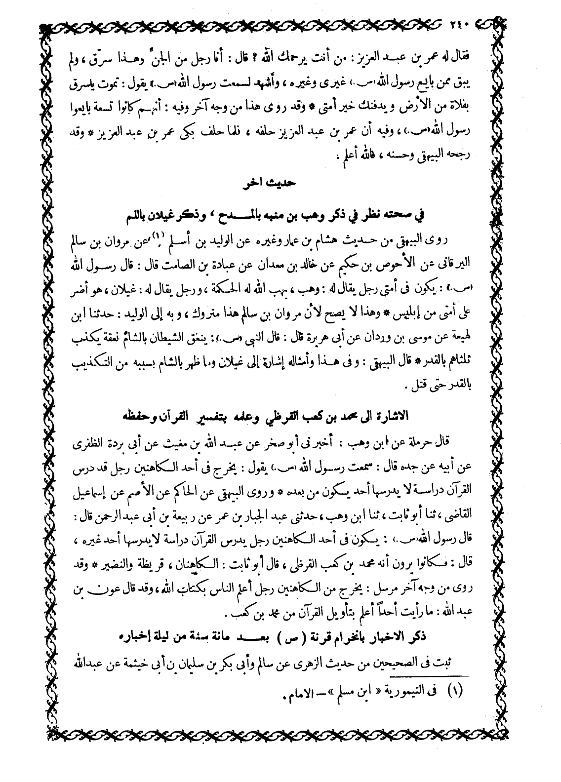 فِي صِحَّتِهِ نَظَرٌ فِي ذِكْرِ وَهْبِ بْنِ مُنَبِّهٍ بِالْمَدْحِ، وَذِكْرُ غَيْلَانَ بِالذَّمِّ رَوَى الْبَيْهَقِيُّ مِنْ حَدِيثِ هِشَامِ بْنِ عَمَّارٍ وغيره عن الوليد بن أسلّم [1] عن مروان بن سالم اليرقانى عَنِ الْأَحْوَصِ بْنِ حَكِيمٍ عَنْ خَالِدِ بْنِ مَعْدَانَ عَنْ عُبَادَةَ بْنِ الصَّامِتِ قَالَ: قَالَ رَسُولُ اللَّهِ صَلَّى اللَّهُ عَلَيْهِ وَسَلَّمَ: يَكُونُ فِي أُمَّتَيْ رَجُلٌ يُقَالُ لَهُ: وَهْبٌ، يَهَبُ اللَّهُ لَهُ الْحِكْمَةَ، وَرَجُلٌ يُقَالُ لَهُ: غَيْلَانُ، هُوَ أَضَرُّ عَلَى أُمَّتِي مِنْ إِبْلِيسَ وَهَذَا لَا يَصِحُّ لِأَنَّ مَرْوَانَ بْنَ سَالِمٍ هَذَا مَتْرُوكٌ، وَبِهِ إِلَى الْوَلِيدِ: حَدَّثَنَا ابْنُ لَهِيعَةَ عَنْ مُوسَى بْنِ وَرْدَانَ عَنْ أَبِي هُرَيْرَةَ قَالَ: قَالَ النَّبِيُّ صَلَّى اللَّهُ عَلَيْهِ وَسَلَّمَ: يَنْعِقُ الشَّيْطَانُ بِالشَّامِ نَعَقَةً يُكَذِّبُ ثُلُثَاهُمْ بِالْقَدَرِ قال البيهقي: وفي هذا وأمثاله إِشَارَةٌ إِلَى غَيْلَانَ وَمَا ظَهَرَ بِالشَّامِ بِسَبَبِهِ من التكذيب بالقدر حتى قتل.