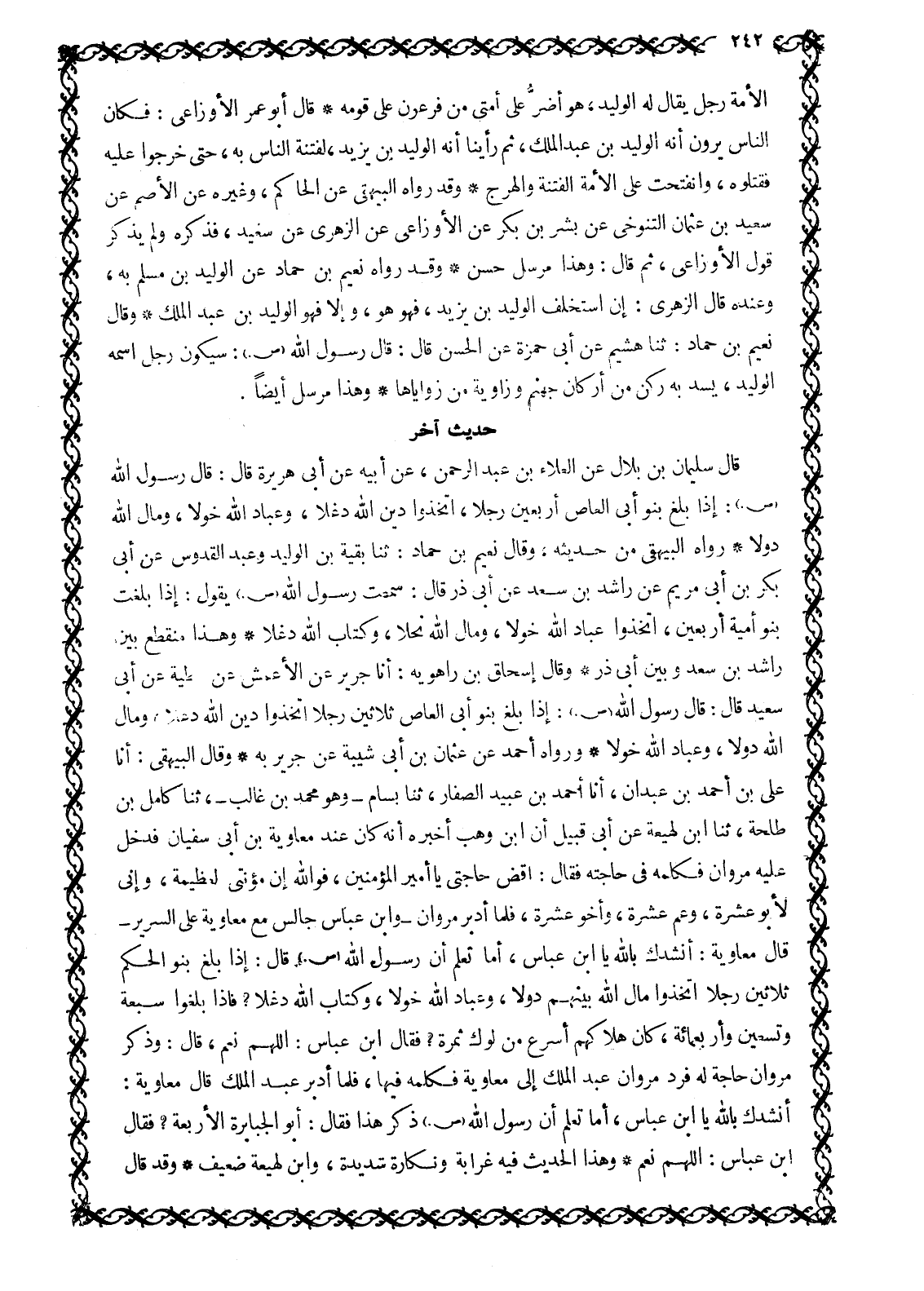 قَالَ سُلَيْمَانُ بْنُ بِلَالٍ عَنِ الْعَلَاءِ بْنِ عَبْدِ الرَّحْمَنِ، عَنْ أَبِيهِ عَنْ أَبِي هُرَيْرَةَ قَالَ: قَالَ رَسُولُ اللَّهِ صَلَّى اللَّهُ عَلَيْهِ وَسَلَّمَ: إِذَا بَلَغَ بَنُو أَبِي الْعَاصِ أَرْبَعِينَ رَجُلًا، اتَّخَذُوا دِينَ اللَّهِ دَغَلًا، وَعِبَادَ اللَّهِ خَوَلًا، وَمَالَ اللَّهِ دُوَلًا رَوَاهُ الْبَيْهَقِيُّ مِنْ حَدِيثِهِ، وَقَالَ نُعَيْمُ بْنُ حَمَّادٍ: ثَنَا بَقِيَّةُ بْنُ الْوَلِيدِ وَعَبْدُ الْقُدُّوسِ عَنْ أَبِي بَكْرِ بْنِ أَبِي مَرْيَمَ عَنْ رَاشِدِ بْنِ سَعْدٍ عَنْ أَبِي ذَرٍّ قَالَ: سَمِعْتُ رَسُولَ اللَّهِ صَلَّى اللَّهُ عَلَيْهِ وَسَلَّمَ يَقُولُ: إِذَا بَلَغَتْ بَنُو أُمَيَّةَ أَرْبَعِينَ، اتَّخَذُوا عِبَادَ اللَّهِ خَوَلًا، وَمَالَ اللَّهِ نُحْلًا، وَكِتَابَ اللَّهِ دَغَلًا وَهَذَا مُنْقَطِعٌ بَيْنَ رَاشِدِ بْنِ سَعْدٍ وَبَيْنَ أَبِي ذَرٍّ وَقَالَ إِسْحَاقُ بْنُ رَاهْوَيْهِ: أَنَا جَرِيرٌ عَنِ الْأَعْمَشِ عَنْ عَطِيَّةَ عَنْ أَبِي سَعِيدٍ قَالَ: قَالَ رَسُولُ اللَّهِ صَلَّى اللَّهُ عَلَيْهِ وَسَلَّمَ: إِذَا بَلَغَ بَنُو أَبِي الْعَاصِ ثَلَاثِينَ رَجُلًا اتَّخَذُوا دِينَ اللَّهِ دَغَلًا، وَمَالَ اللَّهِ دُوَلًا، وَعِبَادَ اللَّهِ خَوَلًا وَرَوَاهُ أَحْمَدُ عَنْ عُثْمَانَ بْنِ أَبِي شَيْبَةَ عَنْ جَرِيرٍ بِهِ وَقَالَ الْبَيْهَقِيُّ: أَنَا عَلِيُّ بْنُ أَحْمَدَ بْنِ عَبْدَانَ، أَنَا أَحْمَدُ بْنُ عُبَيْدٍ الصَّفَّارُ، ثَنَا بسام- وَهُوَ مُحَمَّدُ بْنُ غَالِبٍ-، ثَنَا كَامِلُ بْنُ طَلْحَةَ، ثَنَا ابْنُ لَهِيعَةَ عَنْ أَبِي قُبَيْلٍ أن ابن وهب أَخْبَرَهُ أَنَّهُ كَانَ عِنْدَ مُعَاوِيَةَ بْنِ أَبِي سُفْيَانَ فَدَخَلَ عَلَيْهِ مَرْوَانُ فَكَلَّمَهُ فِي حَاجَتِهِ فقال: اقض حاجتي يا أمير المؤمنين، فو الله إِنَّ مُؤْنَتِي لَعَظِيمَةٌ، وَإِنِّي لَأَبُو عَشَرَةٍ، وَعَمُّ عَشَرَةٍ، وَأَخُو عَشَرَةٍ، فَلَمَّا أَدَبَرَ مَرْوَانُ- وَابْنُ عَبَّاسٍ جَالِسٌ مَعَ مُعَاوِيَةَ عَلَى السَّرِيرِ- قَالَ مُعَاوِيَةُ: أَنْشُدُكَ باللَّه يَا ابْنَ عَبَّاسٍ، أَمَا تَعْلَمُ أَنَّ رَسُولَ اللَّهِ صَلَّى اللَّهُ عَلَيْهِ وَسَلَّمَ قَالَ: إِذَا بَلَغَ بَنُو الْحَكَمِ ثَلَاثِينَ رَجُلًا اتَّخَذُوا مَالَ اللَّهِ بَيْنَهُمْ دُوَلًا، وَعِبَادَ اللَّهِ خَوَلًا، وَكِتَابَ اللَّهِ دَغَلًا؟ فَإِذَا بَلَغُوا سَبْعَةً وَتِسْعِينَ وَأَرْبَعَمِائَةٍ، كَانَ هَلَاكُهُمْ أَسْرَعَ مِنْ لَوْكِ ثمرة؟ فَقَالَ ابْنُ عَبَّاسٍ: اللَّهمّ نَعَمْ، قَالَ: وَذَكَرَ مَرْوَانُ حَاجَةً لَهُ فَرَدَّ مَرْوَانُ عَبْدَ الْمَلِكِ إِلَى مُعَاوِيَةَ فَكَلَّمَهُ فِيهَا، فَلَمَّا أَدْبَرَ عَبْدُ الْمَلِكِ قَالَ مُعَاوِيَةُ: