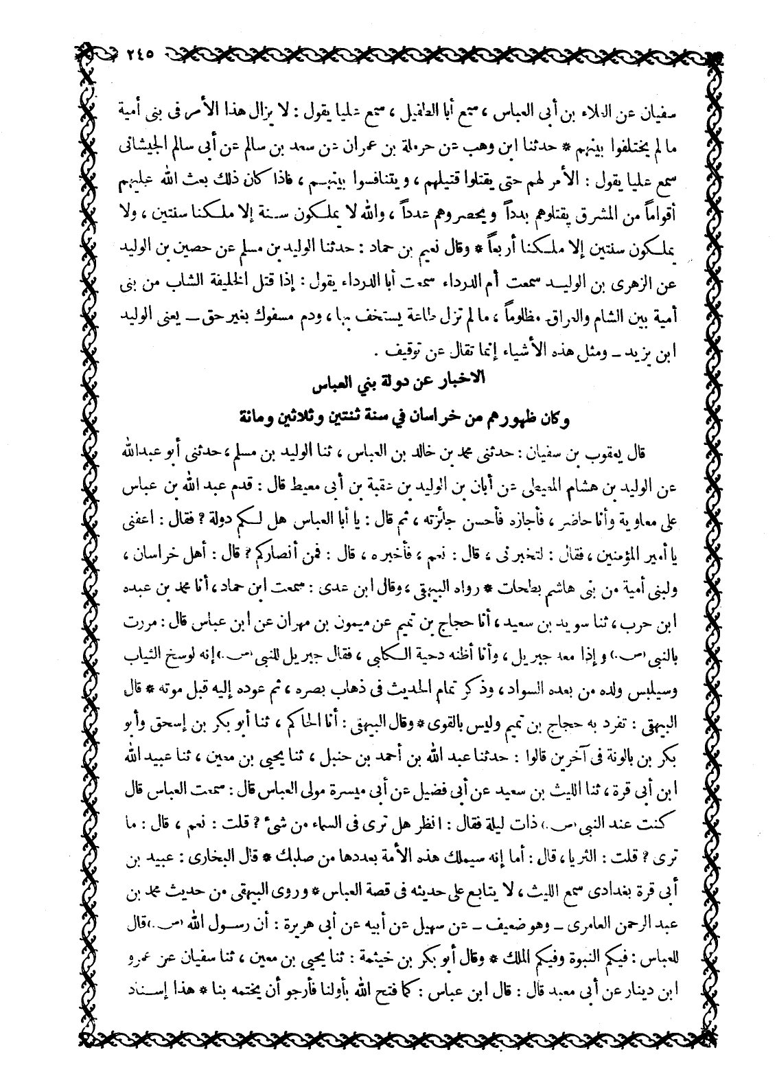 ذِكْرُ الْإِخْبَارِ عَنْ دَوْلَةِ بَنِي الْعَبَّاسِ وَكَانَ ظُهُورُهُمْ مِنْ خُرَاسَانَ بِالرَّايَاتِ السُّودِ، فِي سَنَةِ ثِنْتَيْنِ وَثَلَاثِينَ وَمِائَةٍ