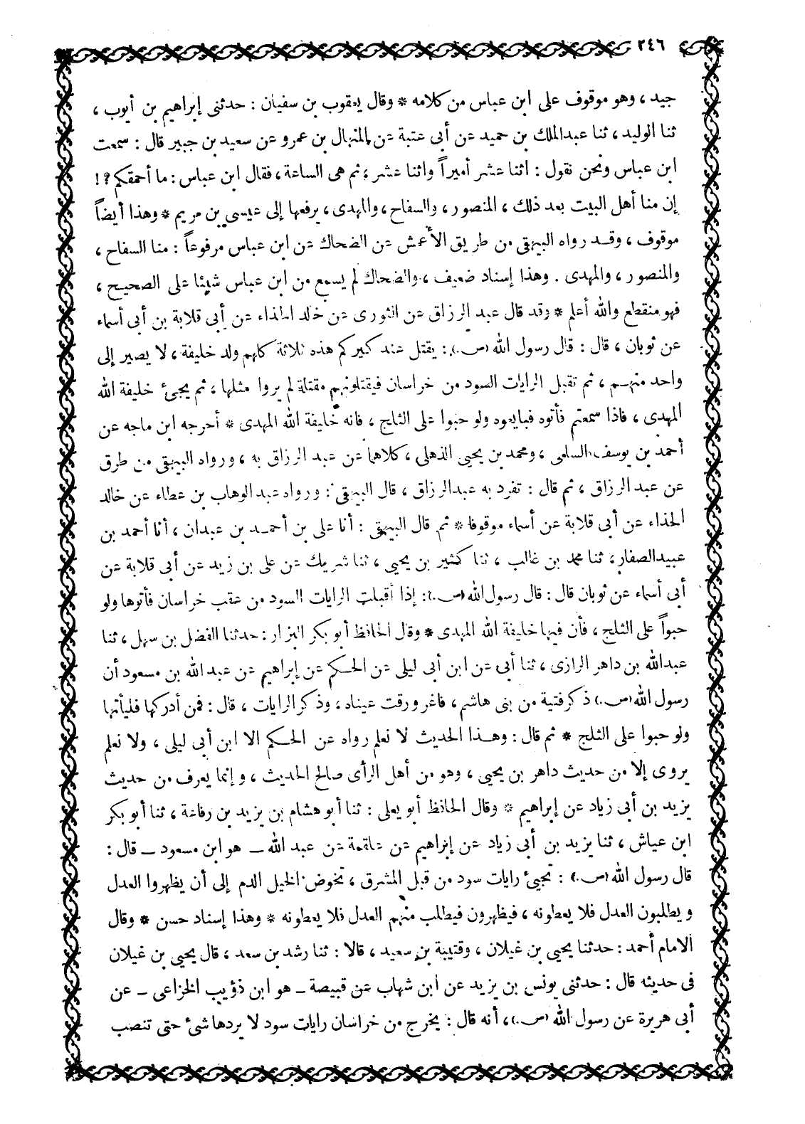 جَيِّدٌ، وَهُوَ مَوْقُوفٌ عَلَى ابْنِ عَبَّاسٍ مِنْ كَلَامِهِ وَقَالَ يَعْقُوبُ بْنُ سُفْيَانَ: حَدَّثَنِي إِبْرَاهِيمُ بْنُ أَيُّوبَ، ثَنَا الْوَلِيدُ، ثَنَا عَبْدُ الْمَلِكِ بن حميد عن أبى عتبة عَنِ الْمِنْهَالِ بْنِ عَمْرٍو عَنْ سَعِيدِ بْنِ جُبَيْرٍ قَالَ: سَمِعْتُ ابْنَ عَبَّاسٍ وَنَحْنُ نَقُولُ: اثنا عشر أميرا واثنا عشر، ثُمَّ هِيَ السَّاعَةُ، فَقَالَ ابْنُ عَبَّاسٍ: مَا أَحْمَقَكُمْ؟! إِنَّ مِنَّا أَهْلَ الْبَيْتِ بَعْدَ ذَلِكَ، المنصور، والسفاح، والمهدي، يرفعها إِلَى عِيسَى بْنِ مَرْيَمَ وَهَذَا أَيْضًا مَوْقُوفٌ، وَقَدْ رَوَاهُ الْبَيْهَقِيُّ مِنْ طَرِيقِ الْأَعْمَشِ عَنِ الضَّحَّاكِ عَنِ ابْنِ عَبَّاسٍ مَرْفُوعًا: مِنَّا السَّفَّاحُ، وَالْمَنْصُورُ، وَالْمَهْدَيُّ. وَهَذَا إِسْنَادٌ ضَعِيفٌ، وَالضَّحَّاكُ لَمْ يَسْمَعْ مِنَ ابْنِ عَبَّاسٍ شَيْئًا عَلَى الصَّحِيحِ، فَهُوَ مُنْقَطِعٌ وَاللَّهُ أَعْلَمُ وَقَدْ قَالَ عَبْدُ الرَّزَّاقِ عَنِ الثَّوْرِيِّ عَنْ خَالِدٍ الْحَذَّاءِ عَنْ أَبِي قِلَابَةَ بن أَبِي أَسْمَاءَ عَنْ ثَوْبَانَ، قَالَ: قَالَ رَسُولُ اللَّهِ صَلَّى اللَّهُ عَلَيْهِ وَسَلَّمَ: يُقْتُلُ عِنْدَ كيركم هَذِهِ ثَلَاثَةٌ كُلُّهُمْ وَلَدُ خَلِيفَةٍ، لَا يَصِيرُ إِلَى وَاحِدٍ مِنْهُمْ، ثُمَّ تُقْبَلُ الرَّايَاتُ السُّودُ من خراسان فيقتلونهم مَقْتَلَةً لَمْ يَرَوْا مِثْلَهَا، ثُمَّ يَجِيءُ خَلِيفَةُ اللَّهِ الْمَهْدِيُّ، فَإِذَا سَمِعْتُمْ فَأْتُوهُ فَبَايِعُوهُ وَلَوْ حَبْوًا عَلَى الثَّلْجِ، فَإِنَّهُ خَلِيفَةُ اللَّهِ الْمَهْدِيُّ أَخْرَجَهُ ابْنُ مَاجَهْ عَنْ أَحْمَدَ بْنِ يُوسُفَ السُّلَمِيِّ، وَمُحَمَّدِ بْنِ يَحْيَى الذُّهْلِيِّ، كِلَاهُمَا عَنْ عَبْدِ الرَّزَّاقِ بِهِ، وَرَوَاهُ الْبَيْهَقِيُّ مِنْ طُرُقٍ عَنْ عَبْدِ الرَّزَّاقِ، ثُمَّ قَالَ: تَفَرَّدَ بِهِ عَبْدُ الرَّزَّاقِ، قَالَ الْبَيْهَقِيُّ: وَرَوَاهُ عَبْدُ الْوَهَّابِ بْنُ عَطَاءٍ عَنْ خَالِدٍ الْحَذَّاءِ عَنْ أَبِي قِلَابَةَ عَنْ أسماء مَوْقُوفًا ثُمَّ قَالَ الْبَيْهَقِيُّ: أَنَا عَلِيُّ بْنُ أَحْمَدَ بْنِ عَبْدَانَ، أنا أحمد بن عبيد الصَّفَّارُ، ثَنَا مُحَمَّدُ بْنُ غَالِبٍ، ثَنَا كَثِيرُ بْنُ يَحْيَى، ثَنَا شَرِيكٌ عَنْ عَلِيِّ بْنِ زَيْدٍ عَنْ أَبِي قِلَابَةَ عَنْ أَبِي أَسْمَاءَ عَنْ ثَوْبَانَ قَالَ: قَالَ رَسُولُ اللَّهِ صَلَّى اللَّهُ عَلَيْهِ وَسَلَّمَ: إِذَا أَقْبَلَتِ الرَّايَاتُ السُّودُ مِنْ عَقِبِ خُرَاسَانَ فَأْتُوهَا وَلَوْ حَبْوًا عَلَى الثَّلْجِ، فَإِنَّ فِيهَا خَلِيفَةَ اللَّهِ الْمَهْدِيَّ وَقَالَ الْحَافِظُ أَبُو بَكْرٍ الْبَزَّارُ: حَدَّثَنَا الْفَضْلُ بْنُ سَهْلٍ، ثَنَا عَبْدُ اللَّهِ بْنُ دَاهِرٍ الرَّازِيُّ، ثَنَا أَبِي عَنِ ابْنِ أَبِي لَيْلَى عَنِ الْحَكَمِ عَنْ إبراهيم عَنْ عَبْدِ اللَّهِ بْنِ مَسْعُودٍ أَنَّ رَسُولَ اللَّهِ صَلَّى اللَّهُ عَلَيْهِ وَسَلَّمَ ذَكَرَ فِتْيَةً من بنى هاشم، فاغر ورقت عَيْنَاهُ، وَذَكَرَ الرَّايَاتِ، قَالَ: فَمَنْ أَدْرَكَهَا فَلْيَأْتِهَا وَلَوْ حَبْوًا عَلَى الثَّلْجِ ثُمَّ قَالَ: وَهَذَا الْحَدِيثُ لَا نَعْلَمُ رَوَاهُ عَنِ الْحَكَمِ إِلَّا ابْنُ أَبِي لَيْلَى، وَلَا نَعْلَمُ يُرْوَى إِلَّا مِنْ حَدِيثِ دَاهِرِ بْنِ يَحْيَى، وَهُوَ مِنْ أَهْلِ الرَّأْيِ صَالِحُ الْحَدِيثِ، وَإِنَّمَا يُعْرَفُ مِنْ حَدِيثِ يَزِيدَ بْنِ أَبِي زِيَادٍ عَنْ إِبْرَاهِيمَ وَقَالَ الْحَافِظُ أَبُو يَعْلَى: ثَنَا أَبُو هِشَامٍ بْنُ يَزِيدَ بْنِ رِفَاعَةَ، ثَنَا أَبُو بَكْرِ ابن عَيَّاشٍ، ثَنَا يَزِيدُ بْنُ أَبِي زِيَادٍ عَنْ إِبْرَاهِيمَ عَنْ عَلْقَمَةَ عَنْ عَبْدِ اللَّهِ- هُوَ ابْنُ مَسْعُودٍ- قَالَ: