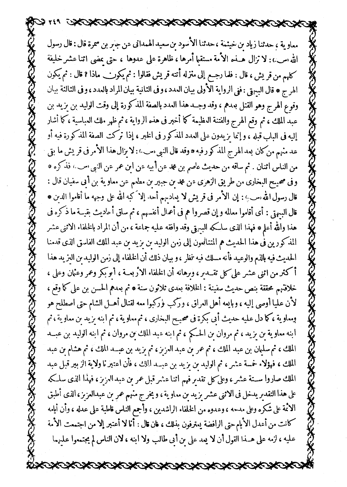 مُعَاوِيَةَ، حَدَّثَنَا زِيَادُ بْنُ خَيْثَمَةَ، حَدَّثَنَا الْأَسْوَدُ بْنُ سَعِيدٍ الْهَمْدَانِيُّ عَنْ جَابِرِ بْنِ سَمُرَةَ قَالَ: قَالَ رَسُولُ اللَّهِ صَلَّى اللَّهُ عَلَيْهِ وَسَلَّمَ: لَا تَزَالُ هَذِهِ الْأُمَّةُ مُسْتَقِيمًا أَمْرُهَا، ظَاهِرَةً على عدوها، حتى يمضى اثْنَا عَشَرَ خَلِيفَةً كُلُّهُمْ مِنْ قُرَيْشٍ، قَالَ: فَلَمَّا رَجَعَ إِلَى مَنْزِلِهِ أَتَتْهُ قُرَيْشٌ فَقَالُوا: ثُمَّ يَكُونُ مَاذَا؟ قَالَ: ثُمَّ يَكُونُ الْهَرْجُ قَالَ الْبَيْهَقِيُّ: فَفِي الرِّوَايَةِ الْأُولَى بَيَانُ الْعَدَدِ، وَفِي الثَّانِيَةِ بَيَانُ الْمُرَادِ بِالْعَدَدِ، وَفِي الثَّالِثَةِ بَيَانُ وُقُوعِ الْهَرْجِ وَهُوَ الْقَتْلُ بَعْدَهُمْ، وَقَدْ وُجِدَ هَذَا الْعَدَدُ بِالصِّفَةِ الْمَذْكُورَةِ إِلَى وَقْتِ الْوَلِيدِ بْنِ يَزِيدَ بْنِ عَبْدِ الْمَلِكِ، ثُمَّ وَقَعَ الْهَرْجُ وَالْفِتْنَةُ الْعَظِيمَةُ كَمَا أَخْبَرَ فِي هَذِهِ الرِّوَايَةِ، ثُمَّ ظَهَرَ مُلْكُ الْعَبَّاسِيَّةِ، كَمَا أَشَارَ إِلَيْهِ فِي الْبَابِ قَبْلَهُ، وَإِنَّمَا يَزِيدُونَ عَلَى الْعَدَدِ الْمَذْكُورِ فِي الْخَبَرِ، إِذَا تُرِكَتِ الصفة المذكورة فيه أو عد منهم مَنْ كَانَ بَعْدَ الْهَرْجِ الْمَذْكُورِ فِيهِ وَقَدْ قَالَ النَّبِيُّ صَلَّى اللَّهُ عَلَيْهِ وَسَلَّمَ: لَا يَزَالُ هَذَا الْأَمْرُ فِي قُرَيْشٍ مَا بَقِيَ مِنَ النَّاسِ اثْنَانِ. ثُمَّ سَاقَهُ مِنْ حَدِيثِ عَاصِمِ بْنِ مُحَمَّدٍ عَنْ أَبِيهِ عَنِ ابْنِ عُمَرَ عَنِ النَّبِيِّ صَلَّى اللَّهُ عَلَيْهِ وَسَلَّمَ فَذَكَرَهُ وَفِي صَحِيحِ الْبُخَارِيِّ مِنْ طَرِيقِ الزُّهْرِيِّ عَنْ مُحَمَّدِ بْنِ جُبَيْرِ بْنِ مُطْعِمٍ عَنْ مُعَاوِيَةَ بْنِ أَبِي سُفْيَانَ قَالَ: