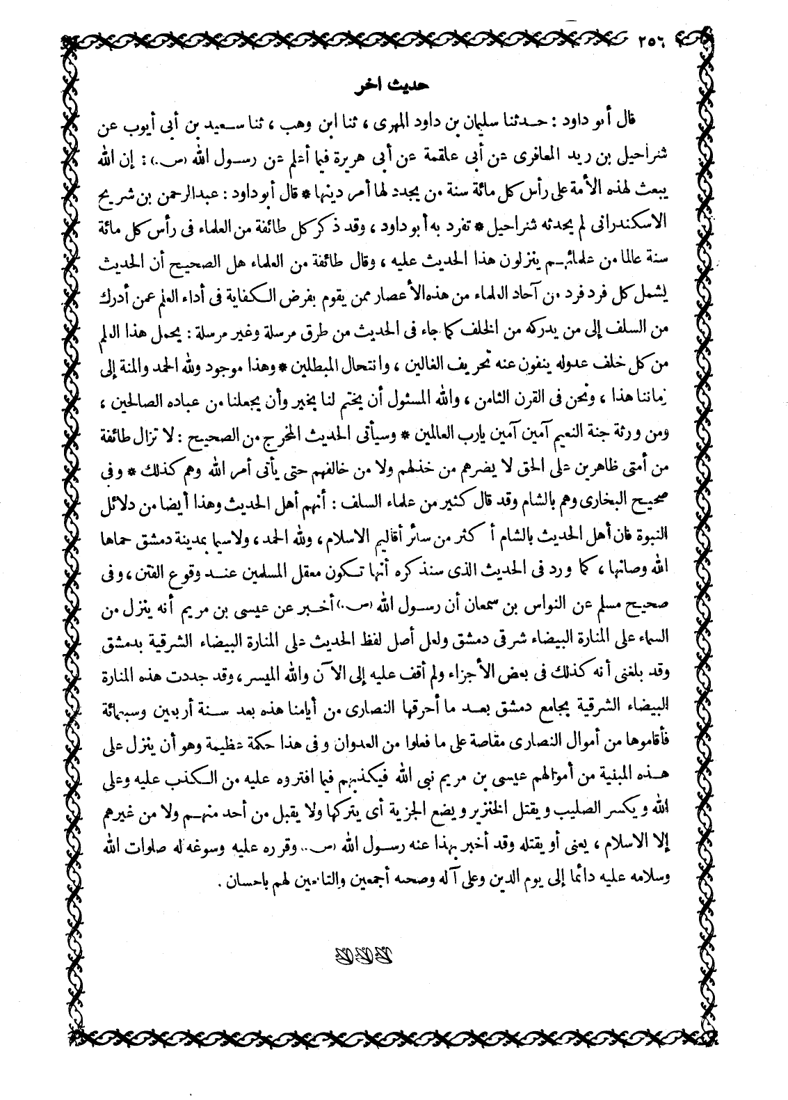 قَالَ أَبُو دَاوُدَ: حَدَّثَنَا سُلَيْمَانُ بْنُ دَاوُدَ الْمَهْرِيُّ، ثَنَا ابْنُ وَهْبٍ، ثَنَا سَعِيدُ بْنُ أَبِي أَيُّوبَ عَنْ شَرَاحِيلَ بْنِ زيد الْمَعَافِرِيِّ عَنْ أَبِي عَلْقَمَةَ عَنْ أَبِي هُرَيْرَةَ فِيمَا أَعْلَمُ عَنْ رَسُولِ اللَّهِ صَلَّى اللَّهُ عَلَيْهِ وَسَلَّمَ: إِنَّ اللَّهَ يَبْعَثُ لِهَذِهِ الْأُمَّةِ عَلَى رَأْسِ كل مائة سنة من يجددها لها أمر دينها قال أبو داود: عبد الرحمن بن شريح الإسكندراني لم يحدثه شَرَاحِيلُ تَفَرَّدَ بِهِ أَبُو دَاوُدَ، وَقَدْ ذَكَرَ كُلُّ طَائِفَةٍ مِنَ الْعُلَمَاءِ فِي رَأْسِ كُلِّ مِائَةِ سَنَةٍ عَالِمًا مِنْ عُلَمَائِهِمْ يُنَزِّلُونَ هَذَا الحديث عليه، وقال طائفة من العلماء هل الصَّحِيحُ أَنَّ الْحَدِيثَ يَشْمَلُ كُلَّ فَرْدٍ فَرْدٍ مِنْ آحَادِ الْعُلَمَاءِ مِنْ هَذِهِ الْأَعْصَارِ مِمَّنْ يَقُومُ بِفَرْضِ الْكِفَايَةِ فِي أَدَاءِ الْعِلْمِ عَمَّنْ أَدْرَكَ مِنَ السَّلَفِ إِلَى مَنْ يُدْرِكُهُ مِنَ الْخَلَفِ كَمَا جَاءَ فِي الْحَدِيثِ مِنْ طُرُقٍ مُرْسَلَةٍ وَغَيْرِ مُرْسَلَةٍ: يَحْمِلُ هَذَا الْعِلْمَ مِنْ كُلِّ خَلَفٍ عُدُولُهُ يَنْفُونَ عَنْهُ تَحْرِيفَ الْغَالِينَ، وَانْتِحَالَ الْمُبْطِلِينَ وَهَذَا مَوْجُودٌ وللَّه الْحَمْدُ وَالْمِنَّةُ إِلَى زَمَانِنَا هَذَا، وَنَحْنُ فِي الْقَرْنِ الثَّامِنِ، وَاللَّهُ الْمَسْئُولُ أَنْ يَخْتِمَ لَنَا بِخَيْرٍ وَأَنْ يَجْعَلَنَا مِنْ عِبَادِهِ الصَّالِحِينَ، وَمِنْ وَرَثَةِ جَنَّةِ النَّعِيمِ آمِينَ آمِينَ يَا رَبَّ الْعَالَمِينَ وَسَيَأْتِي الْحَدِيثُ الْمُخَرَّجُ مِنَ الصَّحِيحِ: لَا تَزَالُ طَائِفَةٌ مِنْ أُمَّتِي ظَاهِرِينَ عَلَى الْحَقِّ لَا يَضُرُّهُمْ مَنْ خَذَلَهُمْ وَلَا مَنْ خَالَفَهُمْ حَتَّى يَأْتِيَ أَمْرُ اللَّهِ وَهُمْ كَذَلِكَ وَفِي صَحِيحِ الْبُخَارِيِّ وَهُمْ بِالشَّامِ وَقَدْ قَالَ كَثِيرٌ مِنْ عُلَمَاءِ السَّلَفِ: إِنَّهُمْ أَهْلُ الْحَدِيثِ وَهَذَا أَيْضًا مِنْ دلائل النبوة فان أهل الحديث بالشام أَكْثَرُ مِنْ سَائِرِ أَقَالِيمِ الْإِسْلَامِ، وللَّه الْحَمْدُ، وَلَا سِيَّمَا بِمَدِينَةِ دِمَشْقَ حَمَاهَا اللَّهُ وَصَانَهَا، كَمَا وَرَدَ فِي الْحَدِيثِ الَّذِي سَنَذْكُرُهُ أَنَّهَا تَكُونُ مَعْقِلَ الْمُسْلِمِينَ عِنْدَ وُقُوعِ الْفِتَنِ، وَفِي صَحِيحِ مُسْلِمٍ عَنِ النَّوَّاسِ بْنِ سَمْعَانَ أَنَّ رَسُولَ اللَّهِ صَلَّى اللَّهُ عَلَيْهِ وَسَلَّمَ أَخْبَرَ عن عيسى بن مَرْيَمَ أَنَّهُ يَنْزِلُ مِنَ السَّمَاءِ عَلَى الْمَنَارَةِ الْبَيْضَاءِ شَرْقِيَّ دِمَشْقَ وَلَعَلَّ أَصْلَ لَفْظِ الْحَدِيثِ عَلَى الْمَنَارَةِ الْبَيْضَاءِ الشَّرْقِيَّةِ بِدِمَشْقَ وَقَدْ بَلَغَنِي أَنَّهُ كَذَلِكَ فِي بَعْضِ الْأَجْزَاءِ وَلَمْ أَقِفْ عَلَيْهِ إِلَى الْآنَ وَاللَّهُ الْمُيَسِّرُ، وَقَدْ جُدِّدَتْ هَذِهِ الْمَنَارَةُ الْبَيْضَاءُ الشَّرْقِيَّةُ بِجَامِعِ دِمَشْقَ بَعْدَ ما أحرقها النصارى من أيامنا هذه بعد سنة أربعين وسبعمائة فأقاموها مِنْ أَمْوَالِ النَّصَارَى مُقَاصَّةً عَلَى مَا فَعَلُوا مِنَ الْعُدْوَانِ وَفِي هَذَا حِكْمَةٌ عَظِيمَةٌ وَهُوَ أَنْ يَنْزِلَ عَلَى هَذِهِ الْمَبْنِيَّةِ مِنْ أَمْوَالِهِمْ عيسى بن مَرْيَمَ نَبِيُّ اللَّهِ فَيُكَذِّبَهُمْ فِيمَا افْتَرَوْهُ عَلَيْهِ مِنَ الْكَذِبِ عَلَيْهِ وَعَلَى اللَّهِ وَيَكْسِرَ الصَّلِيبَ وَيَقْتُلَ الْخِنْزِيرَ وَيَضَعَ الْجِزْيَةَ أَيْ يَتْرُكُهَا وَلَا يَقْبَلُ مِنْ أَحَدٍ مِنْهُمْ وَلَا مِنْ غَيْرِهِمْ إِلَّا الْإِسْلَامَ، يَعْنِي أَوْ يَقْتُلُهُ وَقَدْ أَخْبَرَ بِهَذَا عَنْهُ رَسُولُ اللَّهِ صَلَّى اللَّهُ عَلَيْهِ وَسَلَّمَ وَقَرَّرَهُ عَلَيْهِ وَسَوَّغَهُ لَهُ صَلَوَاتُ اللَّهِ وَسَلَامُ