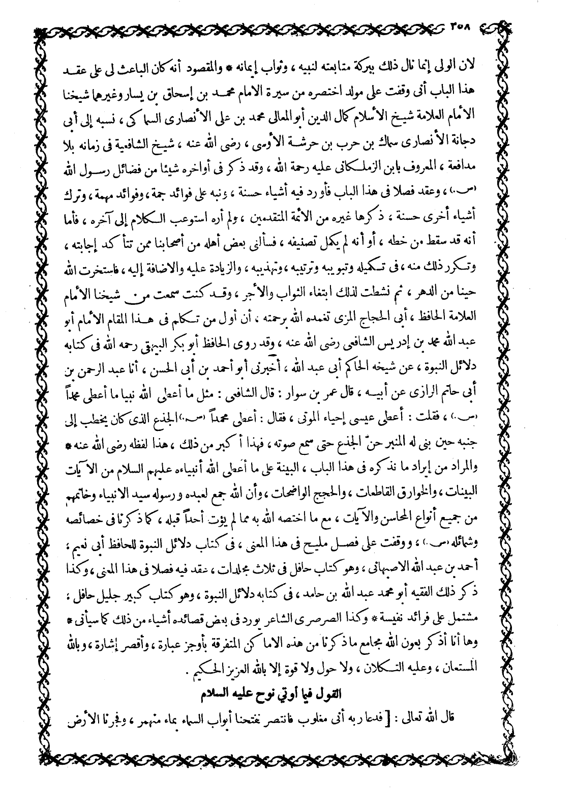 لِأَنَّ الْوَلِيَّ إِنَّمَا نَالَ ذَلِكَ بِبَرَكَةِ مُتَابَعَتِهِ لنبيه، وثواب إيمانه وَالْمَقْصُودُ أَنَّهُ كَانَ الْبَاعِثَ لِي عَلَى عَقْدِ هَذَا الْبَابِ أَنِّي وَقَفْتُ عَلَى مُوَلَّدٍ اخْتَصَرَهُ مِنْ سِيرَةِ الْإِمَامِ مُحَمَّدِ بْنِ إِسْحَاقَ بْنِ يسار وغيرهما شَيْخُنَا الْإِمَامُ الْعَلَّامَةُ شَيْخُ الْإِسْلَامِ كَمَالُ الدِّينِ أَبُو الْمَعَالِي مُحَمَّدُ بْنُ عَلِيٍّ الْأَنْصَارِيُّ السِّمَاكِيُّ، نسبه إلى أبى دجانة الأنصاري سماك بن حرب بن حرشة الْأَوْسِيِّ، رَضِيَ اللَّهُ عَنْهُ، شَيْخُ الشَّافِعِيَّةِ فِي زمانه بلا مدافعة، المعروف بابن الزملكانى عليه رحمة الله، وَقَدْ ذَكَرَ فِي أَوَاخِرِهِ شَيْئًا مِنْ فَضَائِلِ رَسُولِ اللَّهِ صَلَّى اللَّهُ عَلَيْهِ وَسَلَّمَ، وَعَقَدَ فَصْلًا فِي هَذَا الْبَابِ فَأَوْرَدَ فِيهِ أَشْيَاءَ حسنة، ونبه على فوائد جمة، وفوائد مُهِمَّةٍ، وَتَرَكَ أَشْيَاءَ أُخْرَى حَسَنَةً، ذَكَرَهَا غَيْرُهُ مِنَ الْأَئِمَّةِ الْمُتَقَدِّمِينَ، وَلَمْ أَرَهُ اسْتَوْعَبَ الْكَلَامَ إِلَى آخِرِهِ، فَإِمَّا أَنَّهُ قَدْ سَقَطَ مِنْ خَطِّهِ، أَوْ أَنَّهُ لَمْ يُكْمِلْ تَصْنِيفَهُ، فَسَأَلَنِي بَعْضُ أَهْلِهِ مِنْ أَصْحَابِنَا مِمَّنْ تَتَأَكَّدُ إِجَابَتُهُ، وتكرر ذلك منه، في تكميله وتبويبه وَتَرْتِيبِهِ، وَتَهْذِيبِهِ، وَالزِّيَادَةِ عَلَيْهِ وَالْإِضَافَةِ إِلَيْهِ، فَاسْتَخَرْتُ اللَّهَ حِينًا مِنَ الدَّهْرِ، ثُمَّ نَشِطْتُ لِذَلِكَ ابْتِغَاءَ الثَّوَابِ وَالْأَجْرِ، وَقَدْ كُنْتُ سَمِعْتُ مِنْ شيخنا الإمام العلامة الْحَافِظِ، أَبِي الْحَجَّاجِ الْمِزِّيِّ تَغَمَّدَهُ اللَّهُ بِرَحْمَتِهِ، أَنَّ أَوَّلَ مَنْ تَكَلَّمَ فِي هَذَا الْمَقَامِ الْإِمَامُ أَبُو عَبْدِ اللَّهِ مُحَمَّدُ بْنُ إِدْرِيسَ الشَّافِعِيُّ رضى الله عنه، وَقَدْ رَوَى الْحَافِظُ أَبُو بَكْرٍ الْبَيْهَقِيُّ رَحِمَهُ اللَّهُ فِي كِتَابِهِ دَلَائِلِ النُّبُوَّةِ، عَنْ شَيْخِهِ الْحَاكِمِ أَبِي عَبْدِ اللَّهِ، أَخْبَرَنِي أَبُو أَحْمَدَ بْنُ أَبِي الْحَسَنِ، أَنَا عَبْدُ الرَّحْمَنِ بْنُ أبى حاتم الرازيّ عن أبيه، قال عمر بن سوار: قال الشافعيّ: مثل مَا أَعْطَى اللَّهُ نَبِيًّا مَا أَعْطَى مُحَمَّدًا صَلَّى اللَّهُ عَلَيْهِ وَسَلَّمَ، فَقُلْتُ: أَعْطَى عِيسَى إِحْيَاءَ الْمَوْتَى، فَقَالَ: أَعْطَى مُحَمَّدًا صَلَّى اللَّهُ عَلَيْهِ وَسَلَّمَ الْجِذْعَ الَّذِي كَانَ يَخْطُبُ إِلَى جنبه حين بنى لَهُ الْمِنْبَرُ حَنَّ الْجِذْعُ حَتَّى سُمِعَ صَوْتُهُ، فهذا أكبر من ذلك، هَذَا لَفْظُهُ رَضِيَ اللَّهُ عَنْهُ وَالْمُرَادُ مِنْ إيراد ما نذكره في هذا الباب، البينة على مَا أَعْطَى اللَّهُ أَنْبِيَاءَهُ عَلَيْهِمُ السَّلَامُ مِنَ الْآيَاتِ الْبَيِّنَاتِ، وَالْخَوَارِقِ الْقَاطِعَاتِ، وَالْحُجَجِ الْوَاضِحَاتِ، وَأَنَّ الله جَمَعَ لِعَبْدِهِ وَرَسُولِهِ سَيِّدِ الْأَنْبِيَاءِ وَخَاتَمِهِمْ مِنْ جَمِيعِ أَنْوَاعِ الْمَحَاسِنِ وَالْآيَاتِ، مَعَ مَا اخْتَصَّهُ اللَّهُ بِهِ مِمَّا لَمَّ يُؤْتِ أَحَدًا قَبْلَهُ، كما ذكرنا في خصائصه وشمائله صلّى الله عليه وسلّم، وَوَقَفْتُ عَلَى فَصْلٍ مَلِيحٍ فِي هَذَا الْمَعْنَى، فِي كِتَابِ دَلَائِلِ النُّبُوَّةِ لِلْحَافِظِ أَبِي نُعَيْمٍ، أَحْمَدَ بْنِ عَبْدِ اللَّهِ الْأَصْبَهَانِيِّ، وَهُوَ كِتَابٌ حَافِلٌ فِي ثَلَاثِ مُجَلَّدَاتٍ، عَقَدَ فِيهِ فَصْلًا فِي هَذَا الْمَعْنَى، وَكَذَا ذَكَرَ ذَلِكَ الْفَقِيهُ أَبُو مُحَمَّدٍ عَبْدُ اللَّهِ بْنُ حَامِدٍ، فِي كِتَابِهِ دَلَائِلِ النُّبُوَّةِ، وَهُوَ كِتَابٌ كَبِيرٌ جَلِيلٌ حافل، مشتمل على فرائد نَفِيسَةٍ وَكَذَا الصَّرْصَرِيُّ الشَّاعِرُ يُورِدُ فِي بَعْضِ قصائده أشياء من ذلك كَمَا سَيَ