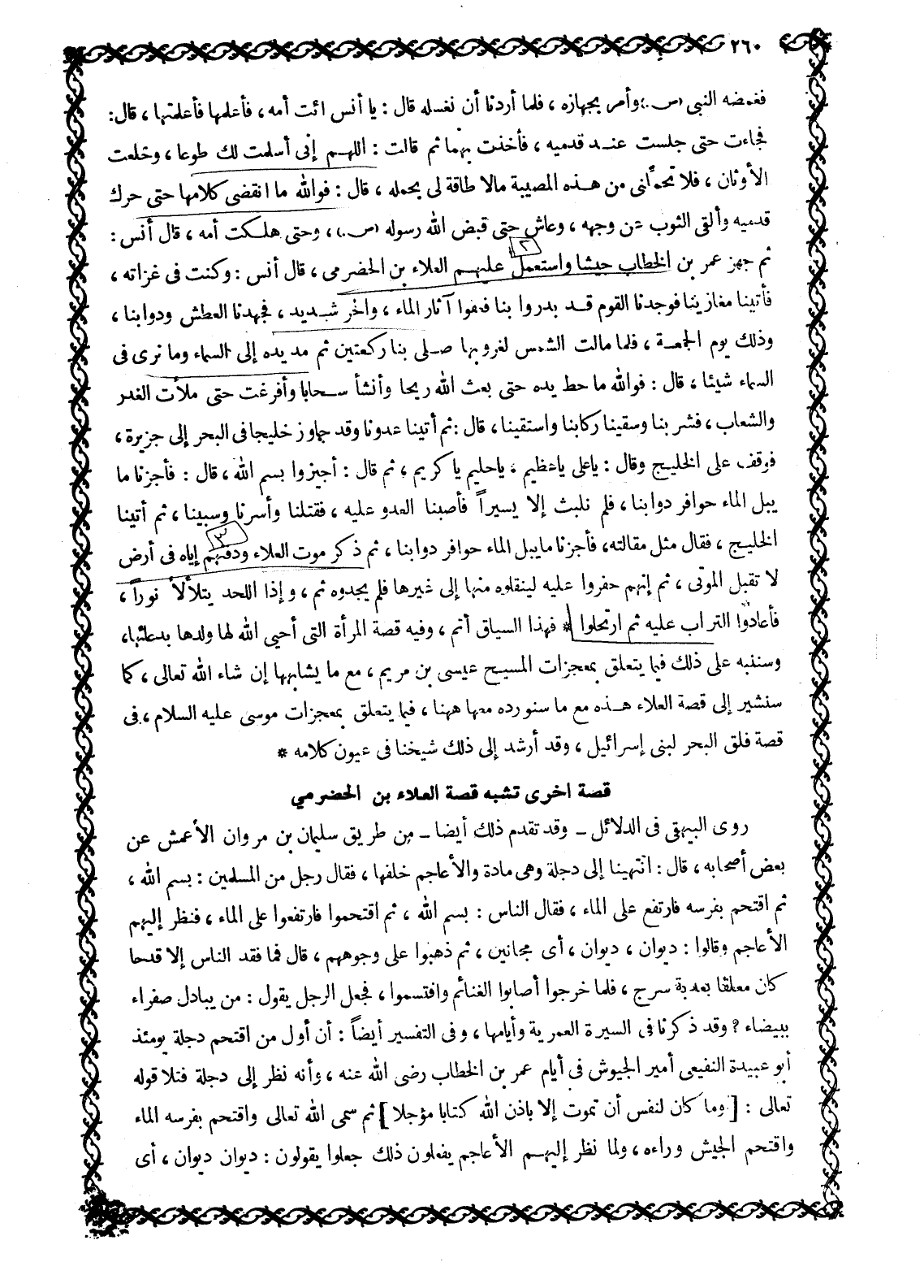 ثُمَّ جَهَّزَ عُمَرُ بْنُ الخطاب جيشا واستعمل عليهم العلاء بن الحضرمي، قال أنس: وكنت في غزاته، فأتينا مغازينا فوجدنا القوم قد بدروا بنا فعفوا آثار الماء، والحر شديد، فجهدنا الْعَطَشُ وَدَوَابَّنَا، وَذَلِكَ يَوْمُ الْجُمُعَةِ، فَلَمَّا مَالَتِ الشَّمْسُ لِغُرُوبِهَا صَلَّى بِنَا رَكْعَتَيْنِ ثُمَّ مَدَّ يَدَهُ إِلَى السَّمَاءِ وَمَا نَرَى فِي السَّمَاءِ شيئا، قال: فو الله مَا حَطَّ يَدَهُ حَتَّى بَعَثَ اللَّهُ رِيحًا وَأَنْشَأَ سَحَابًا وَأَفْرَغَتْ حَتَّى مَلَأَتِ الْغُدُرَ وَالشِّعَابَ، فَشَرِبْنَا وَسَقَيْنَا رِكَابَنَا وَاسْتَقَيْنَا، قَالَ: ثُمَّ أَتَيْنَا عَدُوَّنَا وَقَدْ جَاوَزَ خَلِيجًا فِي الْبَحْرِ إِلَى جَزِيرَةٍ، فَوَقَفَ عَلَى الْخَلِيجِ وَقَالَ: يَا عَلِيُّ يَا عَظِيمُ، يَا حَلِيمُ يَا كَرِيمُ، ثُمَّ قَالَ: أَجِيزُوا بِسْمِ اللَّهِ، قَالَ: فَأَجَزْنَا مَا يَبُلُّ الْمَاءُ حَوَافِرَ دَوَابِّنَا، فَلَمْ نَلْبَثْ إِلَّا يسيرا فأصبنا العدو عليه، فَقَتَلْنَا وَأَسَرْنَا وَسَبَيْنَا، ثُمَّ أَتَيْنَا الْخَلِيجَ، فَقَالَ مِثْلَ مَقَالَتِهِ، فَأَجَزْنَا مَا يَبُلُّ الْمَاءُ حَوَافِرَ دوابنا، ثُمَّ ذَكَرَ مَوْتَ الْعَلَاءِ وَدَفْنَهُمْ إِيَّاهُ فِي أَرْضٍ لَا تَقْبَلُ الْمَوْتَى، ثُمَّ إِنَّهُمْ حَفَرُوا عليه لِيَنْقُلُوهُ مِنْهَا إِلَى غَيْرِهَا فَلَمْ يَجِدُوهُ ثَمَّ، وَإِذَا اللَّحْدُ يَتَلَأْلَأُ نُورًا، فَأَعَادُوا التُّرَابَ عَلَيْهِ ثُمَّ ارْتَحَلُوا فَهَذَا السِّيَاقُ أَتَمُّ، وَفِيهِ قِصَّةُ المرأة التي أحيى اللَّهُ لَهَا وَلَدَهَا بِدُعَائِهَا، وَسَنُنَبِّهُ عَلَى ذَلِكَ فيما يتعلق بمعجزات المسيح عيسى بن مَرْيَمَ، مَعَ مَا يُشَابِهُهَا إِنْ شَاءَ اللَّهُ تَعَالَى، كَمَا سَنُشِيرُ إِلَى قِصَّةِ الْعَلَاءِ هَذِهِ مع ما سنورده معها هاهنا، فِيمَا يَتَعَلَّقُ بِمُعْجِزَاتِ مُوسَى عَلَيْهِ السَّلَامُ، فِي قِصَّةِ فَلْقِ الْبَحْرِ لِبَنِي إِسْرَائِيلَ، وَقَدْ أَرْشَدَ إلى ذلك شيخنا في عيون كلامه