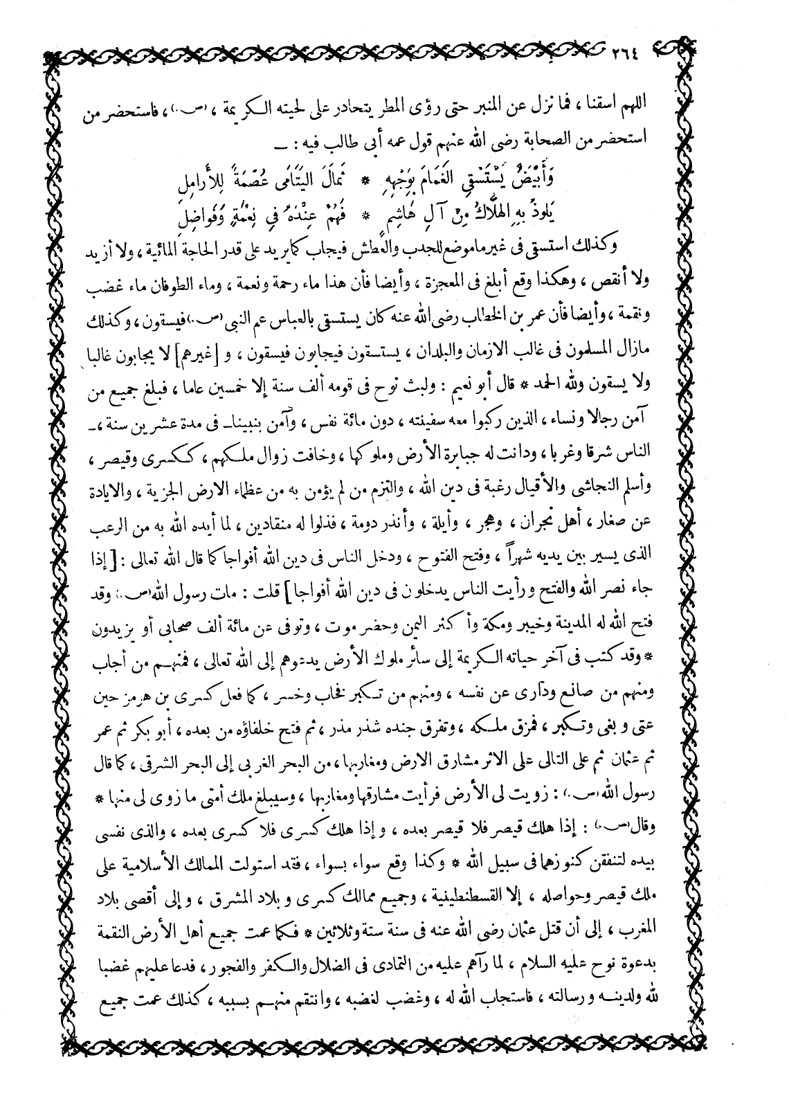 اللَّهمّ اسْقِنَا، فَمَا نَزَلَ عَنِ الْمِنْبَرِ حَتَّى رئي المطر يتحادر على لحيته الكريمة، صلّى الله عليه وسلّم، فَاسْتَحْضَرَ مَنِ اسْتَحْضَرَ مِنَ الصَّحَابَةِ رَضِيَ اللَّهُ عَنْهُمْ قَوْلَ عَمِّهِ أَبِي طَالِبٍ فِيهِ: -