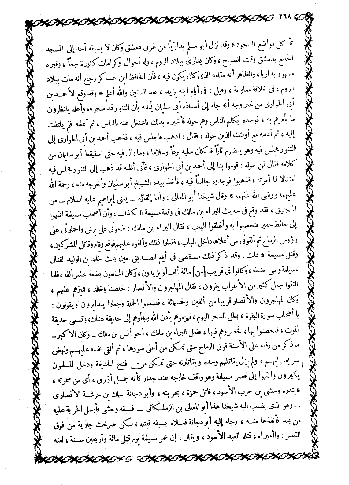 تَأْكُلَ مَوَاضِعَ السُّجُودِ وَقَدْ نَزَلَ أَبُو مُسْلِمٍ بِدَارَيَّا مِنْ غَرْبِيِّ دِمَشْقَ وَكَانَ لَا يَسْبِقُهُ أَحَدٌ إِلَى الْمَسْجِدِ الْجَامِعِ بِدِمَشْقَ وَقْتَ الصُّبْحِ، وكان يغازى ببلاد الرُّومِ، وَلَهُ أَحْوَالٌ وَكَرَامَاتٌ كَثِيرَةٌ جِدًّا، وَقَبْرُهُ مَشْهُورٌ بِدَارَيَّا، وَالظَّاهِرُ أَنَّهُ مَقَامُهُ الَّذِي كَانَ يَكُونُ فِيهِ، فَإِنَّ الْحَافِظَ ابْنَ عَسَاكِرَ رَجَّحَ أَنَّهُ مَاتَ بِبِلَادِ الرُّومِ، فِي خِلَافَةِ مُعَاوِيَةَ، وَقِيلَ: فِي أَيَّامِ ابْنِهِ يَزِيدَ، بَعْدَ السِّتِّينَ وَاللَّهُ أَعْلَمُ وَقَدْ وَقَعَ لِأَحْمَدَ بْنَ أَبِي الْحِوَارِيِّ مِنْ غَيْرِ وَجْهٍ أَنَّهُ جَاءَ إِلَى أستاذه أبى سليمان يعلمه بأن التَّنُّورَ قَدْ سَجَرُوهُ وَأَهْلُهُ يَنْتَظِرُونَ مَا يَأْمُرُهُمْ به، فوجده يكلم الناس وهم حوله فأخبره بِذَلِكَ فَاشْتَغَلَ عَنْهُ بِالنَّاسِ، ثُمَّ أَعْلَمُهُ فَلَمْ يَلْتَفِتْ إِلَيْهِ، ثُمَّ أَعْلَمُهُ مَعَ أُولَئِكَ الَّذِينَ حوله، فقال: اذهب فاجلس فيه، فذهب أَحْمَدُ بْنُ أَبِي الْحِوَارِيِّ إِلَى التَّنُّورِ فَجَلَسَ فِيهِ وَهُوَ يَتَضَرَّمُ نَارًا فَكَانَ عَلَيْهِ بَرْدًا وَسَلَامًا، وَمَا زَالَ فِيهِ حَتَّى اسْتَيْقَظَ أَبُو سُلَيْمَانَ مِنْ كَلَامِهِ فَقَالَ لِمَنْ حَوْلَهُ: قُومُوا بِنَا إِلَى أَحْمَدَ بْنِ أَبِي الْحِوَارِيِّ، فَإِنِّي أَظُنُّهُ قَدْ ذَهَبَ إِلَى التَّنُّورِ فَجَلَسَ فِيهِ امتثالا لما أمرته، فَذَهَبُوا فَوَجَدُوهُ جَالِسًا فِيهِ، فَأَخَذَ بِيَدِهِ الشَّيْخُ أَبُو سُلَيْمَانَ وَأَخْرَجَهُ مِنْهُ، رَحْمَةُ اللَّهِ عَلَيْهِمَا وَرَضِيَ اللَّهُ عَنْهُمَا وَقَالَ شَيْخُنَا أَبُو الْمَعَالِي: وَأَمَّا إِلْقَاؤُهُ- يَعْنِي إِبْرَاهِيمَ عَلَيْهِ السَّلَامُ- مِنَ الْمَنْجَنِيقِ، فَقَدْ وَقَعَ فِي حَدِيثِ الْبَرَاءِ بْنِ مَالِكٍ فِي وَقْعَةِ مُسَيْلِمَةَ الْكَذَّابِ، وَأَنَّ أَصْحَابَ مُسَيْلِمَةَ انْتَهَوْا إِلَى حَائِطٍ حَفِيرٍ فَتَحَصَّنُوا بِهِ وَأَغْلَقُوا الْبَابَ، فَقَالَ الْبَرَاءُ بْنُ مَالِكٍ: ضَعُونِي على برش وَاحْمِلُونِي عَلَى رُءُوسِ الرِّمَاحِ ثُمَّ أَلْقُونِي مِنْ أَعْلَاهَا دَاخِلَ الْبَابِ، فَفَعَلُوا ذَلِكَ وَأَلْقَوْهُ عَلَيْهِمْ فوقع وقام وقاتل المشركين، وقتل مسيلمة قلت: وقد ذكر ذَلِكَ مُسْتَقْصًى فِي أَيَّامِ الصِّدِّيقِ حِينَ بَعَثَ خَالِدَ بْنَ الْوَلِيدِ لِقِتَالِ مُسَيْلِمَةَ وَبَنِي حَنِيفَةَ، وَكَانُوا فِي قَرِيبٍ [مِنْ] مِائَةِ أَلْفٍ أَوْ يَزِيدُونَ، وَكَانَ الْمُسْلِمُونَ بِضْعَةَ عَشَرَ أَلْفًا، فَلَمَّا الْتَقَوْا جَعَلَ كَثِيرٌ مِنَ الْأَعْرَابِ يَفِرُّونَ، فَقَالَ المهاجرون والأنصار: خلصنا يا خالد، فميزهم عنهم، وكان الْمُهَاجِرُونَ وَالْأَنْصَارُ قَرِيبًا مِنْ أَلْفَيْنِ وَخَمْسِمِائَةٍ، فَصَمَّمُوا الحملة وجعلوا يتدابرون وَيَقُولُونَ: