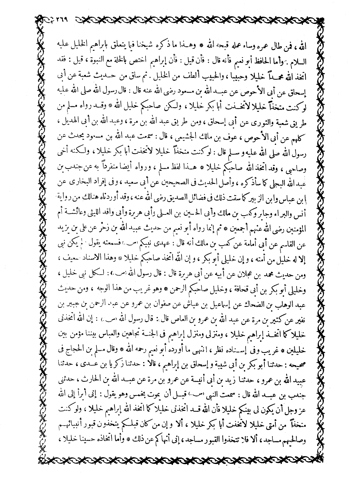 الله، فمن طَالَ عُمُرُهُ وَسَاءَ عَمَلُهُ قَبَّحَهُ اللَّهُ وَهَذَا مَا ذَكَرَهُ شَيْخُنَا فِيمَا يَتَعَلَّقُ بِإِبْرَاهِيمَ الْخَلِيلِ عَلَيْهِ السَّلَامُ. وَأَمَّا الْحَافِظُ أَبُو نُعَيْمٍ فَإِنَّهُ قال: فأن قيل: فأن إبراهيم اختص بِالْخُلَّةِ مَعَ النُّبُوَّةِ، قِيلَ: فَقَدِ اتَّخَذَ اللَّهُ مُحَمَّدًا خَلِيلًا وَحَبِيبًا، وَالْحَبِيبُ أَلْطَفُ مِنَ الْخَلِيلِ. ثُمَّ سَاقَ مِنْ حَدِيثِ شُعْبَةَ عَنْ أَبِي إِسْحَاقَ عَنْ أَبِي الْأَحْوَصِ عَنْ عَبْدُ اللَّهِ بْنُ مَسْعُودٍ رَضِيَ اللَّهُ عَنْهُ قَالَ: قَالَ رَسُولُ اللَّهِ صَلَّى اللَّهُ عَلَيْهِ لَوْ كُنْتُ مُتَّخِذًا خَلِيلًا لَاتَّخَذْتُ أَبَا بَكْرٍ خَلِيلًا، وَلَكِنَّ صَاحِبَكُمْ خَلِيلُ اللَّهِ وَقَدْ رَوَاهُ مُسْلِمٌ مِنْ طَرِيقِ شُعْبَةَ وَالثَّوْرِيِّ عَنْ أَبِي إِسْحَاقَ، وَمِنْ طَرِيقِ عَبْدِ اللَّهِ بْنِ مُرَّةَ، وعبد الله بن أبى الهديل، كُلُّهُمْ عَنْ أَبِي الْأَحْوَصِ، عَوْفِ بْنِ مَالِكٍ الجشيمى، قَالَ: سَمِعْتُ عَبْدَ اللَّهِ بْنَ مَسْعُودٍ يُحَدِّثُ عَنْ رَسُولِ اللَّهِ صَلَّى اللَّهُ عَلَيْهِ وَسَلَّمَ قَالَ: لَوْ كُنْتُ مُتَّخِذًا خَلِيلًا لَاتَّخَذْتُ أَبَا بَكْرٍ خَلِيلًا، وَلَكِنَّهُ أَخِي وَصَاحِبِي، وَقَدِ اتَّخَذَ الله صاحبكم خليلا هذا لفظ مسلّم، ورواه أَيْضًا مُنْفَرِدًا بِهِ عَنْ جُنْدُبِ بْنِ عَبْدِ اللَّهِ الْبَجَلِيِّ كَمَا سَأَذْكُرُهُ، وَأَصْلُ الْحَدِيثِ فِي الصَّحِيحَيْنِ عَنْ أَبِي سَعِيدٍ، وَفِي أَفْرَادِ الْبُخَارِيِّ عَنِ ابْنِ عَبَّاسٍ وَابْنِ الزُّبَيْرِ كَمَا سُقْتُ ذَلِكَ فِي فَضَائِلِ الصِّدِّيقِ رَضِيَ اللَّهُ عَنْهُ، وَقَدْ أَوْرَدْنَاهُ هُنَالِكَ مِنْ رِوَايَةِ أَنَسٍ وَالْبَرَاءِ وجابر وكعب بن مالك وأبى الحسين بن العلى وَأَبِي هُرَيْرَةَ وَأَبِي وَاقِدٍ اللَّيْثِيِّ وَعَائِشَةَ أُمِّ الْمُؤْمِنِينَ رَضِيَ اللَّهُ عَنْهُمْ أَجْمَعِينَ ثُمَّ إِنَّمَا رَوَاهُ أَبُو نُعَيْمٍ مِنْ حَدِيثِ عُبَيْدِ اللَّهِ بْنِ زَحْرٍ عَنْ عَلِيِّ بْنِ يَزِيدَ عَنِ الْقَاسِمِ عَنْ أَبِي أُمَامَةَ عَنِ كَعْبِ بْنِ مالك أنه قال: عهدي نبيكم صلّى الله عليه وسلّم فَسَمِعْتُهُ يَقُولُ: لَمْ يَكُنْ نَبِيٌّ إِلَّا لَهُ خَلِيلٌ مِنْ أُمَّتِهِ، وَإِنَّ خَلِيلِي أَبُو بَكْرٍ، وَإِنَّ اللَّهَ اتَّخَذَ صَاحِبَكُمْ خَلِيلًا وَهَذَا الْإِسْنَادُ ضَعِيفٌ، وَمِنْ حَدِيثِ مُحَمَّدِ بْنِ عَجْلَانَ عَنْ أَبِيهِ عَنْ أَبِي هُرَيْرَةَ قَالَ: قَالَ رَسُولُ اللَّهِ صَلَّى اللَّهُ عَلَيْهِ وَسَلَّمَ: لِكُلِّ نَبِيٍّ خَلِيلٌ، وَخَلِيلِي أَبُو بَكْرِ بْنُ أَبِي قُحَافَةَ، وَخَلِيلُ صَاحِبِكُمُ الرَّحْمَنُ وَهُوَ غَرِيبٌ مِنْ هَذَا الْوَجْهِ، وَمِنْ حَدِيثِ عَبْدِ الْوَهَّابِ بْنِ الضِّحَاكِ عَنْ إِسْمَاعِيلُ بْنُ عَيَّاشٍ عَنْ صَفْوَانُ بْنُ عَمْرٍو عَنْ عَبْدِ الرَّحْمَنِ بْنِ جُبَيْرِ بْنِ نُفَيْرٍ عَنْ كَثِيرِ بْنِ مُرَّةَ عَنْ عَبْدِ اللَّهِ بْنِ عَمْرِو بْنِ الْعَاصِ قَالَ: قَالَ رَسُولُ اللَّهِ صَلَّى اللَّهُ عَلَيْهِ وسلم: إِنَّ اللَّهَ اتَّخَذَنِي خَلِيلًا كَمَا اتَّخَذَ إِبْرَاهِيمَ خَلِيلًا، وَمَنْزِلِي وَمَنْزِلُ إِبْرَاهِيمَ فِي الْجَنَّةِ تُجَاهَيْنِ وَالْعَبَّاسُ بَيْنَنَا مُؤْمِنٌ بَيْنَ خَلِيلَيْنِ غَرِيبٌ وَفِي إِسْنَادِهِ نَظَرٌ، انْتَهَى مَا أَوْرَدَهُ أَبُو نُعَيْمٍ رَحِمَهُ اللَّهُ وَقَالَ مُسْلِمُ بْنُ الْحَجَّاجِ فِي صَحِيحِهِ: حَدَّثَنَا أَبُو بَكْرِ بْنُ أَبِي شَيْبَةَ وَإِسْحَاقَ بْنِ إِبْرَاهِيمَ، قَالَا: حَدَّثَنَا زَكَرِيَّا بْنُ عَدِيٍّ، حَدَّثَنَا عُبَيْدُ اللَّهِ بْنُ عَمْرٍو، حَدَّثَنَا زَيْدِ بْنِ أَبِي أُنَيْسَةَ عَنْ عَمْرِو بْنِ مُرَّةَ عَنْ عَبْدِ اللَّهِ بْنِ الْحَ