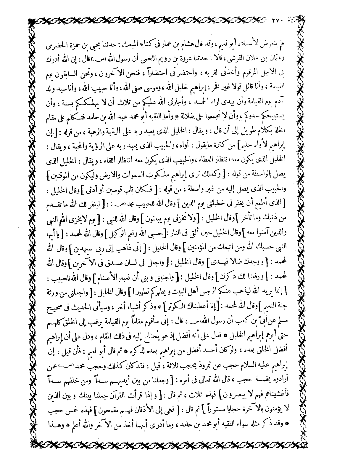 فَلَمْ يَتَعَرَّضْ لِإِسْنَادِهِ أَبُو نُعَيْمٍ، وَقَدْ قَالَ هِشَامُ بْنُ عَمَّارٍ فِي كِتَابِهِ الْمَبْعَثِ: حَدَّثَنَا يحيى بن حمزة الحضرميّ وعثمان بن علان الْقُرَشِيُّ، قَالَا: حَدَّثَنَا عُرْوَةُ بْنُ رُوَيْمٍ اللَّخْمِيُّ أَنَّ رَسُولَ اللَّهِ صَلَّى اللَّهُ عَلَيْهِ وَسَلَّمَ قَالَ: إِنَّ اللَّهَ أَدْرَكَ بِيَ الْأَجَلَ الْمَرْقُومَ وأخذنى لقربه، وَاحْتَضَرَنِي احْتِضَارًا، فَنَحْنُ الْآخِرُونَ، وَنَحْنُ السَّابِقُونَ يَوْمَ الْقِيَامَةِ، وَأَنَا قَائِلٌ قَوْلًا غَيْرَ فَخْرٍ: إِبْرَاهِيمُ خَلِيلُ اللَّهِ، وَمُوسَى صَفِّيُّ اللَّهِ، وَأَنَا حَبِيبُ اللَّهِ، وَأَنَا سَيِّدُ وَلَدِ آدَمَ يَوْمَ الْقِيَامَةِ وأن بيدي لواء الحمد، وَأَجَارَنِي اللَّهُ عَلَيْكُمْ مِنْ ثَلَاثٍ أَنْ لَا يهلككم بسنة، وأن يستبيحكم عدوكم، وأن لا تجمعوا على ضلالة وأما الْفَقِيهُ أَبُو مُحَمَّدٍ عَبْدُ اللَّهِ بْنُ حَامِدٍ فَتَكَلَّمَ عَلَى مَقَامِ الْخُلَّةِ بِكَلَامٍ طَوِيلٍ إِلَى أَنْ قَالَ: وَيُقَالُ: الْخَلِيلُ الَّذِي يَعْبُدُ رَبَّهُ عَلَى الرَّغْبَةِ وَالرَّهْبَةِ، مِنْ قَوْلِهِ: إِنَّ إِبْراهِيمَ لَأَوَّاهٌ حَلِيمٌ 9: 114 من كثرة ما يقول: أواه، وَالْحَبِيبُ الَّذِي يَعْبُدُ رَبَّهُ عَلَى الرُّؤْيَةِ وَالْمَحَبَّةِ، وَيُقَالُ: