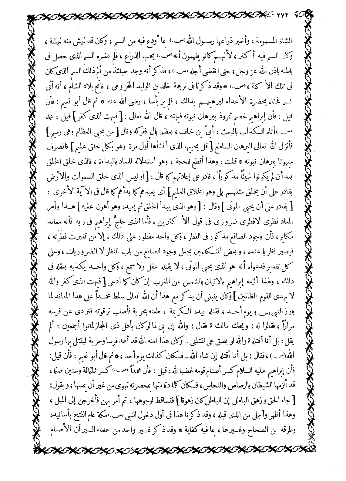 الشَّاةِ الْمَسْمُومَةِ، وَأَخْبَرَ ذِرَاعُهَا رَسُولِ اللَّهِ صَلَّى اللَّهُ عَلَيْهِ وَسَلَّمَ بِمَا أُودِعَ فِيهِ مِنَ السُّمِّ، وَكَانَ قَدْ نَهَشَ مِنْهُ نَهْشَةً، وَكَانَ السُّمُّ فِيهِ أَكْثَرَ، لِأَنَّهُمْ كَانُوا يَفْهَمُونَ أَنَّهُ صلّى الله عليه وسلّم يُحِبُّ الذِّرَاعَ، فَلَمْ يَضُرَّهُ السُّمُّ الَّذِي حَصَلَ فِي بَاطِنِهِ بِإِذْنِ اللَّهِ عَزَّ وَجَلَّ، حَتَّى انقضى أجله صلّى الله عليه وسلّم، فَذَكَرَ أَنَّهُ وَجَدَ حِينَئِذٍ مِنْ أَلَمِ ذَلِكَ السم الّذي كان في تلك الأكلة، صلّى الله عليه وسلّم وَقَدْ ذَكَرْنَا فِي تَرْجَمَةِ خَالِدِ بْنِ الْوَلِيدِ الْمَخْزُومِيِّ، فَاتِحِ بِلَادِ الشَّامِ، أَنَّهُ أُتِيَ بِسُمٍّ فحثاه بِحَضْرَةِ الْأَعْدَاءِ لِيُرْهِبَهُمْ بِذَلِكَ، فَلَمْ يَرَ بَأْسًا، رَضِيَ اللَّهُ عَنْهُ ثُمَّ قَالَ أَبُو نُعَيْمٍ: فأن قيل: فأن إبراهيم خصم نمروذ بِبُرْهَانِ نُبُوَّتِهِ فَبَهَتَهُ، قَالَ اللَّهُ تَعَالَى: فَبُهِتَ الَّذِي كَفَرَ 2: 258 قِيلَ: مُحَمَّدٌ صَلَّى اللَّهُ عَلَيْهِ وَسَلَّمَ أَتَاهُ الكذاب بِالْبَعْثِ، أُبَيُّ بْنُ خَلَفٍ، بِعَظْمٍ بَالٍ فَفَرَكَهُ وقال من يُحْيِ الْعِظامَ وَهِيَ رَمِيمٌ 36: 78 فَأَنْزَلَ اللَّهُ تَعَالَى الْبُرْهَانَ السَّاطِعَ قُلْ يُحْيِيهَا الَّذِي أَنْشَأَها أَوَّلَ مَرَّةٍ وَهُوَ بِكُلِّ خَلْقٍ عَلِيمٌ 36: 79 فَانْصَرَفَ مَبْهُوتًا بِبُرْهَانِ نُبُوَّتِهِ قُلْتُ: وَهَذَا أَقْطَعُ للحجة، وهو استدلاله للمعاد بِالْبَدَاءَةِ، فَالَّذِي خَلَقَ الْخَلْقَ بَعْدَ أَنْ لَمْ يَكُونُوا شَيْئًا مَذْكُورًا، قَادِرٌ عَلَى إِعَادَتِهِمْ كَمَا قَالَ: أَوَلَيْسَ الَّذِي خَلَقَ السَّماواتِ وَالْأَرْضَ بِقادِرٍ عَلى أَنْ يَخْلُقَ مِثْلَهُمْ بَلى وَهُوَ الْخَلَّاقُ الْعَلِيمُ 36: 81 أَيْ يُعِيدُهُمْ كَمَا بَدَأَهُمْ كَمَا قَالَ فِي الْآيَةِ الْأُخْرَى: