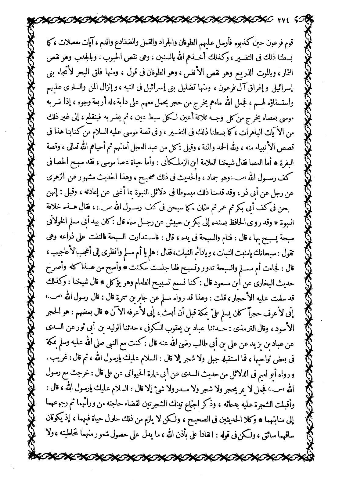 قَوْمِ فِرْعَوْنَ حِينَ كَذَّبُوهُ فَأَرْسَلَ عَلَيْهِمُ الطُّوفَانَ وَالْجَرَادَ وَالْقُمَّلَ وَالضَّفَادِعَ وَالدَّمَ، آيَاتٍ مُفَصَّلَاتٍ، كَمَا بَسَطْنَا ذَلِكَ فِي التَّفْسِيرِ، وَكَذَلِكَ أَخَذَهُمُ اللَّهُ بِالسِّنِينَ، وَهِيَ نَقْصُ الْحُبُوبِ: وَبِالْجَدْبِ وَهُوَ نَقْصُ الثِّمَارِ، وَبِالْمَوْتِ الذَّرِيعِ وَهُوَ نَقْصُ الْأَنْفُسِ، وَهُوَ الطُّوفَانُ فِي قَوْلٍ، وَمِنْهَا فَلْقُ الْبَحْرِ لِإِنْجَاءِ بنى إسرائيل وإغراق آل فرعون، ومنها تضليل بنى إسرائيل في التيه، وَإِنْزَالُ الْمَنِّ وَالسَّلْوَى عَلَيْهِمْ وَاسْتِسْقَاؤُهُ لَهُمْ، فَجَعَلَ اللَّهُ مَاءَهُمْ يَخْرُجُ مِنْ حَجَرٍ يُحْمَلُ مَعَهُمْ عَلَى دَابَّةٍ، لَهُ أَرْبَعَةُ وُجُوهٍ، إِذَا ضَرَبَهُ مُوسَى بِعَصَاهُ يَخْرُجُ مِنْ كُلِّ وَجْهٍ ثَلَاثَةُ أعين لكل سبط عين، ثم يضربه فينقلع، إِلَى غَيْرِ ذَلِكَ مِنَ الْآيَاتِ الْبَاهِرَاتِ، كَمَا بَسَطْنَا ذَلِكَ فِي التَّفْسِيرِ، وَفِي قِصَّةِ مُوسَى عَلَيْهِ السَّلَامُ مِنْ كِتَابِنَا هَذَا فِي قَصَصِ الأنبياء منه، وللَّه الحمد والمنة، وقيل: كل من عبد العجل أماتهم ثم أحياهم الله تعالى، وقصة البقرة أَمَّا الْعَصَا فَقَالَ شَيْخُنَا الْعَلَّامَةُ ابْنُ الزَّمْلَكَانِيِّ: وَأَمَّا حَيَاةُ عَصَا مُوسَى، فَقَدْ سَبَّحَ الْحَصَا فِي كَفِّ رَسُولِ اللَّهِ صَلَّى اللَّهُ عَلَيْهِ وَسَلَّمَ وَهُوَ جَمَادٌ، وَالْحَدِيثُ فِي ذَلِكَ صَحِيحٌ، وَهَذَا الْحَدِيثُ مَشْهُورٌ عَنِ الزُّهْرِيِّ عَنْ رَجُلٍ عَنْ أَبِي ذَرٍّ، وَقَدْ قَدَّمْنَا ذَلِكَ مَبْسُوطًا فِي دَلَائِلِ النُّبُوَّةِ بِمَا أَغْنَى عَنْ إِعَادَتِهِ، وقيل: أَنَّهُنَّ سَبَّحْنَ فِي كَفِّ أَبِي بَكْرٍ ثُمَّ عُمَرَ ثُمَّ عُثْمَانَ، كَمَا سَبَّحْنَ فِي كَفِّ رَسُولِ اللَّهِ صَلَّى اللَّهُ عَلَيْهِ وَسَلَّمَ، فَقَالَ هذه خلافة النبوة وقد روى الحافظ بسنده إلى بكر بن حبيش عَنْ رَجُلٍ سَمَّاهُ قَالَ: كَانَ بِيَدِ أَبِي مُسْلِمٍ الْخَوْلَانِيِّ سُبْحَةٌ يُسَبِّحُ بِهَا، قَالَ: فَنَامَ وَالسُّبْحَةُ فِي يَدِهِ، قَالَ: فَاسْتَدَارَتِ السُّبْحَةُ فَالْتَفَّتْ على ذِرَاعِهِ وَهِيَ تَقُولُ: سُبْحَانَكَ يَا مُنْبِتَ النَّبَاتِ، ويا دائم الثبات، فقال: هلم يَا أُمَّ مُسْلِمٍ وَانْظُرِي إِلَى أَعْجَبِ الْأَعَاجِيبِ، قَالَ: فَجَاءَتْ أُمُّ مُسْلِمٍ وَالسُّبْحَةُ تَدُورُ وَتُسَبِّحُ فَلَمَّا جَلَسَتْ سَكَتَتْ وَأَصَحُّ مِنْ هَذَا كُلِّهُ وَأَصْرَحُ حَدِيثُ الْبُخَارِيِّ عَنِ ابْنِ مَسْعُودٍ قَالَ: كُنَّا نَسْمَعُ تَسْبِيحَ الطَّعَامِ وَهُوَ يُؤْكَلُ قَالَ شَيْخُنَا: وَكَذَلِكَ قَدْ سَلَّمَتْ عَلَيْهِ الْأَحْجَارُ، قُلْتُ: وَهَذَا قَدْ رَوَاهُ مُسْلِمٍ عَنْ جَابِرِ بْنِ سَمُرَةَ قَالَ: قَالَ رَسُولُ اللَّهِ صَلَّى اللَّهُ عَلَيْهِ وسلم إني لأعرف حجرا كان يسلم علي بمكة قبل أن أبعث، إني لأعرفه الْآنَ قَالَ بَعْضُهُمْ: هُوَ الْحَجَرُ الْأَسْوَدُ، وَقَالَ التِّرْمِذِيُّ: حَدَّثَنَا عَبَّادُ بْنُ يَعْقُوبَ الْكُوفِيُّ، حَدَّثَنَا الْوَلِيدُ بْنُ أَبِي ثَوْرٍ عَنِ السُّدِّيِّ عَنْ عباد بْنِ يَزِيدَ عَنْ عَلِيِّ بْنِ أَبِي طَالِبٍ رَضِيَ اللَّهُ عَنْهُ قَالَ: كُنْتُ مَعَ النَّبِيِّ صَلَّى اللَّهُ عَلَيْهِ وَسَلَّمَ بِمَكَّةَ فِي بَعْضِ نَوَاحِيهَا، فَمَا اسْتَقْبَلَهُ جَبَلٌ وَلَا شَجَرٍ إِلَّا قَالَ: السَّلَامُ عَلَيْكَ يَا رَسُولَ اللَّهِ، ثُمَّ قَالَ: غَرِيبٌ. وَرَوَاهُ أَبُو نُعَيْمٍ فِي الدَّلَائِلِ مِنْ حديث السدي عن أبى عمارة الحيواني عَنْ عَلِيٍّ قَالَ: خَرَجْتُ مَعَ رَسُولِ اللَّهِ صَلَّى اللَّهُ عَلَيْهِ وَسَلَّمَ فَجَعَلَ لَا يَمُرُّ بِحَجَرٍ وَلَا شَجَرٍ وَلَا مَدَرٍ وَلَا شَيْءٍ إِلَّا قَالَ: السَّلَامُ عَلَيْكَ يَ