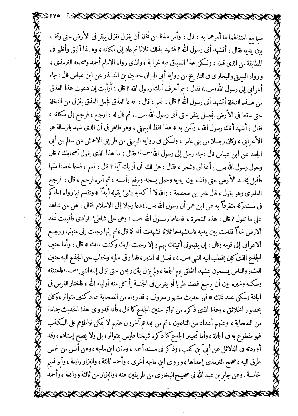 سِيَّمَا مَعَ امْتِثَالِهِمَا مَا أَمَرَهُمَا بِهِ، قَالَ: وَأَمَرَ عِذْقًا مِنْ نَخْلَةٍ أَنْ يَنْزِلَ فَنَزَلَ يبقر فِي الْأَرْضِ حَتَّى وَقَفَ بَيْنَ يَدَيْهِ فَقَالَ: أَتَشْهَدُ أَنِّي رَسُولُ اللَّهِ؟ فَشَهِدَ بِذَلِكَ ثَلَاثًا ثُمَّ عَادَ إِلَى مَكَانِهِ، وَهَذَا أَلْيَقُ وَأَظْهَرُ فِي الْمُطَابَقَةِ مِنَ الَّذِي قَبْلَهُ، وَلَكِنْ هَذَا السِّيَاقُ فِيهِ غَرَابَةٌ، وَالَّذِي رَوَاهُ الْإِمَامُ أَحْمَدُ وَصَحَّحَهُ التِّرْمِذِيُّ، وَرَوَاهُ الْبَيْهَقِيُّ وَالْبُخَارِيُّ فِي التَّارِيخِ من رواية أبى ظبيان حصين بن المنذر عَنِ ابْنِ عَبَّاسٍ قَالَ: جَاءَ أَعْرَابِيٌّ إِلَى رَسُولِ اللَّهِ صَلَّى اللَّهُ عَلَيْهِ وَسَلَّمَ فَقَالَ: بِمَ أَعْرِفُ أَنَّكَ رَسُولُ اللَّهِ؟ قَالَ: أَرَأَيْتَ إِنْ دَعَوْتُ هَذَا الْعِذْقَ مِنْ هَذِهِ النَّخْلَةِ أَتَشْهَدُ أَنِّي رَسُولُ اللَّهِ؟ قَالَ: نَعَمْ، قَالَ: فدعا العذق فجعل العذق ينزل من النخلة حتى سقط في الأرض فجعل ينقر حَتَّى أَتَى رَسُولَ اللَّهِ صَلَّى اللَّهُ عَلَيْهِ وَسَلَّمَ ثُمَّ قال له: ارجع، فرجع إِلَى مَكَانِهِ، فَقَالَ: أَشْهَدُ أَنَّكَ رَسُولُ اللَّهِ، وَآمَنَ بِهِ هَذَا لَفْظُ الْبَيْهَقِيُّ، وَهُوَ ظَاهِرٌ فِي أَنَّ الَّذِي شَهِدَ بِالرِّسَالَةِ هُوَ الْأَعْرَابِيُّ، وَكَانَ رَجُلًا مِنْ بَنِي عَامِرٍ، وَلَكِنْ فِي رِوَايَةِ الْبَيْهَقِيِّ مِنْ طَرِيقِ الْأَعْمَشُ عَنْ سَالِمِ بْنِ أَبِي الْجَعْدِ عَنِ ابْنِ عَبَّاسٍ قَالَ: جَاءَ رَجُلٌ إِلَى رَسُولِ اللَّهِ صَلَّى اللَّهُ عَلَيْهِ وَسَلَّمَ فَقَالَ: مَا هَذَا الَّذِي يَقُولُ أَصْحَابُكَ؟ قَالَ وَحَوْلَ رَسُولِ اللَّهِ صَلَّى اللَّهُ عَلَيْهِ وَسَلَّمَ أَعْذَاقٌ وَشَجَرٌ، فَقَالَ: هَلْ لَكَ أَنْ أُرِيَكَ آيَةً؟ قَالَ: نَعَمْ، فَدَعَا غُصْنًا مِنْهَا فَأَقْبَلَ يَخُدُّ الْأَرْضَ حَتَّى وَقَفَ بَيْنَ يَدَيْهِ وَجَعَلَ يَسْجُدُ وَيَرْفَعُ رَأْسَهُ، ثُمَّ أَمَرَهُ فرجع، قال: فرجع العامري وهو يقول، قال عَامِرِ بْنِ صَعْصَعَةَ: وَاللَّهِ لَا أُكَذِّبُهُ بِشَيْءٍ يَقُولُهُ أَبَدًا وَتَقَدَّمَ فِيمَا رَوَاهُ الْحَاكِمُ فِي مُسْتَدْرَكِهِ مُتَفَرِّدًا بِهِ عَنِ ابْنِ عُمَرَ أَنَّ رَسُولَ اللَّهِ صَلَّى اللَّهُ عَلَيْهِ وَسَلَّمَ دَعَا رَجُلًا إِلَى الْإِسْلَامِ فَقَالَ: هَلْ مِنْ شَاهِدٍ عَلَى مَا تَقُولُ؟ قَالَ: هَذِهِ الشَّجَرَةُ، فَدَعَاهَا رَسُولِ اللَّهِ صَلَّى اللَّهُ عَلَيْهِ وَسَلَّمَ وَهِيَ عَلَى شَاطِئِ الْوَادِي فَأَقْبَلَتْ تَخُدُّ الْأَرْضَ خَدًّا فَقَامَتْ بَيْنَ يَدَيْهِ فَاسْتَشْهَدَهَا ثَلَاثًا فَشَهِدَتْ أَنَّهُ كَمَا قَالَ، ثُمَّ إِنَّهَا رَجَعَتْ إِلَى مَنْبَتِهَا وَرَجَعَ الْأَعْرَابِيُّ إِلَى قَوْمِهِ وَقَالَ: إِنْ يَتَّبِعُونِي أَتَيْتُكَ بِهِمْ وَإِلَّا رَجَعْتُ إِلَيْكَ وَكُنْتُ مَعَكَ قَالَ: وَأَمَّا حَنِينُ الْجِذْعِ الَّذِي كَانَ يَخْطُبُ إِلَيْهِ النَّبِيُّ صَلَّى اللَّهُ عَلَيْهِ وَسَلَّمَ، فَعُمِلَ لَهُ الْمِنْبَرُ، فَلَمَّا رَقِيَ عَلَيْهِ وَخَطَبَ حَنَّ الجذع اليه حنين العشار والناس يسمعون بِمَشْهَدِ الْخَلْقِ يَوْمَ الْجُمُعَةِ، وَلَمْ يَزَلْ يَئِنُّ وَيَحِنُّ حَتَّى نَزَلَ إِلَيْهِ النَّبِيُّ صَلَّى اللَّهُ عَلَيْهِ وَسَلَّمَ فَاعْتَنَقَهُ وَسَكَّنَهُ وَخَيَّرَهُ بَيْنَ أَنْ يَرْجِعَ غُصْنًا طَرِيًّا أَوْ يُغْرَسَ فِي الْجَنَّةِ يَأْكُلُ مِنْهُ أَوْلِيَاءُ اللَّهِ، فَاخْتَارَ الْغَرْسَ فِي الْجَنَّةِ وَسَكَنَ عِنْدَ ذَلِكَ فَهُوَ حَدِيثٌ مَشْهُورٌ مَعْرُوفٌ، قَدْ رَوَاهُ مِنَ الصَّحَابَةِ عَدَدٌ كَثِيرٌ مُتَوَاتِرٌ، وَكَانَ بِحُضُورِ الْخَلَائِقِ، وَهَذَا الَّذِي ذَكَرَهُ من تواتر حنين الجذع كَمَا قَالَ، فَإِنَّهُ قَد
