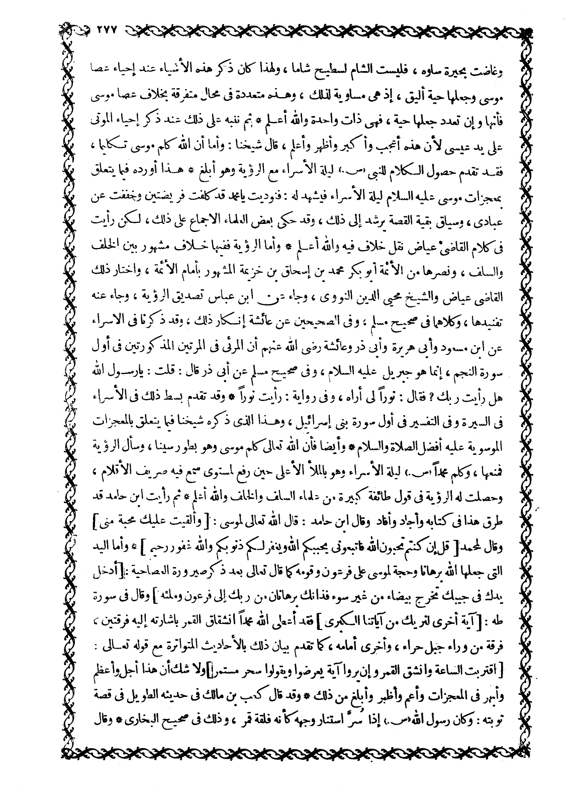 وَغَاضَتْ بُحَيْرَةُ سَاوَهْ، فَلَيْسَتِ الشَّامُ لِسَطِيحٍ شَامًا، وَلِهَذَا كَانَ ذِكْرُ هَذِهِ الْأَشْيَاءِ عِنْدَ إِحْيَاءِ عَصَا مُوسَى وَجَعْلِهَا حَيَّةً أَلْيَقَ، إِذْ هِيَ مساوية لذلك، وهذه متعددة فِي مَحَالٍّ مُتَفَرِّقَةٍ بِخِلَافِ عَصَا مُوسَى فَإِنَّهَا وَإِنْ تَعَدَّدَ جَعْلُهَا حَيَّةً، فَهِيَ ذَاتٌ وَاحِدَةٌ وَاللَّهُ أَعْلَمُ ثُمَّ نُنَبِّهُ عَلَى ذَلِكَ عِنْدَ ذِكْرِ إِحْيَاءِ الْمَوْتَى عَلَى يَدِ عِيسَى لِأَنَّ هذه أعجب وأكبر وأظهر وأعلم، قَالَ شَيْخُنَا: وَأَمَّا أَنَّ اللَّهَ كَلَّمَ مُوسَى تَكْلِيمًا، فَقَدْ تَقَدَّمَ حُصُولُ الْكَلَامِ لِلنَّبِيِّ صَلَّى الله عليه وسلّم ليلة الأسراء مع الرؤية وهو أبلغ هذا أورده فيما يتعلق بمعجزات موسى عليه السلام ليلة الأسراء فيشهد له: فنوديت يا محمد قد كلفت فريضتين وَخَفَّفْتُ عَنْ عِبَادِي، وَسِيَاقُ بَقِيَّةِ الْقِصَّةِ يُرْشِدُ إِلَى ذَلِكَ، وَقَدْ حَكَى بَعْضُ الْعُلَمَاءِ الْإِجْمَاعَ عَلَى ذَلِكَ، لَكِنْ رَأَيْتُ فِي كَلَامِ الْقَاضِي عِيَاضٍ نَقْلَ خِلَافٍ فِيهِ وَاللَّهُ أَعْلَمُ وَأَمَّا الرُّؤْيَةُ فَفِيهَا خِلَافٌ مَشْهُورٌ بَيْنَ الْخَلَفِ وَالسَّلَفِ، وَنَصَرَهَا مِنَ الْأَئِمَّةِ أَبُو بَكْرٍ مُحَمَّدُ بْنُ إِسْحَاقَ بْنِ خُزَيْمَةَ الْمَشْهُورُ بِإِمَامِ الْأَئِمَّةِ، وَاخْتَارَ ذَلِكَ الْقَاضِي عِيَاضٌ وَالشَّيْخُ مُحْيِي الدِّينِ النَّوَوِيُّ، وَجَاءَ عَنِ ابْنِ عَبَّاسٍ تَصْدِيقُ الرُّؤْيَةِ، وَجَاءَ عنه تفنيدها، وَكِلَاهُمَا فِي صَحِيحِ مُسْلِمٍ، وَفِي الصَّحِيحَيْنِ عَنْ عَائِشَةَ إِنْكَارُ ذَلِكَ، وَقَدْ ذَكَرْنَا فِي الْإِسْرَاءِ عَنِ ابْنِ مَسْعُودٍ وَأَبِي هُرَيْرَةَ وَأَبِي ذَرٍ وَعَائِشَةَ رَضِيَ اللَّهُ عَنْهُمْ أَنَّ الْمَرْئِيَّ فِي الْمَرَّتَيْنِ الْمَذْكُورَتَيْنِ فِي أَوَّلِ سُورَةِ النَّجْمِ، إِنَّمَا هُوَ جِبْرِيلُ عَلَيْهِ السَّلَامُ، وَفِي صَحِيحِ مُسْلِمٍ عَنْ أَبِي ذَرٍّ قَالَ: قُلْتُ: يَا رَسُولَ الله هل رأيت ربك؟ فقال: نورا لي أَرَاهُ، وَفِي رِوَايَةٍ: رَأَيْتُ نُورًا وَقَدْ تَقَدَّمَ بَسْطُ ذَلِكَ فِي الْإِسْرَاءِ فِي السِّيرَةِ وَفِي التَّفْسِيرِ فِي أَوَّلِ سُورَةِ بَنِي إِسْرَائِيلَ، وَهَذَا الَّذِي ذَكَرَهُ شَيْخُنَا فِيمَا يَتَعَلَّقُ بِالْمُعْجِزَاتِ الْمُوسَوِيَّةِ عَلَيْهِ أَفْضَلُ الصَّلَاةِ وَالسَّلَامِ وَأَيْضًا فَإِنَّ اللَّهَ تعالى كلم موسى وهو بطور سينا، وَسَأَلَ الرُّؤْيَةَ فَمُنِعَهَا، وَكَلَّمَ مُحَمَّدًا صَلَّى اللَّهُ عَلَيْهِ وَسَلَّمَ لَيْلَةَ الْإِسْرَاءِ وَهُوَ بِالْمَلَأِ الْأَعْلَى حين رفع لمستوى سمع فِيهِ صَرِيفَ الْأَقْلَامِ، وَحَصَلَتْ لَهُ الرُّؤْيَةُ فِي قَوْلِ طَائِفَةٍ كَبِيرَةٍ مِنْ عُلَمَاءِ السَّلَفِ وَالْخَلَفِ وَاللَّهُ أَعْلَمُ ثُمَّ رَأَيْتُ ابْنَ حَامِدٍ قَدْ طَرَقَ هَذَا فِي كِتَابِهِ وَأَجَادَ وَأَفَادَ وَقَالَ ابْنُ حَامِدٍ: قَالَ اللَّهُ تَعَالَى لِمُوسَى: وَأَلْقَيْتُ عَلَيْكَ مَحَبَّةً مِنِّي 20: 39 وَقَالَ لِمُحَمَّدٍ قُلْ إِنْ كُنْتُمْ تُحِبُّونَ اللَّهَ فَاتَّبِعُونِي يُحْبِبْكُمُ اللَّهُ وَيَغْفِرْ لَكُمْ ذُنُوبَكُمْ وَالله غَفُورٌ رَحِيمٌ 3: 31 وَأَمَّا الْيَدُ الَّتِي جَعَلَهَا اللَّهُ بُرْهَانًا وَحُجَّةً لِمُوسَى عَلَى فِرْعَوْنَ وَقَوْمِهِ كَمَا قَالَ تَعَالَى بعد ذكر صيرورة العصاحية: أَدْخِلْ يَدَكَ فِي جَيْبِكَ تَخْرُجْ بَيْضاءَ مِنْ غَيْرِ سُوءٍ 27: 12 ... فَذانِكَ بُرْهانانِ من رَبِّكَ إِلى فِرْعَوْنَ وَمَلَائِهِ 28: 32 وَقَالَ فِي سُورَةِ طه: آيَةً أُخْرى لِنُرِيَكَ من آياتِنَا الْكُبْرى 20: 22- 23 فقد أعطى الله محمدا انشقاق القمر بإشارته إليه فرقتين، فرقة من وراء جبل حراء، وأخرى أمامه، كما تقدم بيان ذلك بالأ