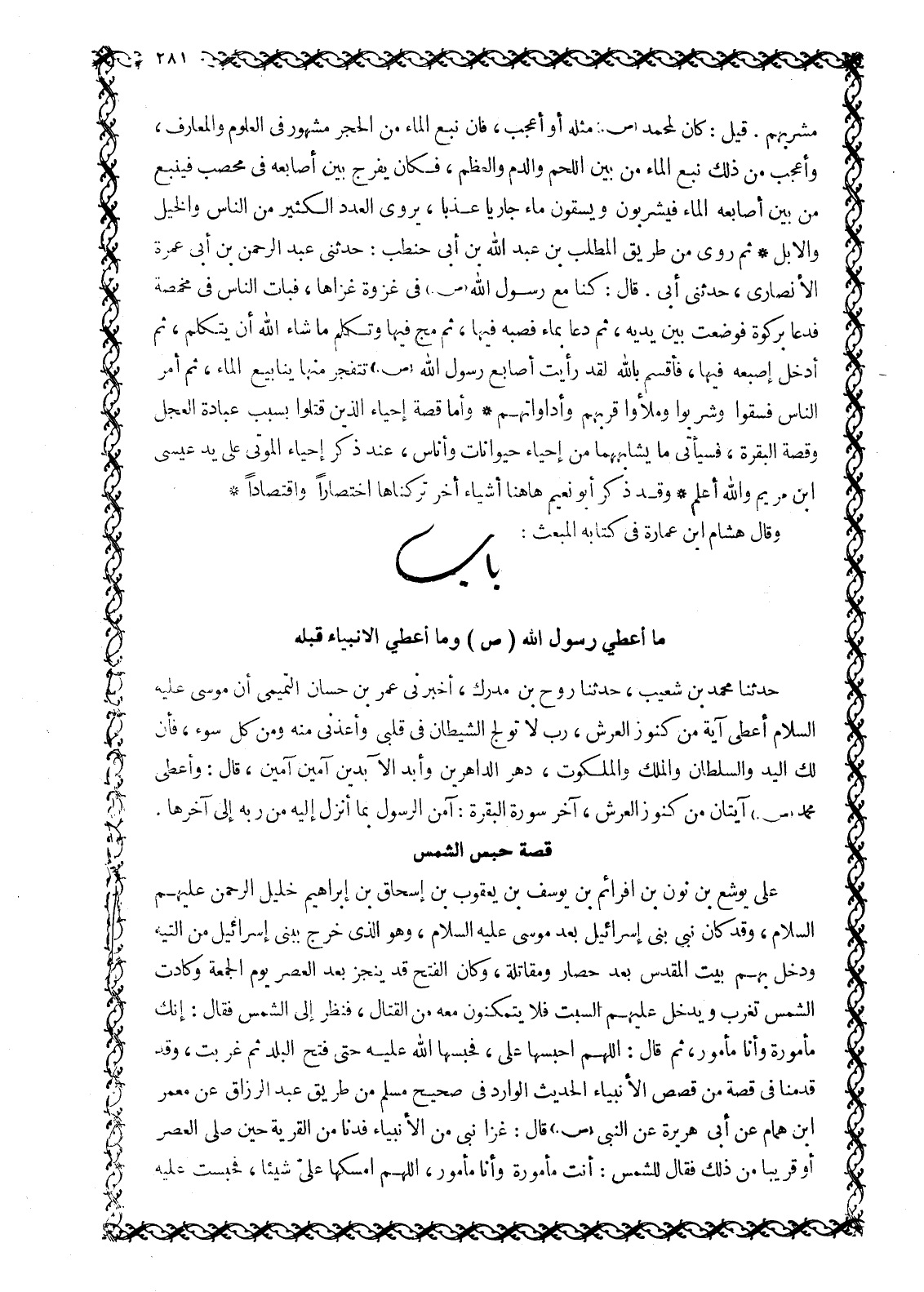 مَشْرَبَهُمْ. قِيلَ: كَانَ لِمُحَمَّدٍ صَلَّى اللَّهُ عَلَيْهِ وسلّم مثله أو أعجب، فَإِنَّ نَبْعَ الْمَاءِ مِنَ الْحَجْرِ مَشْهُورٌ فِي الْعُلُومِ وَالْمَعَارِفِ، وَأَعْجَبُ مِنْ ذَلِكَ نَبْعُ الْمَاءِ من بين اللحم والدم والعظم، فكان يفرج بين أصابعه في محصب فَيَنْبُعُ مِنْ بَيْنِ أَصَابِعِهِ الْمَاءُ فَيَشْرَبُونَ وَيُسْقَوْنَ مَاءً جَارِيًا عَذْبًا، يَرْوِي الْعَدَدَ الْكَثِيرَ مِنَ النَّاسِ وَالْخَيْلِ وَالْإِبِلِ ثُمَّ رَوَى مِنْ طَرِيقِ الْمُطَّلِبِ بْنِ عَبْدِ اللَّهِ بْنِ أَبِي حَنْطَبٍ: حَدَّثَنِي عَبْدُ الرَّحْمَنِ بْنُ أَبِي عَمْرَةَ الْأَنْصَارِيُّ، حَدَّثَنِي أَبِي. قَالَ: كُنَّا مَعَ رَسُولِ اللَّهِ صَلَّى اللَّهُ عَلَيْهِ وَسَلَّمَ فِي غَزْوَةٍ غَزَاهَا، فبات الناس في مَخْمَصَةٌ فَدَعَا بِرَكْوَةٍ فَوُضِعَتْ بَيْنَ يَدَيْهِ، ثُمَّ دَعَا بِمَاءٍ فَصَبَّهُ فِيهَا، ثُمَّ مَجَّ فِيهَا وتكلم ما شَاءَ اللَّهُ أَنْ يَتَكَلَّمَ، ثُمَّ أَدْخَلَ أُصْبُعَهُ فِيهَا، فَأُقْسِمُ باللَّه لَقَدْ رَأَيْتُ أَصَابِعِ رَسُولِ اللَّهِ صَلَّى اللَّهُ عَلَيْهِ وَسَلَّمَ تَتَفَجَّرُ مِنْهَا يَنَابِيعُ الْمَاءِ، ثُمَّ أَمَرَ النَّاسَ فَسَقَوْا وَشَرِبُوا وملئوا قِرَبَهُمْ وَإِدَاوَاتِهِمْ وَأَمَّا قِصَّةُ إِحْيَاءِ الَّذِينَ قُتِلُوا بِسَبَبِ عِبَادَةِ الْعِجْلِ وَقِصَّةِ الْبَقَرَةِ، فَسَيَأْتِي مَا يُشَابِهُهُمَا مِنْ إِحْيَاءِ حَيَوَانَاتٍ وَأُنَاسٍ، عِنْدَ ذِكْرِ إِحْيَاءِ الْمَوْتَى عَلَى يَدِ عِيسَى ابْنِ مَرْيَمَ والله أعلم وقد ذكر أبو نعيم هاهنا أَشْيَاءَ أُخَرَ تَرَكْنَاهَا اخْتِصَارًا وَاقْتِصَادًا وَقَالَ هِشَامُ ابن عمارة في كتابه المبعث: