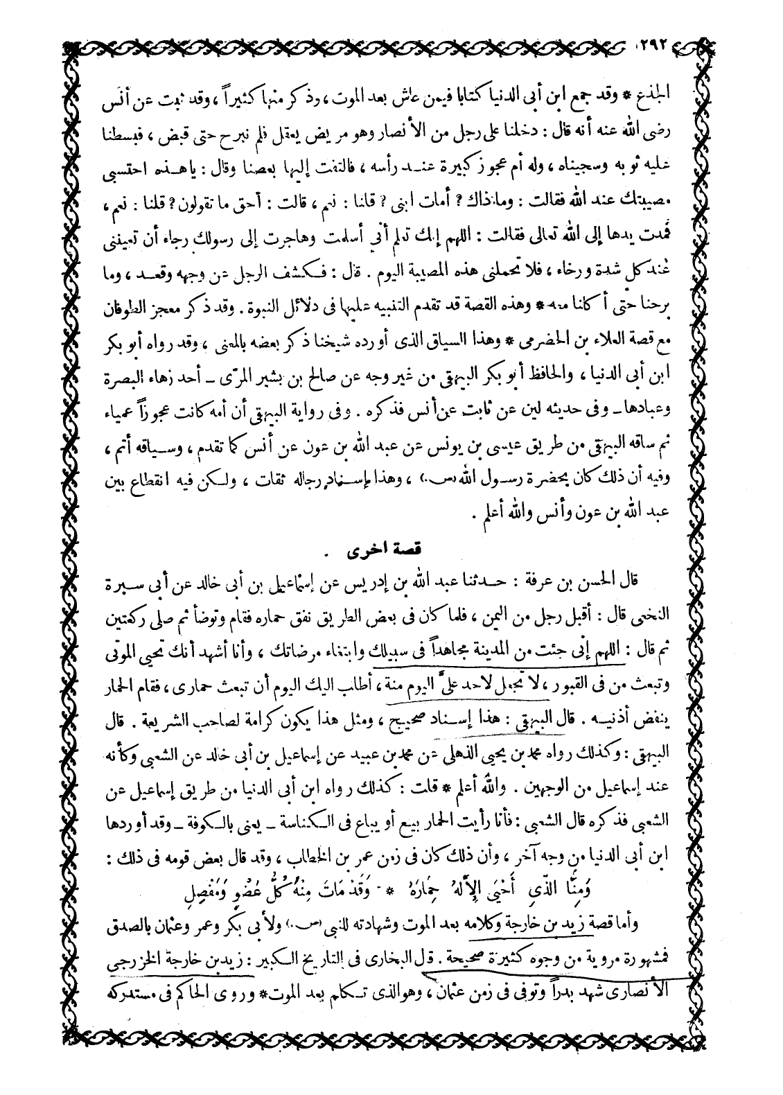 الجذع وَقَدْ جَمَعَ ابْنُ أَبِي الدُّنْيَا كِتَابًا فِيمَنْ عَاشَ بَعْدَ الْمَوْتِ، وَذَكَرَ مِنْهَا كَثِيرًا، وَقَدْ ثَبَتَ عَنْ أَنَسٍ رَضِيَ اللَّهُ عَنْهُ أَنَّهُ قَالَ: دَخَلْنَا عَلَى رَجُلٍ مِنَ الْأَنْصَارِ وَهُوَ مَرِيضٌ يَعْقِلُ فَلَمْ نَبْرَحْ حَتَّى قُبِضَ، فَبَسَطْنَا عَلَيْهِ ثَوْبَهُ وَسَجَّيْنَاهُ، وَلَهُ أَمٌّ عَجُوزٌ كَبِيرَةٌ عِنْدَ رَأْسِهِ، فَالْتَفَتَ إِلَيْهَا بَعْضُنَا وَقَالَ: يَا هَذِهِ احْتَسِبِي مُصِيبَتَكِ عِنْدَ اللَّهِ فَقَالَتْ: وَمَا ذَاكَ؟ أَمَاتَ ابْنِي؟ قُلْنَا: نَعَمْ، قَالَتْ: أَحَقٌّ ما تقولون؟ قلنا: نعم، فمدت يدها إِلَى اللَّهِ تَعَالَى فَقَالَتِ: اللَّهمّ إِنَّكَ تَعْلَمُ أَنِّي أَسْلَمْتُ وَهَاجَرْتُ إِلَى رَسُولِكَ رَجَاءَ أَنْ تعينني عِنْدَ كُلِّ شِدَّةٍ وَرَخَاءٍ، فَلَا تُحَمِّلْنِي هَذِهِ الْمُصِيبَةَ الْيَوْمَ. قَالَ: فَكَشَفَ الرَّجُلُ عَنْ وَجْهِهِ وَقَعَدَ، وَمَا بَرِحْنَا حَتَّى أَكَلْنَا مَعَهُ وَهَذِهِ الْقِصَّةُ قَدْ تَقَدَّمَ التَّنْبِيهُ عَلَيْهَا فِي دَلَائِلِ النبوة. وقد ذِكْرِ مُعْجِزِ الطُّوفَانِ مَعَ قِصَّةِ الْعَلَاءِ بْنِ الْحَضْرَمِيِّ وَهَذَا السِّيَاقُ الَّذِي أَوْرَدَهُ شَيْخُنَا ذَكَرَ بعضه بالمعنى، وَقَدْ رَوَاهُ أَبُو بَكْرٍ ابْنُ أَبِي الدُّنْيَا، وَالْحَافِظُ أَبُو بَكْرٍ الْبَيْهَقِيُّ مِنْ غَيْرِ وَجْهٍ عَنْ صَالِحِ بْنِ بَشِيرٍ الْمُرِّيِّ- أحد زهاء الْبَصْرَةِ وَعُبَّادِهَا- وَفِي حَدِيثِهِ لِينٌ عَنْ ثَابِتٍ عَنْ أَنَسٍ فَذَكَرَهُ. وَفِي رِوَايَةِ الْبَيْهَقِيِّ أَنَّ أُمَّهُ كَانَتْ عَجُوزًا عَمْيَاءَ ثُمَّ سَاقَهُ الْبَيْهَقِيُّ مِنْ طَرِيقِ عِيسَى بْنِ يُونُسَ عَنْ عَبْدِ اللَّهِ بْنِ عَوْنٍ عَنْ أَنَسٍ كَمَا تَقَدَّمَ، وَسِيَاقُهُ أَتَمُّ، وَفِيهِ أَنَّ ذَلِكَ كَانَ بِحَضْرَةِ رَسُولُ اللَّهِ صَلَّى اللَّهُ عَلَيْهِ وَسَلَّمَ، وَهَذَا إسناد رِجَالُهُ ثِقَاتٌ، وَلَكِنْ فِيهِ انْقِطَاعٌ بَيْنَ عَبْدِ الله بن عون وأنس والله أعلم.