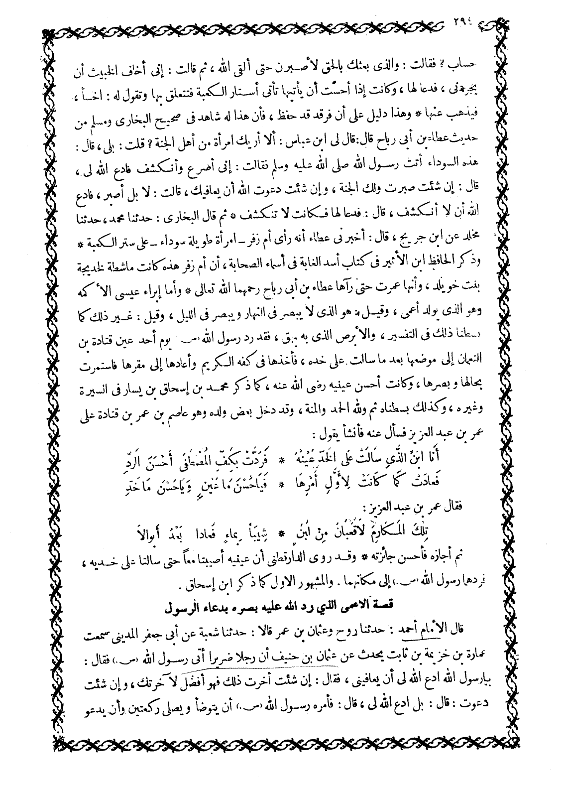 حِسَابٌ؟ فَقَالَتْ: وَالَّذِي بَعَثَكَ بِالْحَقِّ لَأَصْبِرَنَّ حَتَّى أَلْقَى اللَّهَ، ثُمَّ قَالَتْ: إِنِّي أَخَافُ الْخَبِيثَ أن يجردنى، فدعا لها، وكانت إذا أحست أن يأتيها تأتى أستار الكعبة فتتعلق بِهَا وَتَقُولُ لَهُ: اخْسَأْ، فَيَذْهَبُ عَنْهَا وَهَذَا دليل على أن فرقد قَدْ حَفِظَ، فَإِنَّ هَذَا لَهُ شَاهَدٌ فِي صَحِيحِ الْبُخَارِيِّ وَمُسْلِمٍ مِنْ حَدِيثِ عَطَاءِ بْنِ أبي رباح قال: قال لي ابن عباس: ألا أريك امرأة من أهل الجنة؟ قلت: بَلَى، قَالَ: