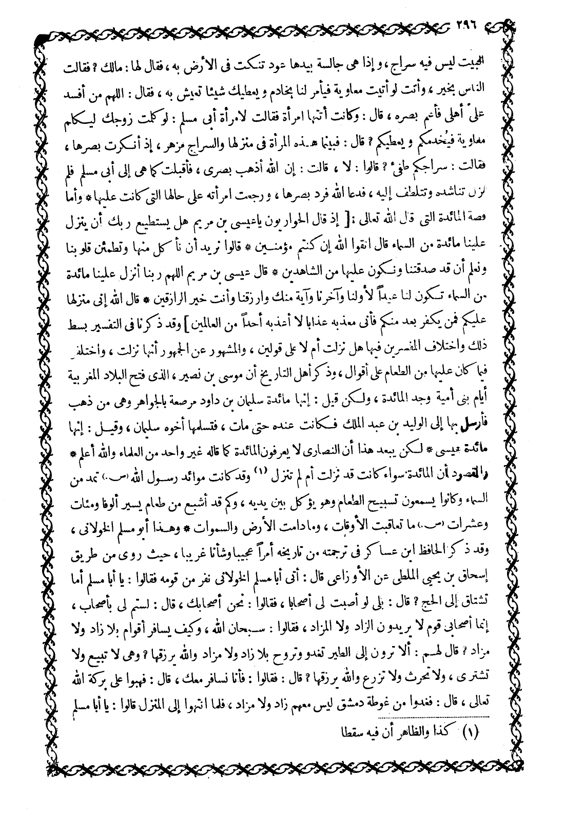 الْبَيْتُ لَيْسَ فِيهِ سِرَاجٌ، وَإِذَا هِيَ جَالِسَةٌ بيدها عود تنكت في الأرض به، فقال لها: مالك؟ فقالت الناس بخير، وأنت لَوْ أَتَيْتَ مُعَاوِيَةَ فَيَأْمُرُ لَنَا بِخَادِمٍ وَيُعْطِيكَ شَيْئًا تَعِيشُ بِهِ، فَقَالَ: اللَّهمّ مَنْ أَفْسَدَ عَلَيَّ أَهْلِي فَأَعْمِ بَصَرَهُ، قَالَ: وَكَانَتْ أَتَتْهَا امرأة فقالت لامرأة أَبِي مُسْلِمٍ: لَوْ كَلَّمْتِ زَوْجَكِ لِيُكَلِّمَ مُعَاوِيَةَ فيخدمكم وَيُعْطِيَكُمْ؟ قَالَ: فَبَيْنَمَا هَذِهِ الْمَرْأَةُ فِي مَنْزِلِهَا والسراج مزهر، إِذْ أَنْكَرَتْ بَصَرَهَا، فَقَالَتْ: سِرَاجُكُمْ طُفِئَ؟ قَالُوا: لا، قالت: إن الله أُذْهِبَ بَصَرِي، فَأَقْبَلَتْ كَمَا هِيَ إِلَى أَبِي مسلم فلم تزل تناشده وتتلطف إِلَيْهِ، فَدَعَا اللَّهَ فَرَدَّ بَصَرَهَا، وَرَجَعَتِ امْرَأَتُهُ على حَالِهَا الَّتِي كَانَتْ عَلَيْهَا وَأَمَّا قِصَّةُ الْمَائِدَةِ الَّتِي قَالَ اللَّهُ تَعَالَى: إِذْ قَالَ الْحَوارِيُّونَ يَا عِيسَى ابْنَ مَرْيَمَ هَلْ يَسْتَطِيعُ رَبُّكَ أَنْ يُنَزِّلَ عَلَيْنا مائِدَةً مِنَ السَّماءِ قَالَ اتَّقُوا اللَّهَ إِنْ كُنْتُمْ مُؤْمِنِينَ قالُوا نُرِيدُ أَنْ نَأْكُلَ مِنْها وَتَطْمَئِنَّ قُلُوبُنا وَنَعْلَمَ أَنْ قَدْ صَدَقْتَنا وَنَكُونَ عَلَيْها مِنَ الشَّاهِدِينَ قَالَ عِيسَى ابْنُ مَرْيَمَ اللَّهُمَّ رَبَّنا أَنْزِلْ عَلَيْنا مائِدَةً مِنَ السَّماءِ تَكُونُ لَنا عِيداً لِأَوَّلِنا وَآخِرِنا وَآيَةً مِنْكَ وَارْزُقْنا وَأَنْتَ خَيْرُ الرَّازِقِينَ قَالَ اللَّهُ إِنِّي مُنَزِّلُها عَلَيْكُمْ فَمَنْ يَكْفُرْ بَعْدُ مِنْكُمْ فَإِنِّي أُعَذِّبُهُ عَذاباً لَا أُعَذِّبُهُ أَحَداً من الْعالَمِينَ 5: 112- 115 وَقَدْ ذَكَرْنَا فِي التَّفْسِيرِ بَسْطَ ذَلِكَ وَاخْتِلَافَ الْمُفَسِّرِينَ فِيهَا هَلْ نَزَلَتْ أَمْ لَا عَلَى قولين، والمشهور عن الجمهور أنها نزلت، واختلفوا فِيمَا كَانَ عَلَيْهَا مِنَ الطَّعَامِ عَلَى أَقْوَالِ، وَذَكَرَ أَهْلُ التَّارِيخِ أَنَّ مُوسَى بْنَ نُصَيْرٍ، الَّذِي فَتَحَ الْبِلَادَ الْمَغْرِبِيَّةَ أَيَّامَ بَنِي أُمَيَّةَ وَجَدَ الْمَائِدَةَ، وَلَكِنْ قِيلَ: إِنَّهَا مَائِدَةُ سُلَيْمَانَ بْنِ دَاوُدَ مُرَصَّعَةٌ بِالْجَوَاهِرِ وَهِيَ مِنْ ذَهَبٍ فَأَرْسَلَ بِهَا إِلَى الْوَلِيدِ بْنِ عَبْدِ الْمَلِكِ فَكَانَتْ عِنْدَهُ حَتَّى مَاتَ، فَتَسَلَّمَهَا أَخُوهُ سُلَيْمَانُ، وَقِيلَ: إِنَّهَا مَائِدَةُ عِيسَى لَكِنْ يَبْعُدُ هَذَا أَنَّ النَّصَارَى لَا يَعْرِفُونَ الْمَائِدَةَ كَمَا قَالَهُ غَيْرُ وَاحِدٍ مِنَ الْعُلَمَاءِ وَاللَّهُ أَعْلَمُ وَالْمَقْصُودُ أَنَّ الْمَائِدَةَ سَوَاءٌ كَانَتْ قَدْ نَزَلَتْ أَمْ لم تنزل [1] وقد كَانَتْ مَوَائِدُ رَسُولِ اللَّهِ صَلَّى اللَّهُ عَلَيْهِ وَسَلَّمَ تُمَدُّ مِنَ السَّمَاءِ وَكَانُوا يَسْمَعُونَ تَسْبِيحَ الطَّعَامِ وَهُوَ يُؤْكَلُ بَيْنَ يَدَيْهِ، وَكَمْ قَدْ أَشْبَعَ مِنْ طَعَامٍ يَسِيرٍ أُلُوفًا وَمِئَاتٍ وَعَشَرَاتٍ صلّى الله عليه وسلم ما تعاقبت الأوقات، وما دامت الأرض والسموات وهذا أبو مسلم الخولانيّ، وقد ذَكَرَ الْحَافِظُ ابْنُ عَسَاكِرَ فِي تَرْجَمَتِهِ مِنْ تَارِيخِهِ أَمْرًا عَجِيبًا وَشَأْنًا غَرِيبًا، حَيْثُ رُوِيَ من طريق إسحاق بن يحيى الْمَلْطِيِّ عَنِ الْأَوْزَاعِيِّ قَالَ: أَتَى أَبَا مُسْلِمٍ الْخَوْلَانِيَّ نَفَرٌ مِنْ قَوْمِهِ فَقَالُوا: يَا أَبَا مُسْلِمٍ أَمَا تَشْتَاقُ إِلَى الْحَجِّ؟ قَالَ: بَلَى لو أصبت لي أصحابا، فَقَالُوا: نَحْنُ أَصْحَابُكَ، قَالَ: لَسْتُمْ لِي بِأَصْحَابٍ، إِنَّمَا أَصْحَابِي قَوْمٌ لَا يُرِيدُونَ الزَّادَ وَلَا المزاد، فقالوا: سبحان الله، وكيف يسافر أقوام بِلَا زَادٍ وَلَا مَزَادٍ؟ قَالَ لَهُمْ: أَلَا تَرَوْنَ إِلَى الطَّيْرِ تَ