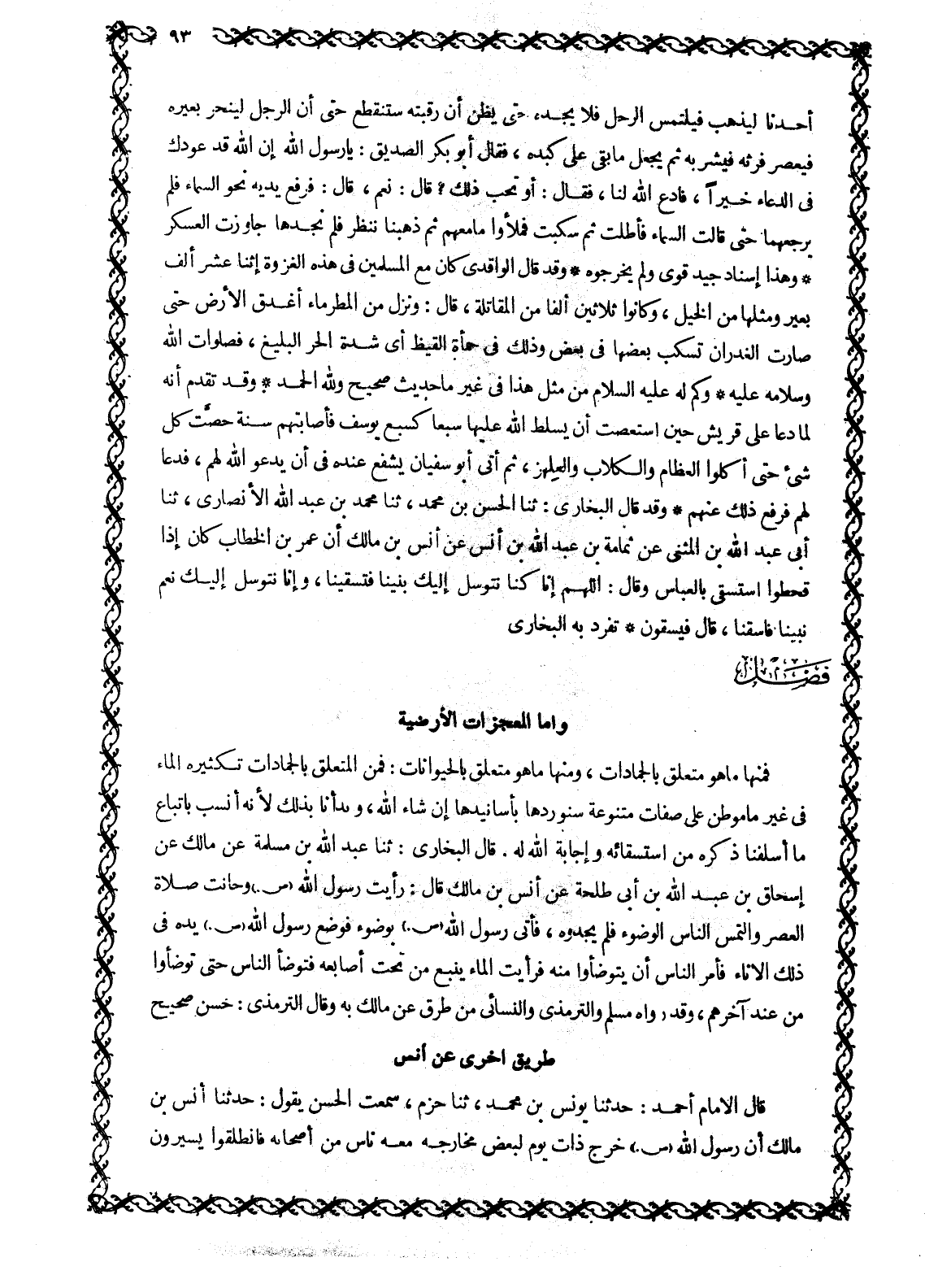 أحدنا ليذهب فيلتمس الرحل فلا يجده حَتَّى يَظُنَّ أَنَّ رَقَبَتَهُ سَتَنْقَطِعُ حَتَّى إِنَّ الرجل لينحر بعيره فيعصر فَرْثَهُ فَيَشْرَبُهُ ثُمَّ يَجْعَلُ مَا بَقِيَ عَلَى كَبِدِهِ، فَقَالَ أَبُو بَكْرٍ الصِّدِّيقُ: يَا رَسُولَ اللَّهِ إِنَّ اللَّهَ قَدْ عَوَّدَكَ فِي الدُّعَاءِ خَيْرًا، فَادْعُ اللَّهَ لَنَا، فَقَالَ: أو تحب ذَلِكَ؟ قَالَ: نَعَمْ، قَالَ: فَرَفَعَ يَدَيْهِ نَحْوَ السماء فلم يرجعهما حتى قالت السماء فأطلت ثُمَّ سَكَبَتْ فَمَلَئُوا مَا مَعَهُمْ ثُمَّ ذَهَبْنَا نَنْظُرُ فَلَمْ نَجِدْهَا جَاوَزَتِ الْعَسْكَرَ وَهَذَا إِسْنَادٌ جِيدٌ قَوِيٌّ وَلَمْ يُخْرِجُوهُ وَقَدْ قال الواقدي كَانَ مَعَ الْمُسْلِمِينَ فِي هَذِهِ الْغَزْوَةِ اثْنَا عَشَرَ أَلْفَ بَعِيرٍ وَمَثَلُهَا مِنَ الْخَيْلِ، وَكَانُوا ثَلَاثِينَ أَلْفًا مِنَ الْمُقَاتِلَةِ، قَالَ: وَنَزَلَ مِنَ الْمَطَرِ مَاءٌ أَغْدَقَ الْأَرْضَ حَتَّى صَارَتِ الْغُدْرَانُ تسكب بعضها في بعض وذلك في حمأة الْقَيْظِ أَيْ شِدَّةِ الْحَرِّ الْبَلِيغِ، فَصَلَوَاتُ اللَّهِ وسلامه عليه وكم له عليه السلام مِنْ مِثْلِ هَذَا فِي غَيْرِ مَا حَدِيثٍ صَحِيحٍ وللَّه الْحَمْدُ وَقَدْ تَقَدَّمَ أَنَّهُ لَمَّا دَعَا عَلَى قُرَيْشٍ حِينَ اسْتَعْصَتْ أَنْ يُسَلِّطَ اللَّهُ عَلَيْهَا سَبْعًا كَسَبْعِ يُوسُفَ فَأَصَابَتْهُمْ سَنَةٌ حَصَّتْ كُلَّ شَيْءٍ حَتَّى أَكَلُوا الْعِظَامَ وَالْكِلَابَ وَالْعِلْهِزَ، ثُمَّ أَتَى أَبُو سُفْيَانَ يَشْفَعُ عِنْدَهُ فِي أَنْ يَدْعُوَ اللَّهَ لَهُمْ، فَدَعَا لَهُمْ فَرُفِعَ ذَلِكَ عَنْهُمْ وَقَدْ قَالَ الْبُخَارِيُّ: ثَنَا الْحَسَنُ بْنُ مُحَمَّدٍ، ثَنَا مُحَمَّدُ بْنُ عَبْدِ اللَّهِ الْأَنْصَارِيُّ، ثَنَا أَبِي عَبْدُ اللَّهِ بْنُ الْمُثَنَّى عَنْ ثُمَامَةَ بْنِ عَبْدِ اللَّهِ بْنِ أَنَسٍ عَنْ أَنَسِ بْنِ مَالِكٍ أَنَّ عُمَرَ بن الخطاب كَانَ إِذَا قَحَطُوا اسْتَسْقَى بِالْعَبَّاسِ وَقَالَ: اللَّهمّ إنا كنا نتوسل إليك بنينا فتسقينا، وإنا نتوسل إليك نعم نَبِيِّنَا فَاسْقِنَا، قَالَ فَيُسْقَوْنَ تَفَرَّدَ بِهِ الْبُخَارِيُّ
