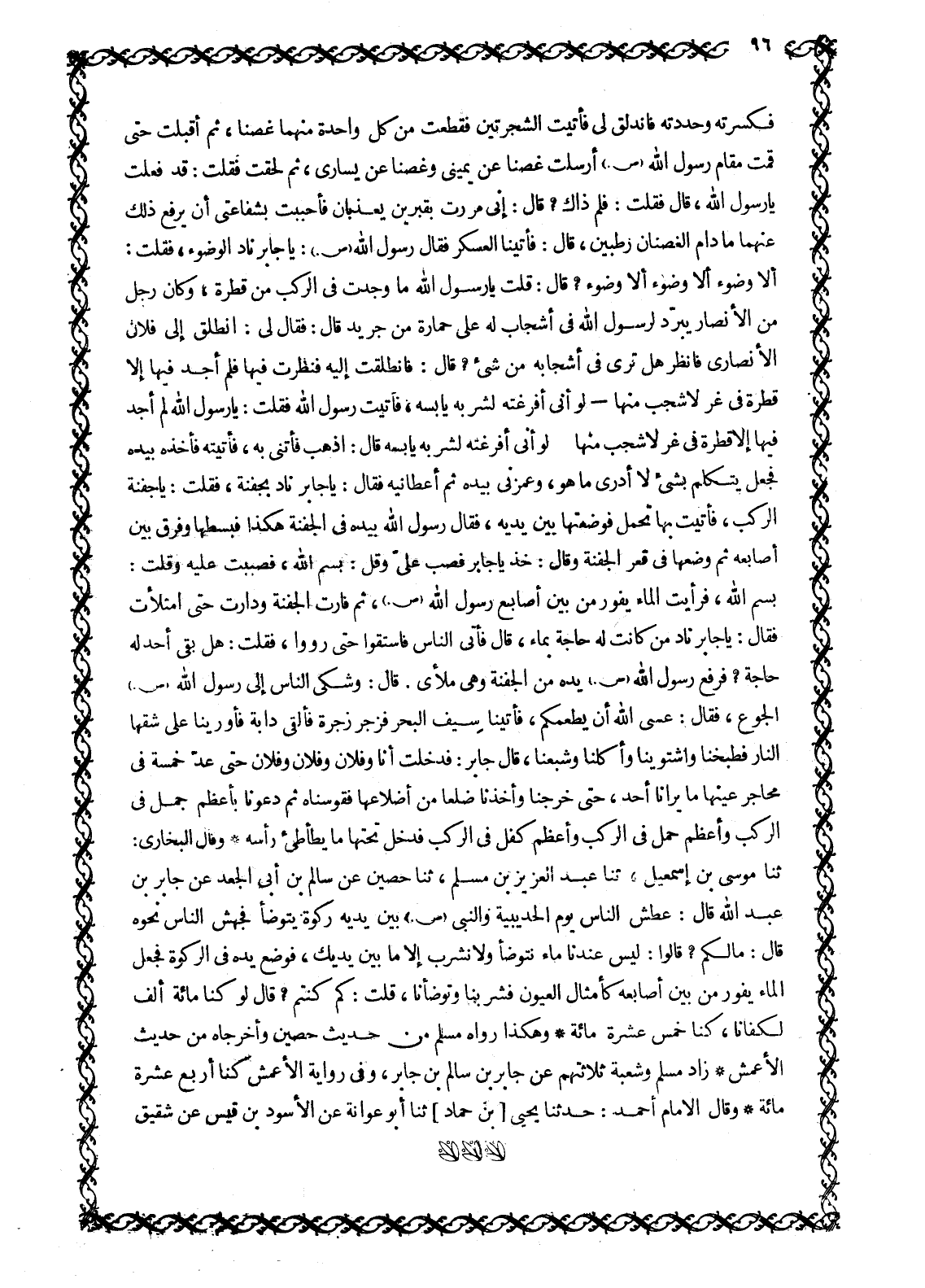 ثَنَا مُوسَى بْنُ إِسْمَاعِيلَ، ثَنَا عَبْدُ الْعَزِيزِ بْنُ مُسْلِمٍ، ثَنَا حُصَيْنٍ عَنْ سَالِمِ بْنِ أَبِي الْجَعْدِ عَنْ جَابِرِ بْنِ عَبْدِ اللَّهِ قَالَ: عَطِشَ النَّاسُ يَوْمَ الْحُدَيْبِيَةِ وَالنَّبِيُّ صَلَّى اللَّهُ عَلَيْهِ وَسَلَّمَ بَيْنَ يَدَيْهِ رَكْوَةٌ يَتَوَضَّأُ فَجَهَشَ النَّاسُ نَحْوَهُ قَالَ: مَا لَكُمْ؟ قَالُوا: لَيْسَ عِنْدَنَا مَاءٌ نَتَوَضَّأُ وَلَا نَشْرَبُ إِلَّا مَا بَيْنَ يَدَيْكَ، فَوَضَعَ يَدَهُ فِي الرَّكْوَةِ فَجَعَلَ الْمَاءُ يَفُورُ مِنْ بَيْنَ أَصَابِعِهِ كَأَمْثَالِ الْعُيُونِ فَشَرِبْنَا وَتَوَضَّأْنَا، قُلْتُ: كَمْ كُنْتُمْ؟ قَالَ لَوْ كُنَّا مِائَةَ أَلْفٍ لَكَفَانَا، كُنَّا خَمْسَ عَشْرَةَ مِائَةً وَهَكَذَا رَوَاهُ مُسْلِمٌ مِنْ حَدِيثِ حَصِينٍ وَأَخْرَجَاهُ مِنْ حَدِيثِ الأعمش زاد مسلم وشعبة ثلاثتهم عن جابر بن سالم بن جَابِرٍ، وَفِي رِوَايَةِ الْأَعْمَشِ كُنَّا أَرْبَعَ عَشْرَةَ مِائَةً وَقَالَ الْإِمَامُ أَحْمَدُ: حَدَّثَنَا يَحْيَى [بْنُ حَمَّادٍ] ثَنَا أَبُو عَوَانَةَ عَنِ الْأَسْوَدِ بْنِ قيس عن شقيق