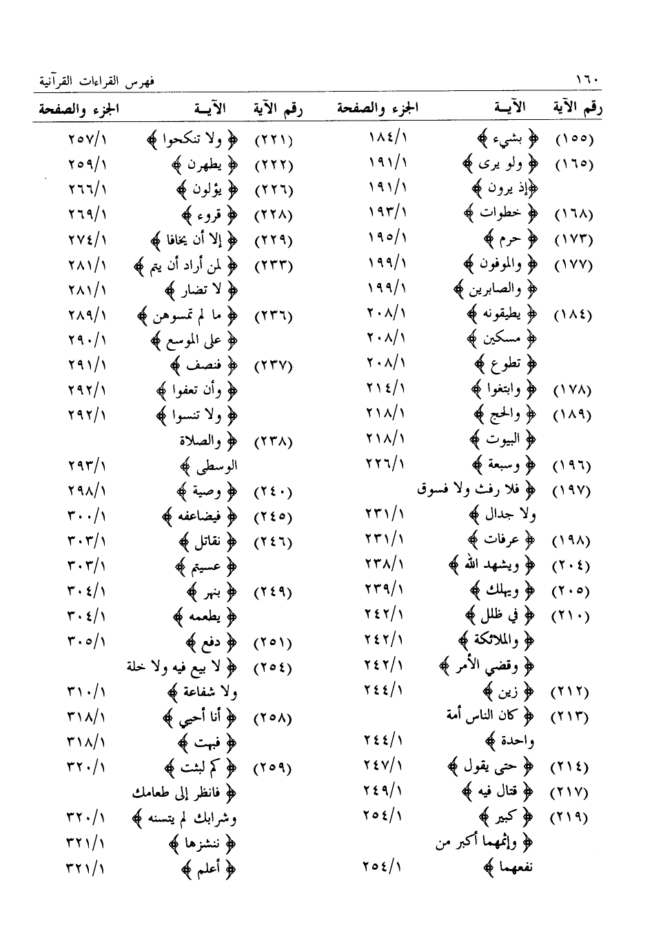 (155) : بشيء: 1/ 184 (165) : ولو يرى: 1/ 191: إذ يرون: 1/ 191 (168) : خطوات: 1/ 193 (173) : حرم: 1/ 195 (177) : والموفون: 1/ 199: والصابرين: 1/ 199 (184) : يطيقونه: 1/ 208: مسكين: 1/ 208: تطوع: 1/ 208 (178) : وابتغوا: 1/ 214 (189) : والحج: 1/ 218: البيوت: 1/ 218 (196) : وسبعة: 1/ 226 (197) : فلا رفث ولا فسوق ولا جدال: 1/ 231 (198) : عرفات: 1/ 231 (204) : ويشهد الله: 1/ 238 (205) : ويهلك: 1/ 239 (210) : في ظلل: 1/ 242: والملائكة: 1/ 242: وقضي الأمر: 1/ 242 (212) : زين: 1/ 244 (213) : كان الناس أمة واحدة: 1/ 244 (214) : حتى يقول: 1/ 247 (217) : قتال فيه: 1/ 249 (219) : كبير: 1/ 254: وإثمهما أكبر من نفعهما: 1/ 2254 (221) : ولا تنكحوا: 1/ 257 (222) : يطهرن: 1/ 259 (226) : يؤلون: 1/ 266 (228) : قروء: 1/ 269 (229) : إلا أن يخافا: 1/ 274 (233) : لمن أراد أن يتم: 1/ 281: لا تضار: 1/ 281 (236) : ما لم تمسوهن: 1/ 289: على الموسع: 1/ 290 (237) : فنصف: 1/ 291: وأن تعفوا: 1/ 292: ولا تنسوا: 1/ 292 (238) : والصلاة الوسطى: 1/ 293 (240) : وصية: 1/ 298 (245) : فيضاعفه: 1/ 300 (246) : نقاتل: 1/ 303: عسيتم: 1/ 303 (249) : بنهر: 1/ 304: يطعمه: 1/ 304 (251) : دفع: 1/ 305 (254) : لَا بَيْعٌ فِيهِ وَلَا خُلَّةٌ وَلَا شَفَاعَةٌ: 1/ 310 (258) : أنا أحيي: 1/ 318: فبهت: 1/ 318 (259) : كم لبثت: 1/ 320: فانظر إلى طعامك وشرابك لم يتسنه: 1/ 320: ننشزها: 1/ 321: أعلم: 1/ 321