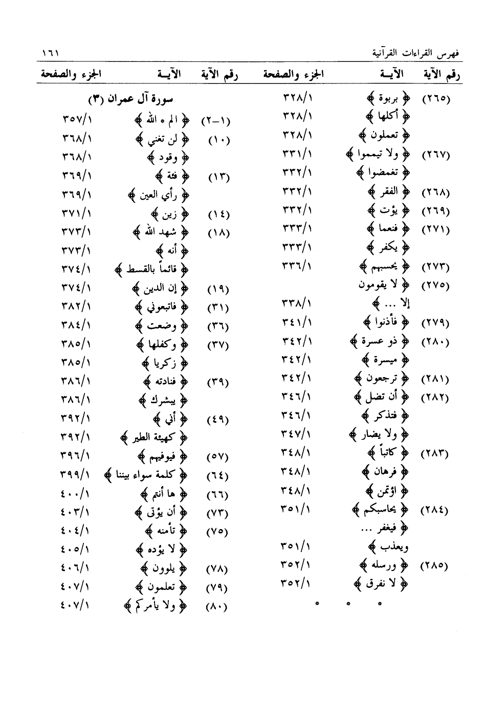 (1- 2) : الم. الله: 1/ 357 (10) : لن تغني: 1/ 368: وقود: 1/ 368 (13) : فئة: 1/ 369: رأي العين: 1/ 369 (14) : زين: 1/ 371 (18) : شهد الله: 1/ 373: أنه: 1/ 373: قائما بالقسط: 1/ 374 (19) : إن الدين: 1/ 374 (31) : فاتبعوني: 1/ 382 (36) : وضعت: 1/ 384 (37) : وكفلها: 1/ 385: زكريا: 1/ 385 (39) : فنادته: 1/ 386: يبشرك: 1/ 386 (49) : أني: 1/ 392: كهيئة الطير: 1/ 392 (57) : فيوفيهم: 1/ 396 (64) : كلمة سواء بيننا: 1/ 399 (66) : ها أنتم: 1/ 400 (73) : أن يؤتى: 1/ 403 (75) : تأمنه: 1/ 404: لا يؤده: 1/ 405 (78) : يلوون: 1/ 406 (79) : تعلمون: 1/ 407 (80) : ولا يأمركم: 1/ 407