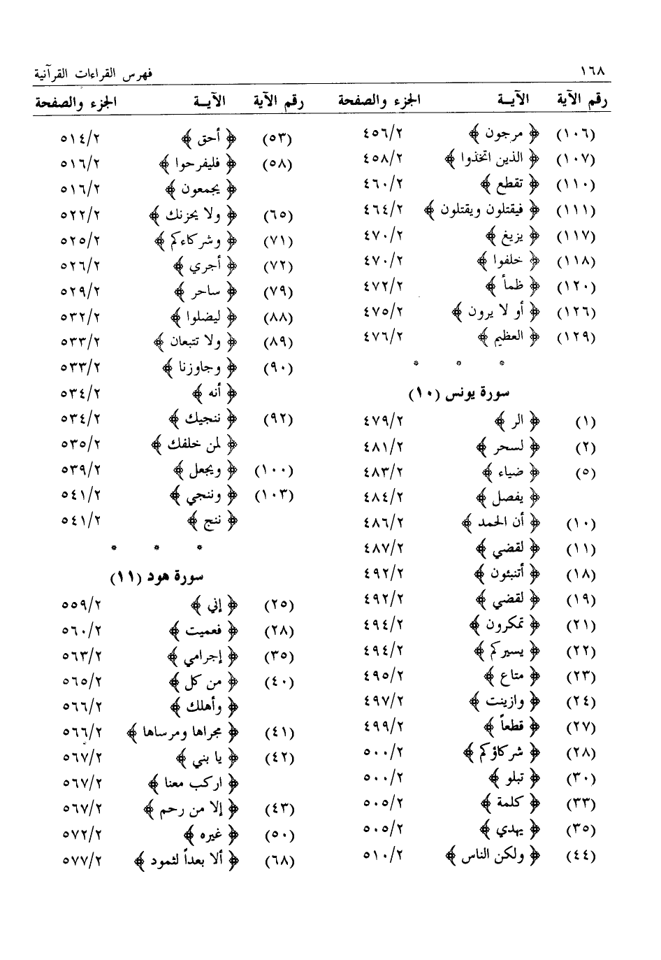 (1) : الر: 2/ 479 (2) : لسحر: 2/ 481 (5) : ضياء: 2/ 483: يفصل: 2/ 484 (10) : أن الحمد: 2/ 486 (11) : لقضي: 2/ 487 (18) : أتنبئون: 2/ 492 (19) : لقضي: 2/ 492 (21) : تمكرون: 2/ 494 (22) : يسيركم: 2/ 494 (23) : متاع: 2/ 495 (24) : وازينت: 2/ 497 (27) : قطعا: 2/ 499 (28) : شركاؤكم: 2/ 500 (30) : تبلو: 2/ 500 (33) : كلمة: 2/ 505 (35) : يهدي: 2/ 505 (44) : ولكن الناس: 2/ 510 (53) : أحق: 2/ 514 (58) : فليفرحوا: 2/ 516: يجمعون: 2/ 516 (65) : ولا يحزنك: 2/ 522 (71) : وشركاءكم: 2/ 525 (72) : أجري: 2/ 526 (79) : ساحر: 2/ 529 (88) : ليضلوا: 2/ 532 (89) : ولا تتبعان: 2/ 533 (90) : وجاوزنا: 2/ 533: أنه: 2/ 534 (92) : ننجيك: 2/ 534: لمن خلفك: 2/ 535 (100) : ويجعل: 2/ 539 (103) : وننجي: 2/ 541: ننج: 2/ 541