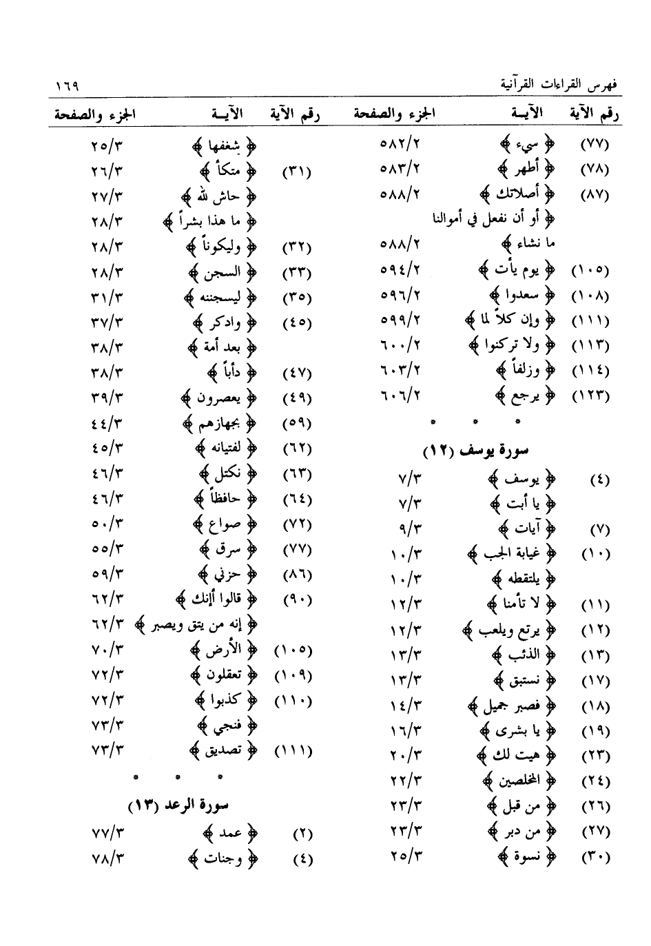 (4) : يوسف: 3/ 7: يا أبت: 3/ 7 (7) : آيات: 3/ 9 (10) : غيابة الجب: 3/ 10: يلتقطه: 3/ 10 (11) : لا تأمنا: 3/ 12 (12) : يرتع ويلعب: 3/ 12 (13) : الذئب: 3/ 13 (17) : نستبق: 3/ 13 (18) : فصبر جميل: 3/ 14 (19) : يا بشرى: 3/ 16 (23) : هيت لك: 3/ 20 (24) : المخلصين: 3/ 22 (26) : من قبل: 3/ 23 (27) : من دبر: 3/ 23 (30) : نسوة: 3/ 25: شغفها: 3/ 25 (31) : متكأ: 3/ 26: حاش لله: 3/ 27: ما هذا بشرا: 3/ 28 (32) : وليكونا: 3/ 28 (33) : السجن: 3/ 28 (35) : ليسجننه: 3/ 31 (45) : وادكر: 3/ 37: بعد أمة: 3/ 38 (47) : دأبا: 3/ 38 (49) : يعصرون: 3/ 39 (59) : بجهازهم: 3/ 44 (62) : لفتيانه: 3/ 45 (63) : نكتل: 3/ 46 (64) : حافظا: 3/ 46 (72) : صواع: 3/ 50 (77) : سرق: 3/ 55 (86) : حزني: 3/ 59 (90) : قالوا أإنك: 3/ 62: إنه من يتق ويصبر: 3/ 62 (105) : الأرض: 3/ 70 (109) : تعقلون: 3/ 72 (110) : كذبوا: 3/ 72: فنجي: 3/ 73 (111) : تصديق: 3/ 73