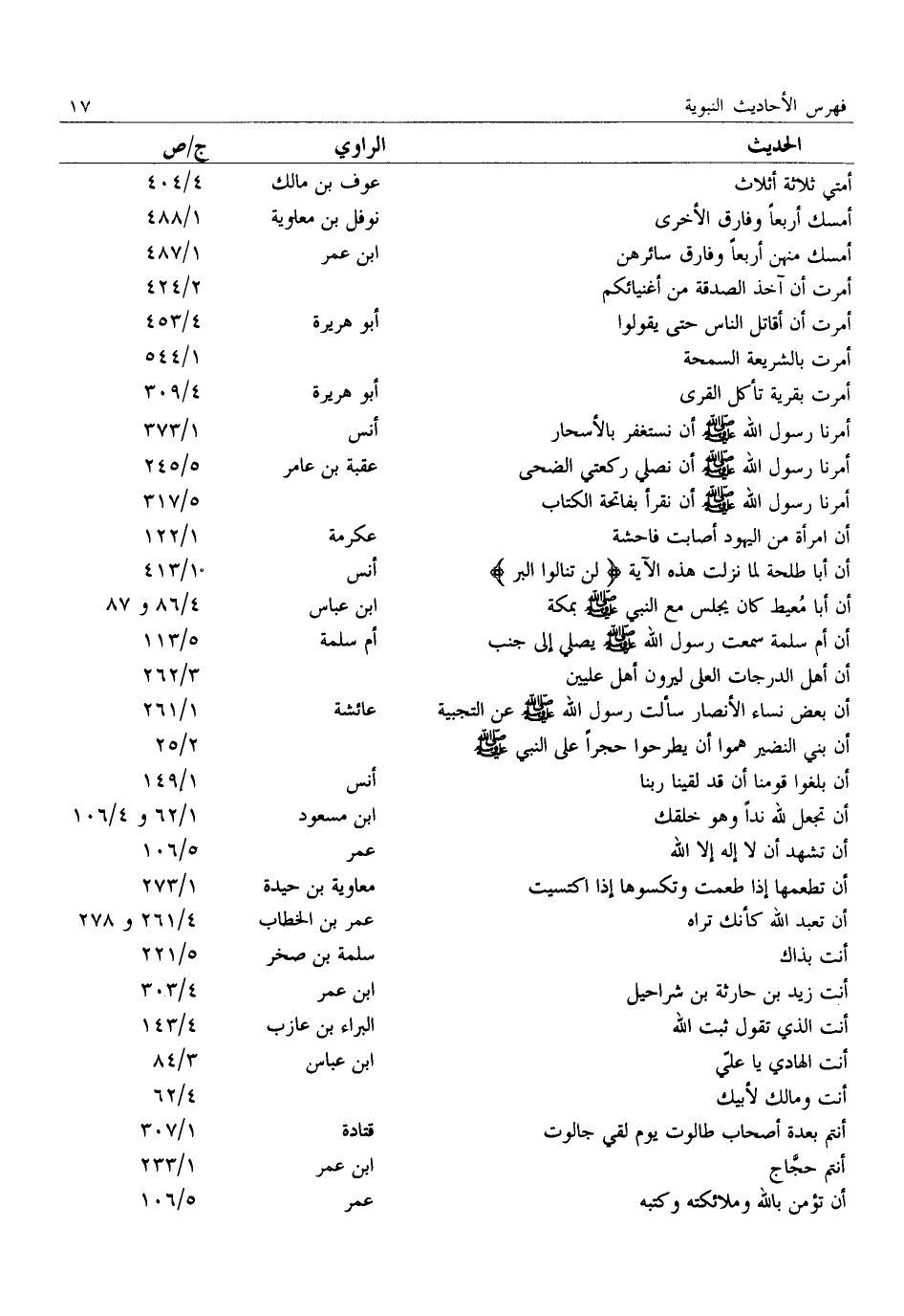 أمتي ثلاثة أثلاث: عوف بن مالك: 4/ 404 أمسك أربعا وفارق الأخرى: نوفل بن معاوية: 1/ 488 أمسك منهن أربعا وفارق سائرهن: ابن عمر: 1/ 487 أمرت أن آخذ الصدقة من أغنيائكم:: 2/ 424 أمرت أن أقاتل الناس حتى يقولوا: أبو هريرة: 4/ 453 أمرت بالشريعة السمحة:: 1/ 544 أمرت بقرية تأكل القرى: أبو هريرة: 4/ 309 أَمَرَنَا رَسُولُ اللَّهِ صَلَّى اللَّهُ عَلَيْهِ وَسَلَّمَ إِنَّ نستغفر بالأسحار: أنس: 1/ 373 أَمَرَنَا رَسُولُ اللَّهِ صَلَّى اللَّهُ عَلَيْهِ وَسَلَّمَ إِنَّ نصلي ركعتي الضحى: عقبة بن عامر: 5/ 245 أَمَرَنَا رَسُولُ اللَّهِ صَلَّى اللَّهُ عَلَيْهِ وَسَلَّمَ إِنَّ نقرأ بفاتحة الكتاب:: 5/ 317 أن امرأة من اليهود أصابت فاحشة: عكرمة: 1/ 122 أَنَّ أَبَا طَلْحَةَ لَمَّا نَزَلَتْ هَذِهِ الْآيَةُ لن تنالوا البر: أنس: 1/ 413 أَنَّ أَبَا مُعَيْطٍ كَانَ يَجْلِسُ مَعَ النَّبِيِّ صلّى الله عليه وسلم بمكة: ابن عباس: 4/ 86 و 87 أن أم سلمة سَمِعَتْ رَسُولَ اللَّهِ صَلَّى اللَّهُ عَلَيْهِ وَسَلَّمَ يصلي إلى جنب: أم سلمة: 5/ 113 أَنَّ أَهْلَ الدَّرَجَاتِ الْعُلَى لَيَرَوْنَ أَهْلَ عِلِّيِّينَ:: 3/ 262 أن بعض نساء الأنصار سَأَلْتُ رَسُولَ اللَّهِ صَلَّى اللَّهُ عَلَيْهِ وَسَلَّمَ عَنْ التجبية: عائشة: 1/ 261 أَنَّ بَنِي النَّضِيرِ هَمُّوا أَنْ يَطْرَحُوا حَجَرًا على النبي صلّى الله عليه وسلم:: 2/ 25 أَنْ بَلِّغُوا قَوْمَنَا أَنَّ قَدْ لَقِينَا رَبَّنَا: أنس: 1/ 149 أن تجعل لله ندا وهو خلقك: ابن مسعود: 1/ 62 و 4/ 106 أَنْ تَشْهَدَ أَنْ لَا إِلَهَ إِلَّا اللَّهُ: عمر: 5/ 106 أَنْ تُطْعِمَهَا إِذَا طَعِمْتَ وَتَكْسُوَهَا إِذَا اكْتَسَيْتَ: معاوية بن حيدة: 1/ 273 أن تعبد الله كأنك تراه: عمر بن الخطاب: 4/ 261 و 278 أنت بذاك: سلمة بن صخر: 5/ 221 أنت زيد بن حارثة بن شراحيل: ابن عمر: 4/ 303 أنت الذي تقول ثبت الله: البراء بن عازب: 4/ 143 أنت الهادي يا عليّ: ابن عباس: 3/ 84 أنت ومالك لأبيك:: 4/ 62 أَنْتُمْ بِعِدَّةِ أَصْحَابِ طَالُوتَ يَوْمَ لَقِيَ جَالُوتَ: قتادة: 1/ 307 أنتم حجّاج: ابن عمر: 1/ 233 أن تؤمن بالله وملائكته وكتبه: عمر: 5/ 106