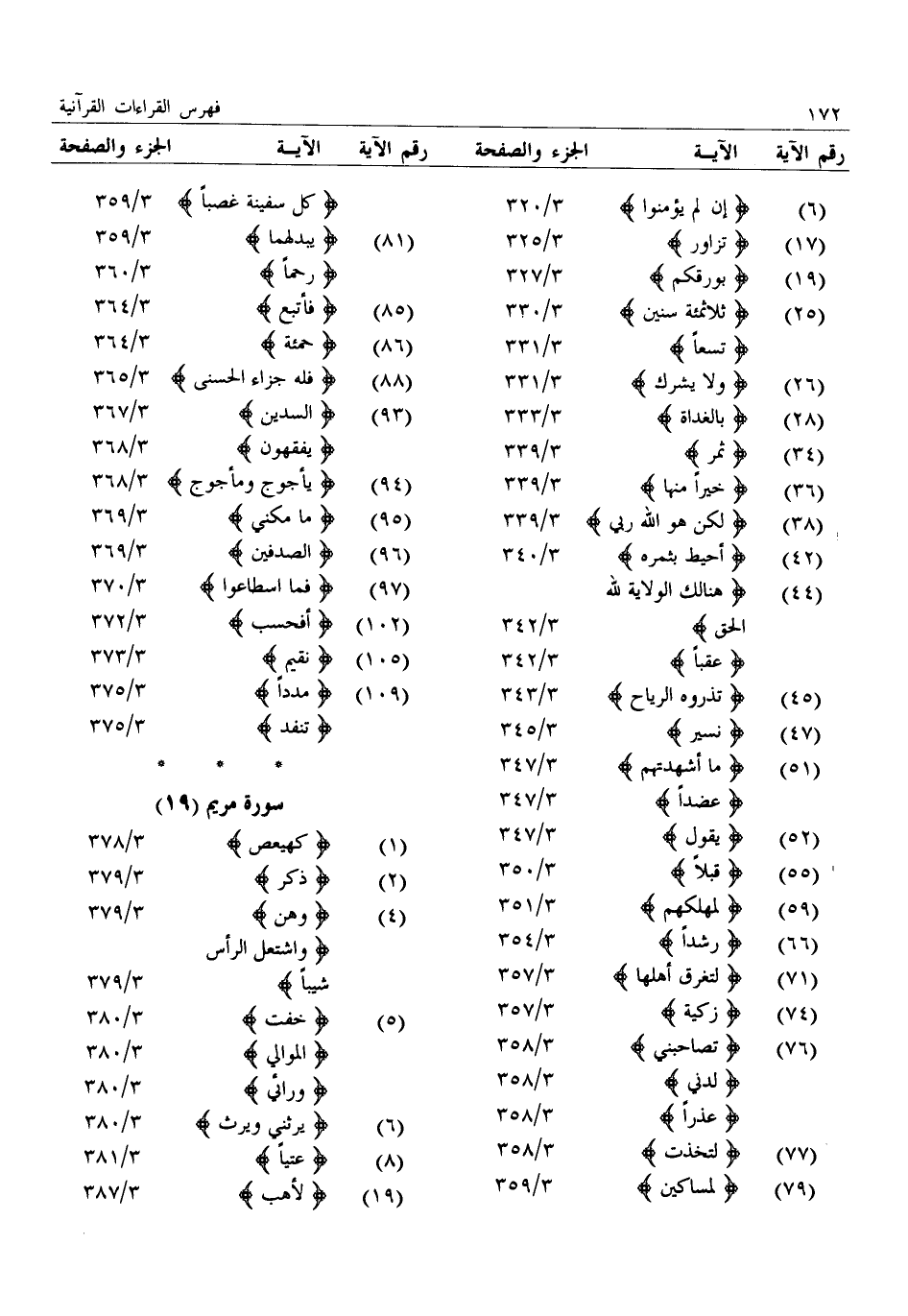 (1) : كهيعص: 3/ 378 (2) : ذكر: 3/ 379 (4) : وهن: 3/ 379: واشتعل الرأس شيبا: 3/ 379 (5) : خفت: 3/ 380: الموالي: 3/ 380: ورائي: 3/ 380 (6) : يرثني ويرث: 3/ 380 (8) : عتيا: 3/ 381 (19) : لأهب: 3/ 387