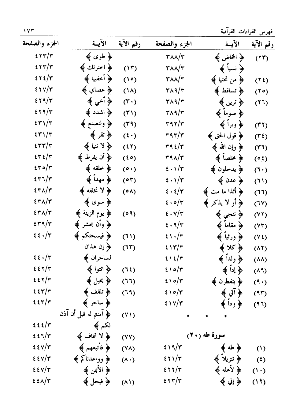 (1) : طه: 3/ 419 (4) : تنزيلا: 3/ 421 (10) : لأهله: 3/ 422 (12) : إني: 3/ 423: طوى: 3/ 423 (13) : اخترتك: 3/ 423 (15) : أخفيها: 3/ 424 (18) : عصاي: 3/ 427 (30) : أخي: 3/ 429 (31) : اشدد: 3/ 429 (39) : ولتصنع: 3/ 431 (40) : تقر: 3/ 431 (42) : لا تنيا: 3/ 433 (45) : أن يفرط: 3/ 434 (50) : خلقه: 3/ 435 (53) : مهدا: 3/ 436 (58) : لا نخلفه: 3/ 438: سوى: 3/ 438 (59) : يوم الزينة: 3/ 438: وأن يحشر: 3/ 439 (61) : فيسحتكم: 3/ 440 (63) : إن هذان لساحران: 3/ 440 (64) : ائتوا: 3/ 442 (66) : يخيل: 3/ 442 (69) : تلقف: 3/ 443: ساحر: 3/ 443 (71) : آمنتم له قبل أن آذن لكم: 3/ 444 (77) : لا تخاف: 3/ 446 (78) : فأتبعهم: 3/ 447 (80) : وواعدناكم: 3/ 447: الأيمن: 3/ 447 (81) : فيحل: 3/ 448