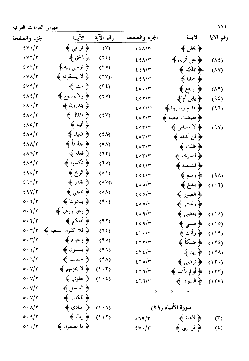 (3) : لاهية: 3/ 469 (4) : قل ربي: 3/ 470 (7) : نوحي: 3/ 471 (24) : الحق: 3/ 476 (25) : نوحي إليه: 3/ 476 (27) : لا يسبقونه: 3/ 478 (34) : مت: 3/ 479 (45) : ولا يسمع: 3/ 484: ينذرون: 3/ 484 (47) : مثقال: 3/ 485: أتينا: 3/ 485 (48) : ضياء: 3/ 485 (58) : جذاذا: 3/ 488 (63) : فعله: 3/ 489 (65) : نكسوا: 3/ 489 (81) : الريح: 3/ 495 (87) : نقدر: 3/ 496 (88) : ننجي: 3/ 497 (90) : يدعوننا: 3/ 502: رغبا ورهبا: 3/ 502 (92) : أمتكم: 3/ 502 (94) : فلا كفران لسعيه: 3/ 503 (95) : وحرام: 3/ 503 (96) : ينسلون: 3/ 504 (98) : حصب: 3/ 506 (103) : لا يحزنهم: 3/ 507 (104) : نطوي: 3/ 507: السجل: 3/ 507: للكتب: 3/ 507 (106) : عبادي: 3/ 508 (112) : ربّ: 3/ 509: ما تصفون: 3/ 510