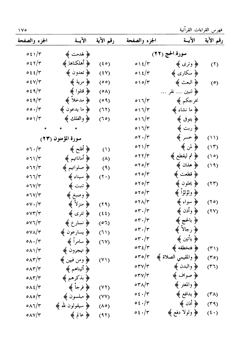 (2) : وترى: 3/ 514: سكارى: 3/ 514 (5) : البعث: 3/ 515: لنبين ... نقر ... نخرجكم: 3/ 516: ما نشاء: 3/ 516: يتوفى: 3/ 516: ربت: 3/ 516 (11) : خسر: 3/ 520 (13) : لمن: 3/ 521 (15) : ثم ليقطع: 3/ 522 (19) : هذان: 3/ 525: قطعت: 3/ 525 (23) : يحلون: 3/ 525: ولؤلؤا: 3/ 525 (25) : سواء: 3/ 528 (27) : وأذن: 3/ 530: بالحج: 3/ 530: رجالا: 3/ 530: يأتين: 3/ 530 (31) : فتخطفه: 3/ 534 (35) : والمقيمي الصلاة: 3/ 535 (36) : والبدن: 3/ 537: صواف: 3/ 537: والمعتر: 3/ 538 (38) : يدافع: 3/ 540 (39) : أذن: 3/ 540 (40) : ولولا دفع: 3/ 540: لهدمت: 3/ 541 (45) : أهلكناها: 3/ 542 (47) : تعدون: 3/ 544 (55) : مرية: 3/ 547 (58) : قتلوا: 3/ 549 (59) : مدخلا: 3/ 549 (62) : ما يدعون: 3/ 550 (65) : والفلك: 3/ 551