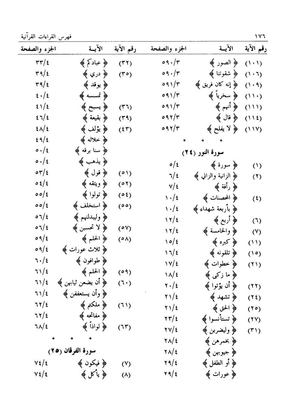 (1) : سورة: 4/ 5 (2) : الزانية والزاني: 4/ 6: رأفة: 4/ 7 (4) : المحصنات: 4/ 10: بأربعة شهداء: 4/ 10 (6) : أربع: 4/ 12 (7) : والخامسة: 4/ 12 (11) : كبره: 4/ 15 (15) : تلقونه: 4/ 16 (21) : خطوات: 4/ 17: ما زكى: 4/ 18 (22) : أن يؤتوا: 4/ 20 (24) : تشهد: 4/ 21 (25) : الحق: 4/ 21 (27) : تستأنسوا: 4/ 23 (31) : وليضربن: 4/ 27: بخمرهن: 4/ 28: جيوبهن: 4/ 28: أو الطفل: 4/ 29: عورات: 4/ 29 (32) : عبادكم: 4/ 33 (35) : دري: 4/ 39: يوقد: 4/ 39: تمسسه: 4/ 40 (36) : يسبح: 4/ 41 (39) : بقيعة: 4/ 46 (43) : يؤلف: 4/ 48: خلاله: 4/ 49: سنا برقه: 4/ 50: يذهب: 4/ 50 (51) : قول: 4/ 53 (52) : ويتقه: 4/ 54 (54) : تولوا: 4/ 55 (55) : استخلف: 4/ 55: وليبدلنهم: 4/ 56 (57) : لا تحسبن: 4/ 56 (58) : الحلم: 4/ 59: ثلاث عورات: 4/ 59: طوافون: 4/ 60 (59) : الحلم: 4/ 61 (60) : أن يضعن ثيابهن: 4/ 61: وأن يستعففن: 4/ 61 (61) : ملكتم: 4/ 62: مفاتحه: 4/ 62 (63) : لواذا: 4/ 68