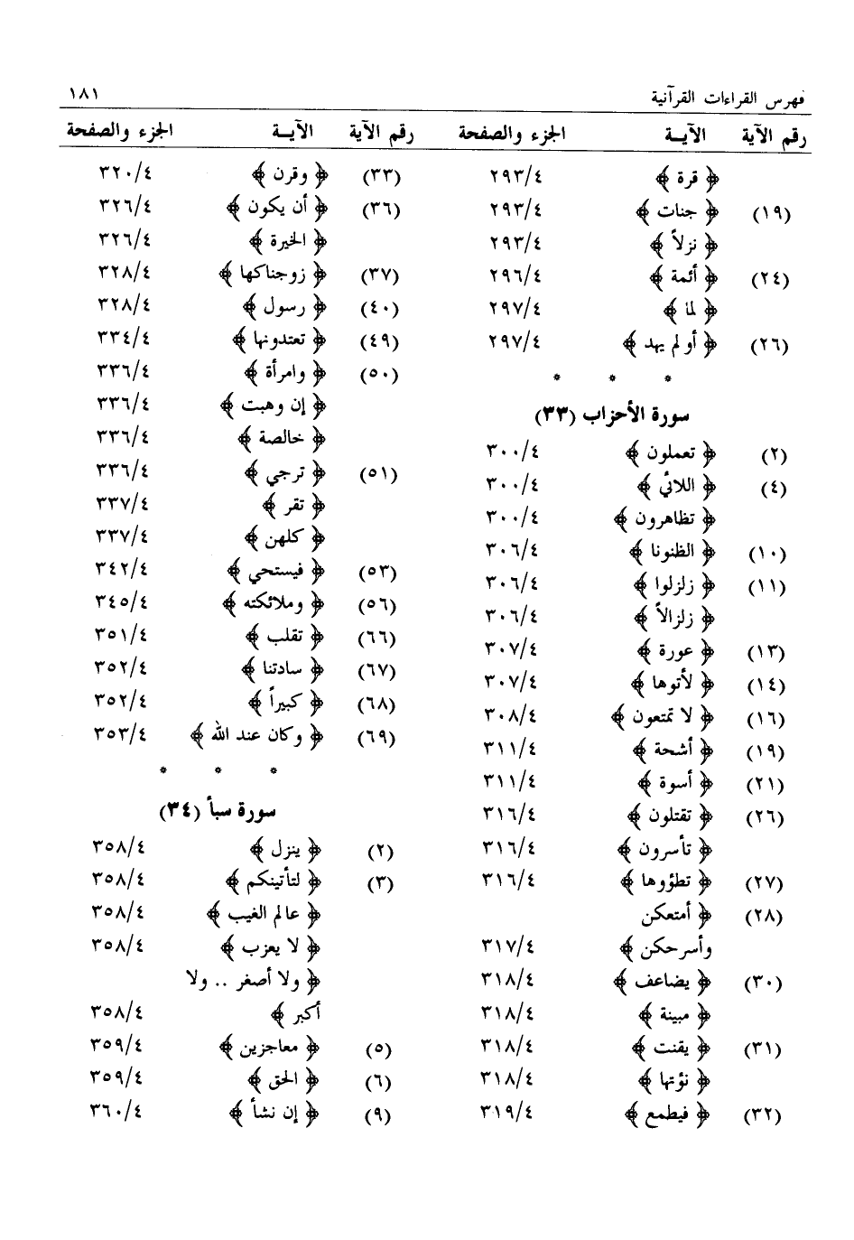 : قرة: 4/ 293 (19) : جنات: 4/ 293: نزلا: 4/ 293 (24) : أئمة: 4/ 296: لما: 4/ 297 (26) : أو لم يهد: 4/ 297
