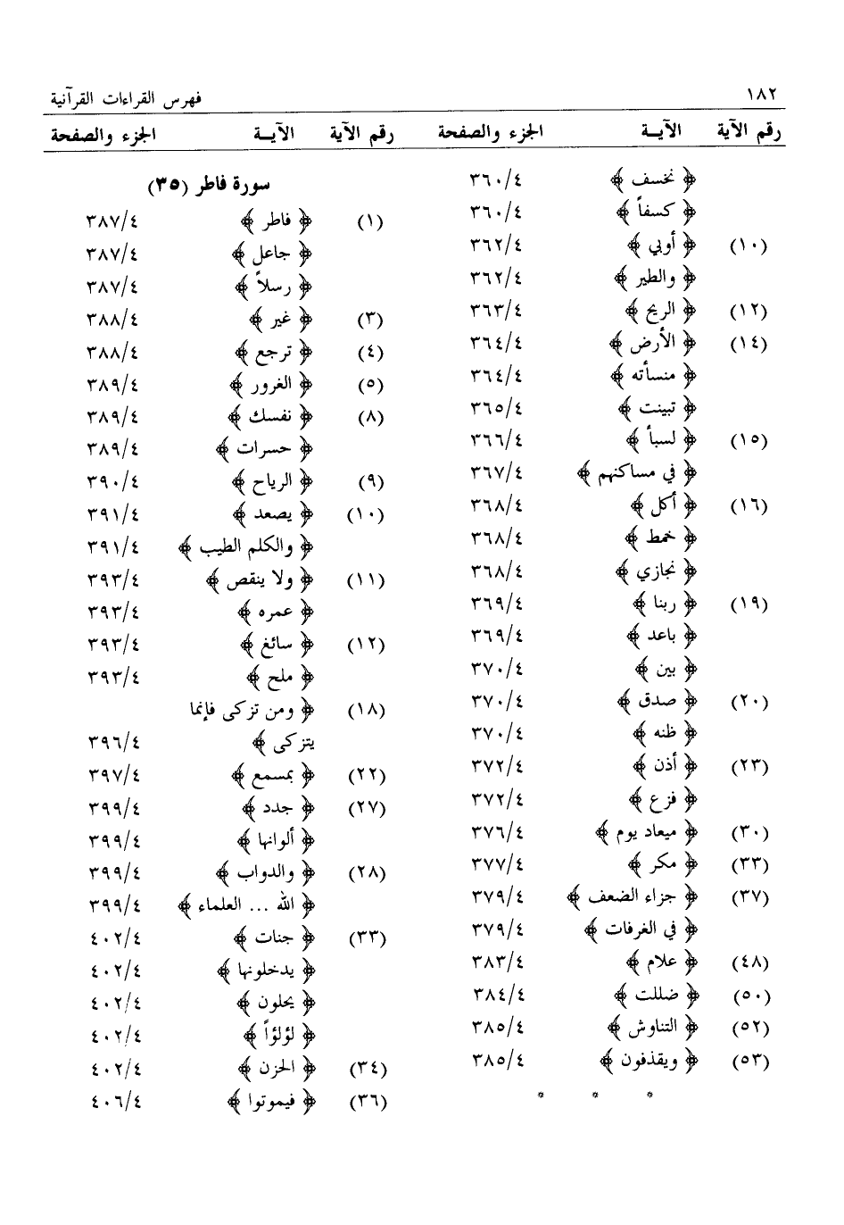 (1) : فاطر: 4/ 387: جاعل: 4/ 387: رسلا: 4/ 387 (3) : غير: 4/ 388 (4) : ترجع: 4/ 388 (5) : الغرور: 4/ 389 (8) : نفسك: 4/ 389: حسرات: 4/ 389 (9) : الرياح: 4/ 390 (10) : يصعد: 4/ 391: والكلم الطيب: 4/ 391 (11) : ولا ينقص: 4/ 393: عمره: 4/ 393 (12) : سائغ: 4/ 393: ملح: 4/ 393 (18) : ومن تزكى فإنما يتزكى: 4/ 396 (22) : بمسمع: 4/ 397 (27) : جدد: 4/ 399: ألوانها: 4/ 399 (28) : والدواب: 4/ 399: الله ... العلماء: 4/ 399 (33) : جنات: 4/ 402: يدخلونها: 4/ 402: يحلون: 4/ 402: لؤلؤا: 4/ 402 (34) : الحزن: 4/ 402 (36) : فيموتوا: 4/ 406