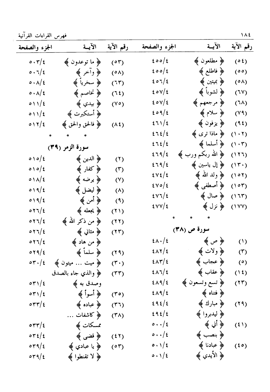 (54) : مطلعون: 4/ 455 (55) : فاطلع: 4/ 455 (58) : بميتين: 4/ 456 (67) : لشوبا: 4/ 457 (68) : مرجعهم: 4/ 457 (79) : سلام: 4/ 459 (94) : يزفون: 4/ 461 (102) : ماذا ترى: 4/ 464 (103) : أسلما: 4/ 464 (126) : الله ربكم ورب: 4/ 469 (130) : إل ياسين: 4/ 469 (152) : ولد الله: 4/ 474 (153) : أصطفى: 4/ 475 (163) : صال: 4/ 476 (177) : نزل: 4/ 477