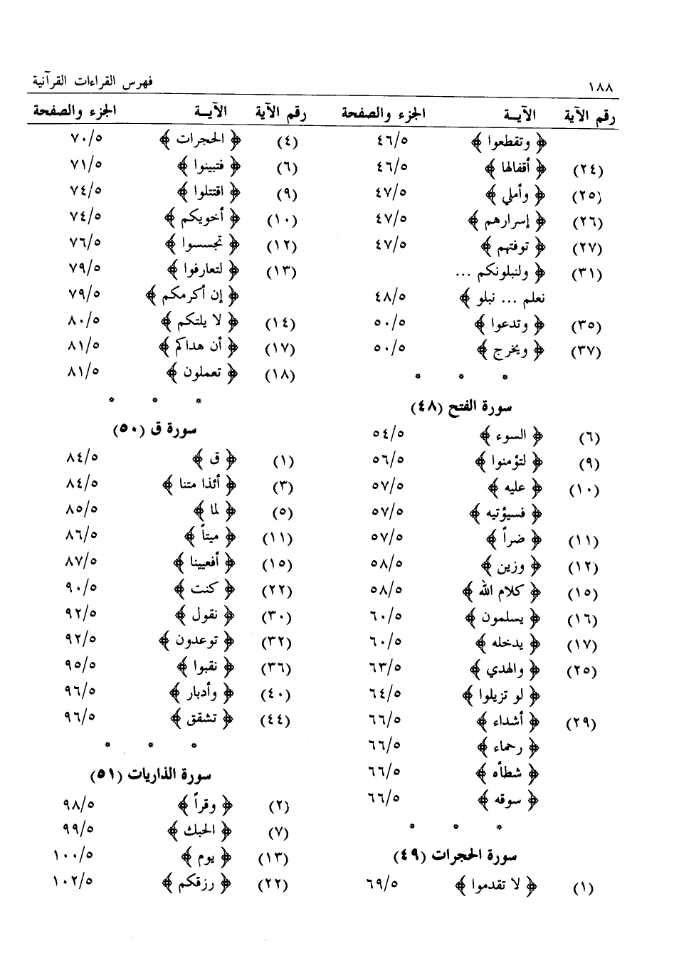 (2) : وقرا: 5/ 98 (7) : الحبك: 5/ 99 (13) : يوم: 5/ 100 (22) : رزقكم: 5/ 102
