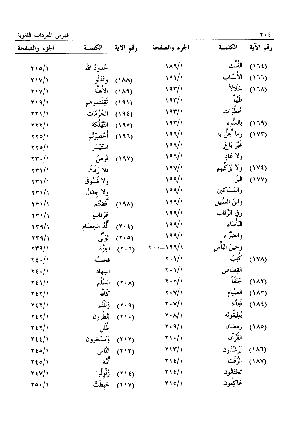 (164) : الفلك: 1/ 189 (166) : الأسباب: 1/ 191 (168) : حلالا: 1/ 193: طيّبا: 1/ 193: خطوات: 1/ 193 (169) : بالسّوء: 1/ 193 (173) : وما أهلّ به: 1/ 196: غير باغ: 1/ 196: ولا عاد: 1/ 196 (174) : ولا يزكّيهم: 1/ 197 (177) : البرّ: 1/ 199: والمساكين: 1/ 199: وابن السّبيل: 1/ 199: وفي الرّقاب: 1/ 199: البأساء: 1/ 199: والضّرّاء: 1/ 199: وحين البأس: 1/ 199- 200 (178) : كتب: 1/ 201: القصاص: 1/ 201 (182) : جنفا: 1/ 205 (183) : الصّيام: 1/ 207 (184) : فعدّة: 1/ 207: يطيقونه: 1/ 208 (185) : رمضان: 1/ 209: القرآن: 1/ 210 (186) : يرشدون: 1/ 213 (187) : الرّفث: 1/ 214: تختانون: 1/ 214: عاكفون: 1/ 215: حدود الله: 1/ 215 (188) : وتدلوا: 1/ 217 (189) : الأهلّة: 1/ 217 (191) : ثقفتموهم: 1/ 219 (194) : الحرمات: 1/ 221 (195) : التّهلكة: 1/ 222 (196) : أحصرتم: 1/ 225: استيسر: 1/ 225 (197) : فرض: 1/ 230: فلا رفث: 1/ 231: ولا فسوق: 1/ 231: ولا جدال: 1/ 231 (198) : أفضتم: 1/ 231: عرفات: 1/ 231 (204) : ألّد الخصام: 1/ 239 (205) : تولّى: 1/ 239 (206) : العزّة: 1/ 239: فحسبه: 1/ 240: المهاد: 1/ 240 (208) : السّلم: 1/ 241: كافّة: 1/ 242 (209) : زللتم: 1/ 242 (210) : ينظرون: 1/ 242: ظلل: 1/ 242 (212) : ويسخرون: 1/ 244 (213) : النّاس: 1/ 245: أمّة: 1/ 245 (214) : زلزلوا: 1/ 247 (217) : حبطت: 1/ 250