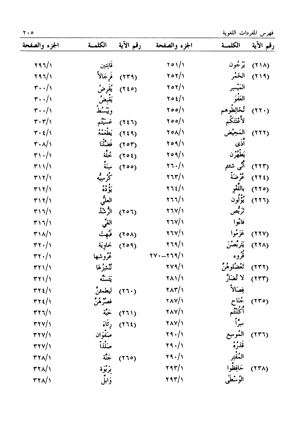 (218) : يرجون: 1/ 251 (219) : الخمر: 1/ 252: الميسر: 1/ 252: العفو: 1/ 254 (220) : تخالطوهم: 1/ 255: لأعنتكم: 1/ 255 (222) : المحيض: 1/ 258: أذى: 1/ 259: يطهرن: 1/ 259 (223) : أنّى شئتم: 1/ 260 (224) : عرضة: 1/ 263 (225) : باللّغو: 1/ 264 (226) : يؤلون: 1/ 266: تربّص: 1/ 267: فاءوا: 1/ 267 (227) : عزموا: 1/ 267 (228) : يتربّصن: 1/ 269: قروء: 1/ 269- 270 (232) : تعضلوهنّ: 1/ 279 (233) : لا تضارّ: 1/ 281: فصالا: 1/ 283 (235) : جناح: 1/ 287: أكننتم: 1/ 287: سرّا: 1/ 287 (236) : الموسع: 1/ 290: قدره: 1/ 290: المقتر: 1/ 290 (238) : حافظوا: 1/ 293: الوسطى: 1/ 293: قانتين: 1/ 296 (239) : فرجالا: 1/ 296 (245) : يقرض: 1/ 300: يقبض: 1/ 300: ويبسط: 1/ 300 (246) : عسيتم: 1/ 303 (249) : يطعمه: 1/ 304 (253) : فضّلنا: 1/ 308 (254) : خلّة: 1/ 310 (255) : سنة: 1/ 311: كرسيّه: 1/ 312: يؤده: 1/ 312: العليّ: 1/ 312 (256) : الرّشد: 1/ 316: الغيّ: 1/ 316 (258) : فبهت: 1/ 318 (259) : خاوية: 1/ 320: عروشها: 1/ 320: ننشزها: 1/ 321: يتسنّه: 1/ 321 (260) : ليطمئنّ: 1/ 324: فصرهنّ: 1/ 324 (261) : حبّة: 1/ 326 (264) : رئاء: 1/ 327: صفوان: 1/ 327: صلدا: 1/ 327 (265) : جنّة: 1/ 328: بربوة: 1/ 328: وابل: 1/ 328