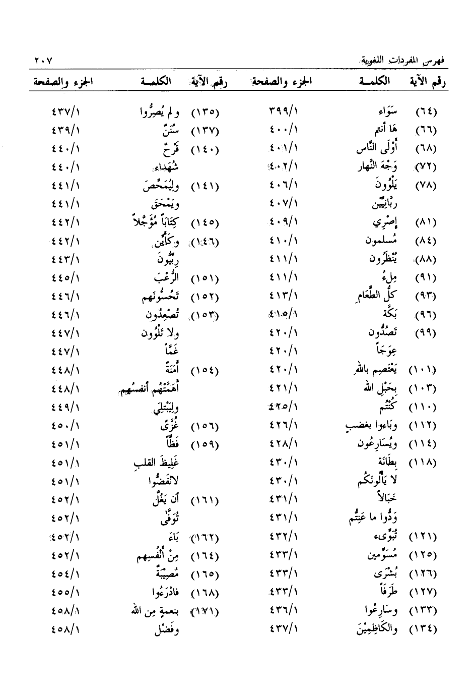 (64) : سواء: 1/ 399 (66) : ها أنتم: 1/ 400 (68) : أولى النّاس: 1/ 401 (72) : وجه النّهار: 1/ 402 (78) : يلوون: 1/ 406: ربّانيّين: 1/ 407 (81) : إصري: 1/ 409 (84) : مسلمون: 1/ 410 (88) : ينظرون: 1/ 411 (91) : ملء: 1/ 411 (93) : كلّ الطّعام: 1/ 413 (96) : بكّة: 1/ 415 (99) : تصدّون: 1/ 420: عوجا: 1/ 420 (101) : يعتصم بالله: 1/ 420 (103) : بحبل الله: 1/ 421 (110) : كنتم: 1/ 425 (112) : وباءوا بغضب: 1/ 426 (114) : ويسارعون: 1/ 428 (118) : بطانة: 1/ 430: لا يألونكم: 1/ 430: خبالا: 1/ 431: ودّوا ما عنتّم: 1/ 431 (121) : تبوّئ: 1/ 432 (125) : مسوّمين: 1/ 433 (126) : بشرى: 1/ 433 (127) : طرفا: 1/ 433 (133) : وسارعوا: 1/ 436 (134) : والكاظمين: 1/ 437 (135) : ولم يصرّوا: 1/ 437 (137) : سنن: 1/ 439 (140) : قرح: 1/ 440: شهداء: 1/ 440 (141) : وليمحّص: 1/ 441: ويمحق: 1/ 441 (145) : كتابا مؤجّلا: 1/ 442 (146) : وكأيّن: 1/ 442: ربّيّون: 1/ 443 (151) : الرّعب: 1/ 445 (152) : تحسّونهم: 1/ 446 (153) : تصعدون: 1/ 446: ولا تلوون: 1/ 447: غمّا: 1/ 447 (154) : أمنة: 1/ 448: أهمّتهم أنفسهم: 1/ 448: وليبتلي: 1/ 449 (156) : غزّى: 1/ 450 (159) : فظّا: 1/ 451: غليظ القلب: 1/ 451: لا نفضّوا: 1/ 451 (161) : أن يغلّ: 1/ 452: توفّى: 1/ 452 (162) : باء: 1/ 452 (164) : من أنفسهم: 1/ 452 (165) : مصيبة: 1/ 454 (168) : فادرءوا: 1/ 455 (171) : بنعمة من الله: 1/ 458: وفضل: 1/ 458