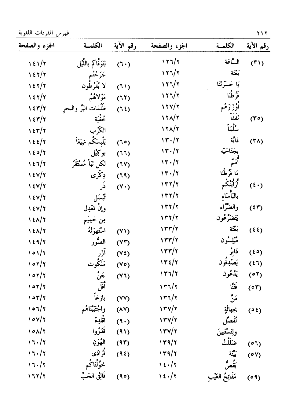 (31) : السّاعة: 2/ 126: بغتة: 2/ 126: يا حسرتنا: 2/ 126: فرّطنا: 2/ 126: أوزارهم: 2/ 127 (35) : نفقا: 2/ 128: سلّما: 2/ 128 (38) : دابّة: 2/ 130: بجناحيه: 2/ 130: أمم: 2/ 130: ما فرّطنا: 2/ 130 (40) : أرأيتكم: 2/ 132: بالبأساء: 2/ 132 (43) : والضّرّاء: 2/ 132: يتضرّعون: 2/ 132 (44) : بغتة: 2/ 133: مبلسون: 2/ 133 (45) : دابر: 2/ 133 (46) : يصدفون: 2/ 134 (52) : يدعون: 2/ 136 (53) : فتنّا: 2/ 136: منّ: 2/ 136 (54) : بجهالة: 2/ 137: نفصّل: 2/ 137: ولتستبين: 2/ 137 (56) : ضللت: 2/ 139 (57) : بيّنة: 2/ 139: يقصّ: 2/ 140 (59) : مفاتح الغيب: 2/ 140 (60) : يتوفّاكم باللّيل: 2/ 141: جرحتم: 2/ 142 (61) : لا يفرّطون: 2/ 142 (62) : مولاهم: 2/ 142 (64) : ظلمات البرّ والبحر: 2/ 143: خفية: 2/ 143: الكرب: 2/ 143 (65) : يلبسكم شيعا: 2/ 144 (66) : بوكيل: 2/ 145 (67) : لكل نبأ مستقرّ: 2/ 146 (69) : ذكرى: 2/ 147 (70) : ذر: 2/ 147: تبسل: 2/ 147: وإن تعدل: 2/ 147: من حميم: 2/ 148 (71) : استهوته: 2/ 148 (73) : الصّور: 2/ 149 (74) : آزر: 2/ 151 (75) : ملكوت: 2/ 152 (76) : جنّ: 2/ 152: أفل: 2/ 152 (77) : بازغا: 2/ 153 (87) : واجتبيناهم: 2/ 156 (90) : اقتده: 2/ 157 (91) : قدروا: 2/ 158 (93) : الهون: 2/ 160 (94) : فرادى: 2/ 160: خوّلناكم: 2/ 160 (95) : فالق الحبّ: 2/ 162