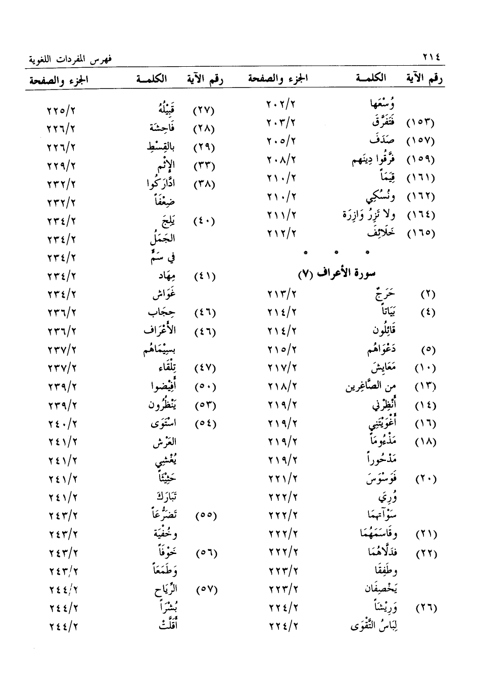 (2) : حرج: 2/ 213 (4) : بياتا: 2/ 214: قائلون: 2/ 214 (5) : دعواهم: 2/ 215 (10) : معايش: 2/ 217 (13) : من الصّاغرين: 2/ 218 (14) : أنظرني: 2/ 219 (16) : أغويتني: 2/ 219 (18) : مذءوما: 2/ 219: مدحورا: 2/ 219 (20) : فوسوس: 2/ 221: وري: 2/ 222: سوآتهما: 2/ 222 (21) : وقاسمهما: 2/ 222 (22) : فدلّاهما: 2/ 222: وطفقا: 2/ 223: يخصفان: 2/ 223 (26) : وريشا: 2/ 224: لباس التّقوى: 2/ 224 (27) : قبيله: 2/ 225 (28) : فاحشة: 2/ 226 (29) : بالقسط: 2/ 226 (33) : الإثم: 2/ 229 (38) : ادّاركوا: 2/ 232: ضعفا: 2/ 232 (40) : يلج: 2/ 234: الجمل: 2/ 234: في سمّ: 2/ 234 (41) : مهاد: 2/ 234: غواش: 2/ 234 (46) : حجاب: 2/ 236 (46) : الأعراف: 2/ 236: بسيماهم: 2/ 237 (47) : تلقاء: 2/ 237 (50) : أفيضوا: 2/ 239 (53) : ينظرون: 2/ 239 (54) : استوى: 2/ 240: العرش: 2/ 241: يغشي: 2/ 241: حثيثا: 2/ 241: تبارك: 2/ 241 (55) : تضرّعا: 2/ 243: وخفية: 2/ 243 (56) : خوفا: 2/ 243: وطمعا: 2/ 243 (57) : الرّياح: 2/ 244: بشرا: 2/ 244: أقلّت: 2/ 244
