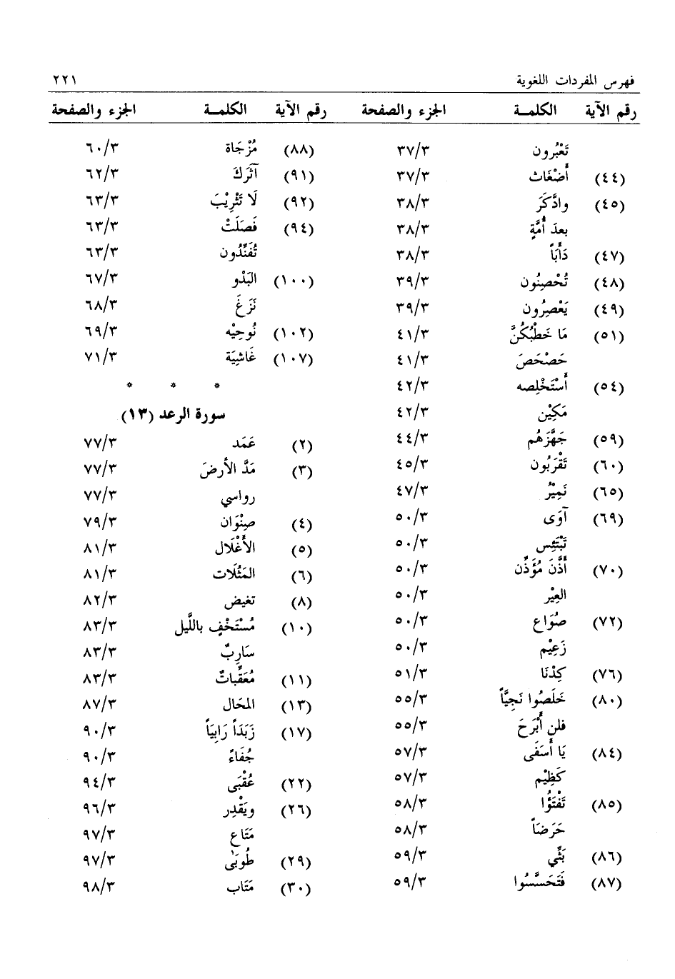 (2) : عمد: 3/ 77 (3) : مدّ الأرض: 3/ 77: رواسي: 3/ 77 (4) : صنوان: 3/ 79 (5) : الأغلال: 3/ 81 (6) : المثلات: 3/ 81 (8) : تغيض: 3/ 82 (10) : مستخف باللّيل: 3/ 83: سارب: 3/ 83 (11) : معقّبات: 3/ 83 (13) : المحال: 3/ 87 (17) : زبدا رابيا: 3/ 90: جفاء: 3/ 90 (22) : عقبى: 3/ 94 (26) : ويقدر: 3/ 96: متاع: 3/ 97 (29) : طوبى: 3/ 97 (30) : متاب: 3/ 98