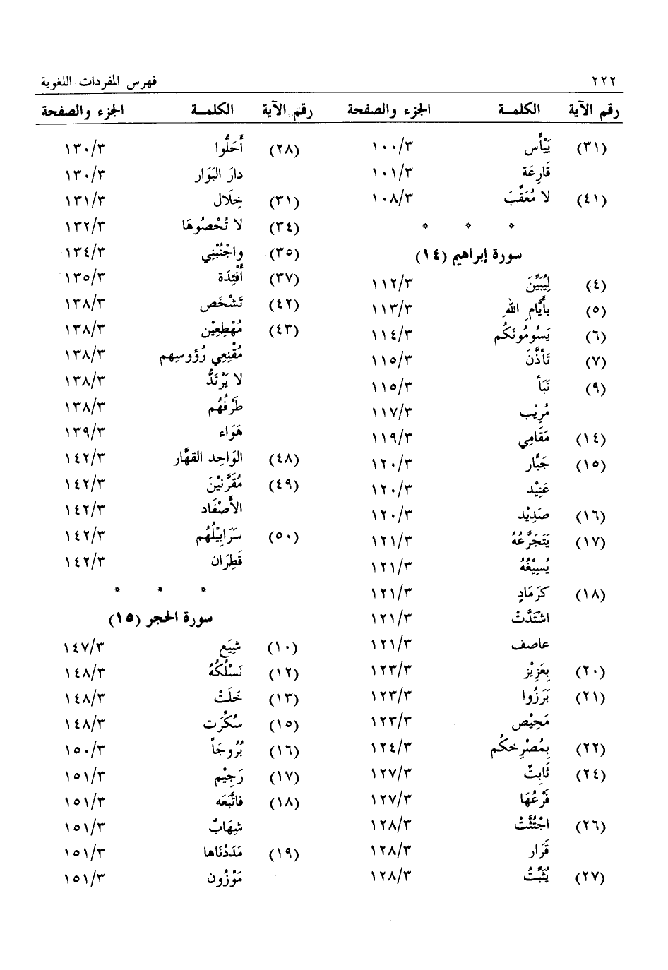 (4) : ليبيّن: 3/ 112 (5) : بأيّام الله: 3/ 113 (6) : يسومونكم: 3/ 114 (7) : تأذّن: 3/ 115 (9) : نبأ: 3/ 115: مريب: 3/ 117 (14) : مقامي: 3/ 119 (15) : جبّار: 3/ 120: عنيد: 3/ 120 (16) : صديد: 3/ 120 (17) : يتجرّعه: 3/ 121: يسيغه: 3/ 121 (18) : كرماد: 3/ 121: اشتدّت: 3/ 121: عاصف: 3/ 121 (20) : بعزيز: 3/ 123 (21) : برزوا: 3/ 123: محيص: 3/ 123 (22) : بمصرخكم: 3/ 124 (24) : ثابت: 3/ 127: فرعها: 3/ 127 (26) : اجتثّت: 3/ 128: قرار: 3/ 128 (27) : يثبّت: 3/ 128 (28) : أحلّوا: 3/ 130: دار البوار: 3/ 130 (31) : خلال: 3/ 131 (34) : لا تحصوها: 3/ 132 (35) : واجنبني: 3/ 134 (37) : أفئدة: 3/ 135 (42) : تشخص: 3/ 138 (43) : مهطعين: 3/ 138: مقنعي رؤوسهم: 3/ 138: لا يرتدّ: 3/ 138: طرفهم: 3/ 138: هواء: 3/ 139 (48) : الواحد القهّار: 3/ 142 (49) : مقرّنين: 3/ 142: الأصفاد: 3/ 142 (50) : سرابيلهم: 3/ 142: قطران: 3/ 142