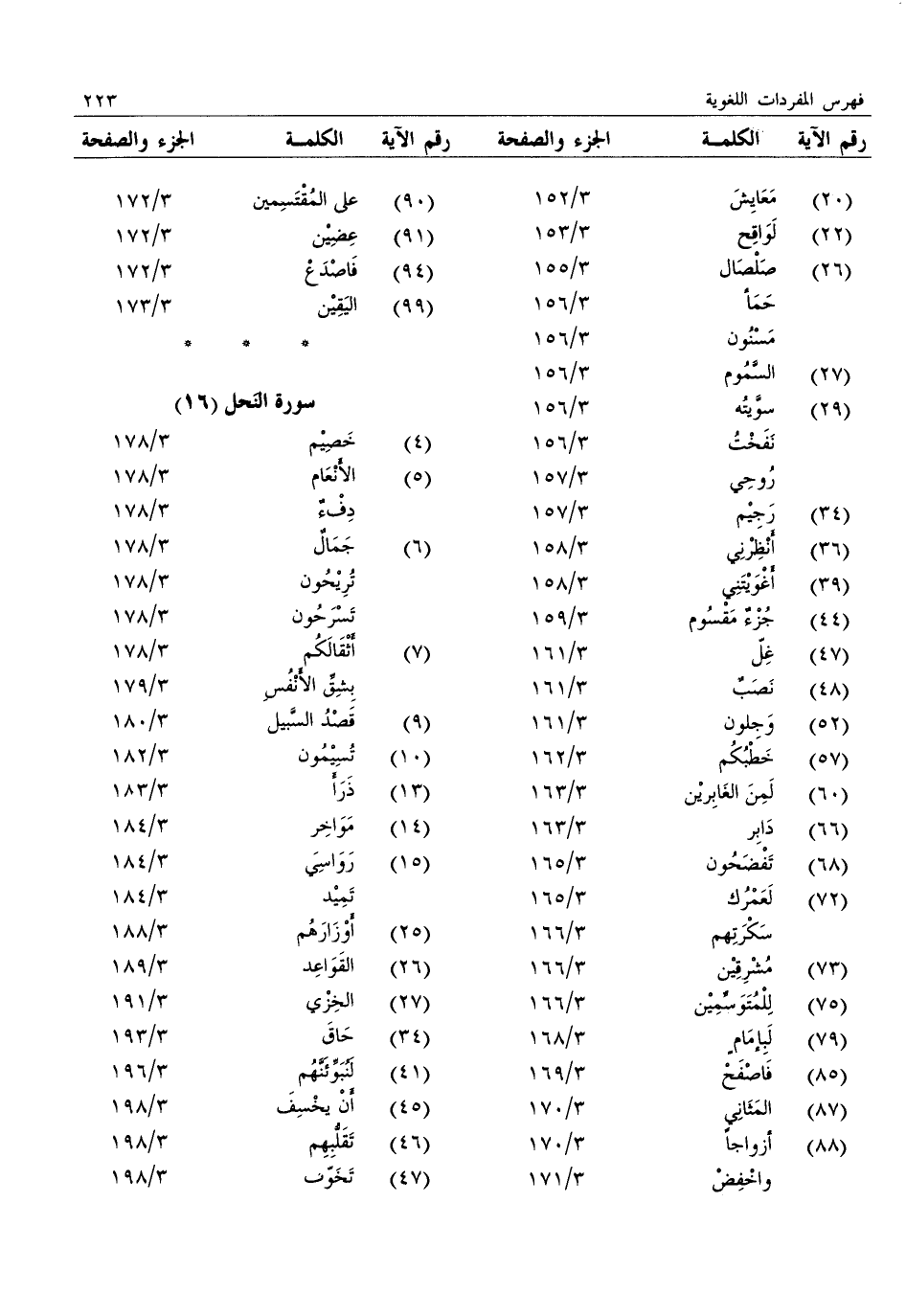(4) : خصيم: 3/ 178 (5) : الأنعام: 3/ 178: دفء: 3/ 178 (6) : جمال: 3/ 178: تريحون: 3/ 178: تسرحون: 3/ 178 (7) : أثقالكم: 3/ 178: بشقّ الأنفس: 3/ 179 (9) : قصد السّبيل: 3/ 180 (10) : تسيمون: 3/ 182 (13) : ذرأ: 3/ 183 (14) : مواخر: 3/ 184 (15) : رواسي: 3/ 184: تميد: 3/ 184 (25) : أوزارهم: 3/ 188 (26) : القواعد: 3/ 189 (27) : الخزي: 3/ 191 (34) : حاق: 3/ 193 (41) : لنبوّئنّهم: 3/ 196 (45) : أن يخسف: 3/ 198 (46) : تقلّبهم: 3/ 198 (47) : تخوّف: 3/ 198