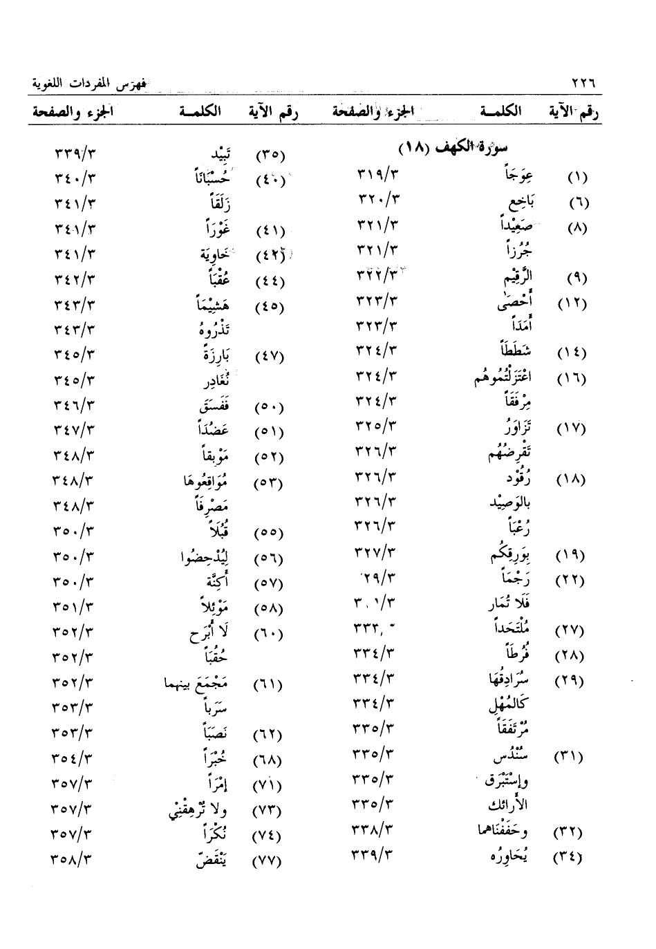 (1) : عوجا: 3/ 319 (6) : باخع: 3/ 320 (8) : صعيدا: 3/ 321: جرزا: 3/ 321 (9) : الرّقيم: 3/ 322 (12) : أحصى: 3/ 323: أمدا: 3/ 323 (14) : شططا: 3/ 324 (16) : اعتزلتموهم: 3/ 324: مرفقا: 3/ 324 (17) : تزاور: 3/ 325: تقرضهم: 3/ 326 (18) : رقود: 3/ 326: بالوصيد: 3/ 326: رعبا: 3/ 326 (19) : بورقكم: 3/ 327 (22) : رجما: 3/ 329: فلا تمار: 3/ 329 (27) : ملتحدا: 3/ 333 (28) : فرطا: 3/ 334 (29) : سرادقها: 3/ 334: كالمهل: 3/ 334: مرتفقا: 3/ 335 (31) : سندس: 3/ 335: وإستبرق: 3/ 335: الأرائك: 3/ 335 (32) : وحففناهما: 3/ 338 (34) : يحاوره: 3/ 339 (35) : تبيد: 3/ 339 (40) : حسبانا: 3/ 340: زلقا: 3/ 341 (41) : غورا: 3/ 341 (42) : خاوية: 3/ 341 (44) : عقبا: 3/ 342 (45) : هشيما: 3/ 343: تذروه: 3/ 343 (47) : بارزة: 3/ 345: نغادر: 3/ 345 (50) : ففسق: 3/ 346 (51) : عضدا: 3/ 347 (52) : موبقا: 3/ 348 (53) : مواقعوها: 3/ 348: مصرفا: 3/ 348 (55) : قبلا: 3/ 350 (56) : ليدحضوا: 3/ 350 (57) : أكنّة: 3/ 350 (58) : موئلا: 3/ 351 (60) : لا أبرح: 3/ 352: حقبا: 3/ 352 (61) : مجمع بينهما: 3/ 352: سربا: 3/ 353 (62) : نصبا: 3/ 353 (68) : خبرا: 3/ 354 (71) : إمرا: 3/ 357 (73) : ولا ترهقني: 3/ 357 (74) : نكرا: 3/ 357 (77) : ينقضّ: 3/ 358