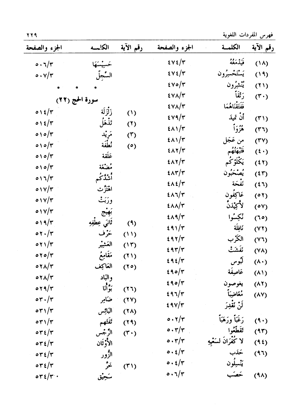 (1) : زلزلة: 3/ 514 (2) : تذهل: 3/ 514 (3) : مريد: 3/ 515 (5) : نطفة: 3/ 515: علقة: 3/ 515: مضغة: 3/ 515: أشدّكم: 3/ 516: اهتزّت: 3/ 517: وربت: 3/ 517: بهيج: 3/ 517 (9) : ثاني عطفه: 3/ 519 (11) : حرف: 3/ 520 (13) : العشير: 3/ 521 (21) : مقامع: 3/ 525 (25) : العاكف: 3/ 528: والباد: 3/ 528 (26) : بوّأنا: 3/ 529 (27) : ضامر: 3/ 530 (28) : البائس: 3/ 531 (29) : تفثهم: 3/ 531 (30) : الرّجس: 3/ 534: الأوثان: 3/ 534: الزّور: 3/ 534 (31) : خرّ: 3/ 534: سحيق: 3/ 534